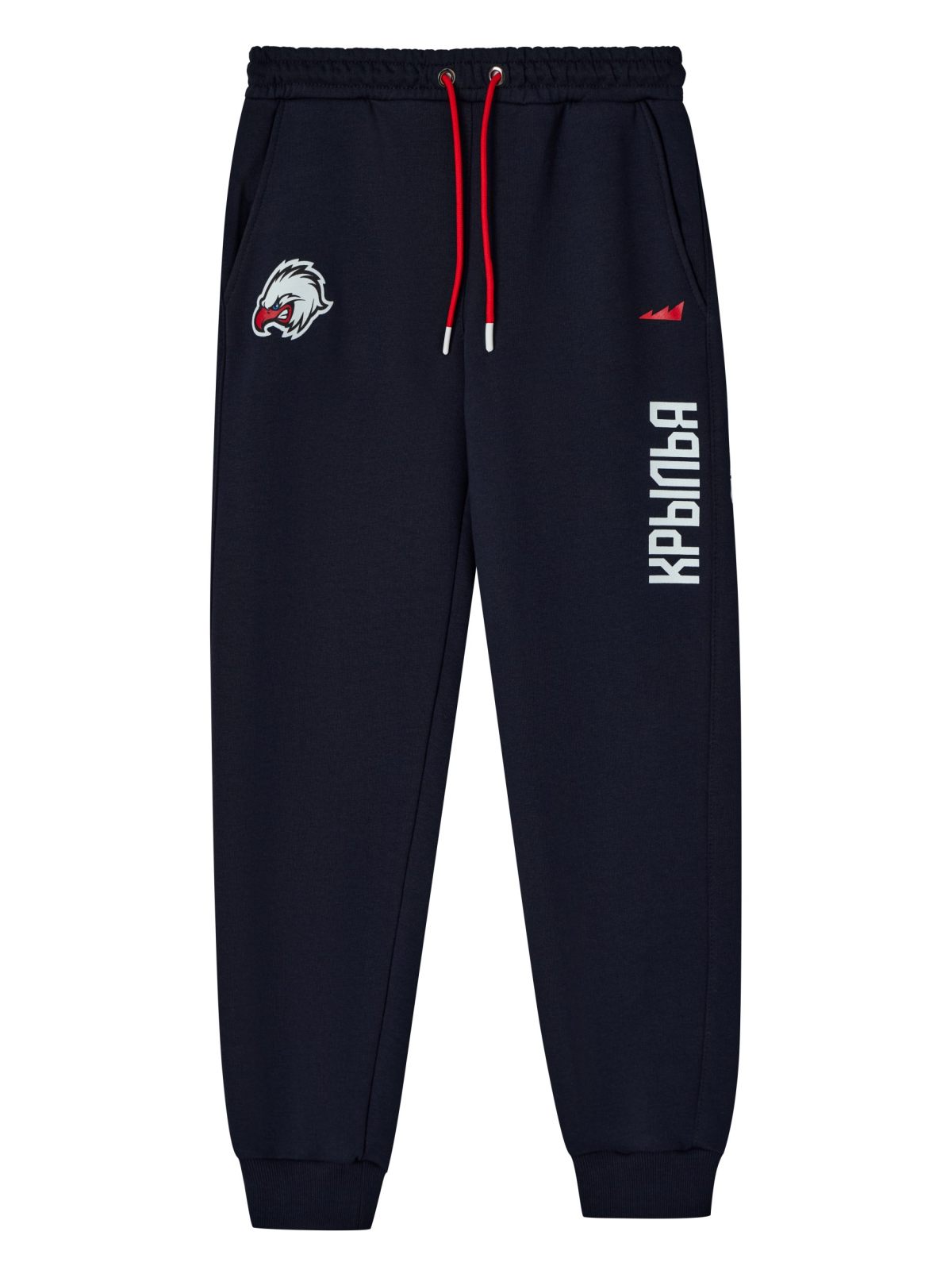 Детские брюки на манжетах прямого силуэта Regular лимитированной коллекции "Крылья Советов". Выполнены из материала, в составе которого 85% хлопка и 15% полиэстера, что обеспечивает отличную посадку и долговечность изделия. Эластичный контрастный шнур в поясе помогает регулировать посадку. На правой ноге расположен стильный принт - эмблема легендарного хоккейного клуба, на левой - принт-логотип и надпись-акцент. Модель представлена в базовом темно-синем цвете. Качество и стиль для настоящих фанатов!