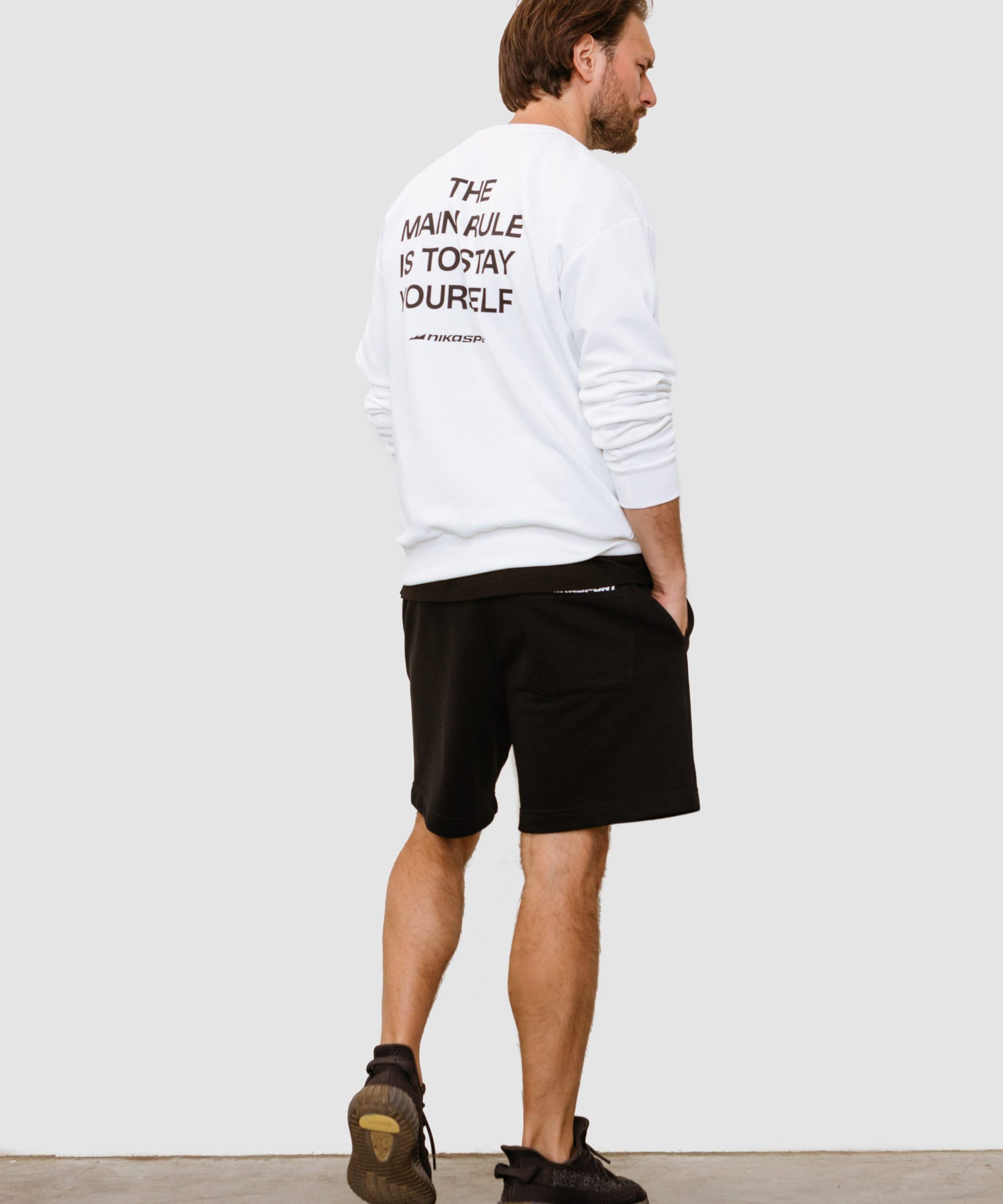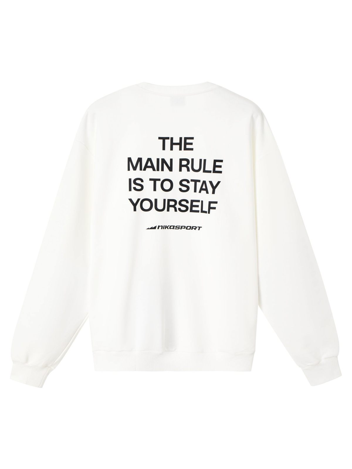 Мужской свитшот свободного силуэта. Выполнен из материала, в составе которого 70% хлопка и 30% полиэстера, что обеспечивает отличную посадку и долговечность изделия. Спущенная линия плеча и стильная надпись-принт на спине делают свитшот заметным и молодежным. Удобный карман-кенгуру не только часть дизайна, но и удобный помощник для хранения личных вещей. Представлен в классическом белом цвете. Прекрасное дополнение как к спортивному, так и к повседневному образу