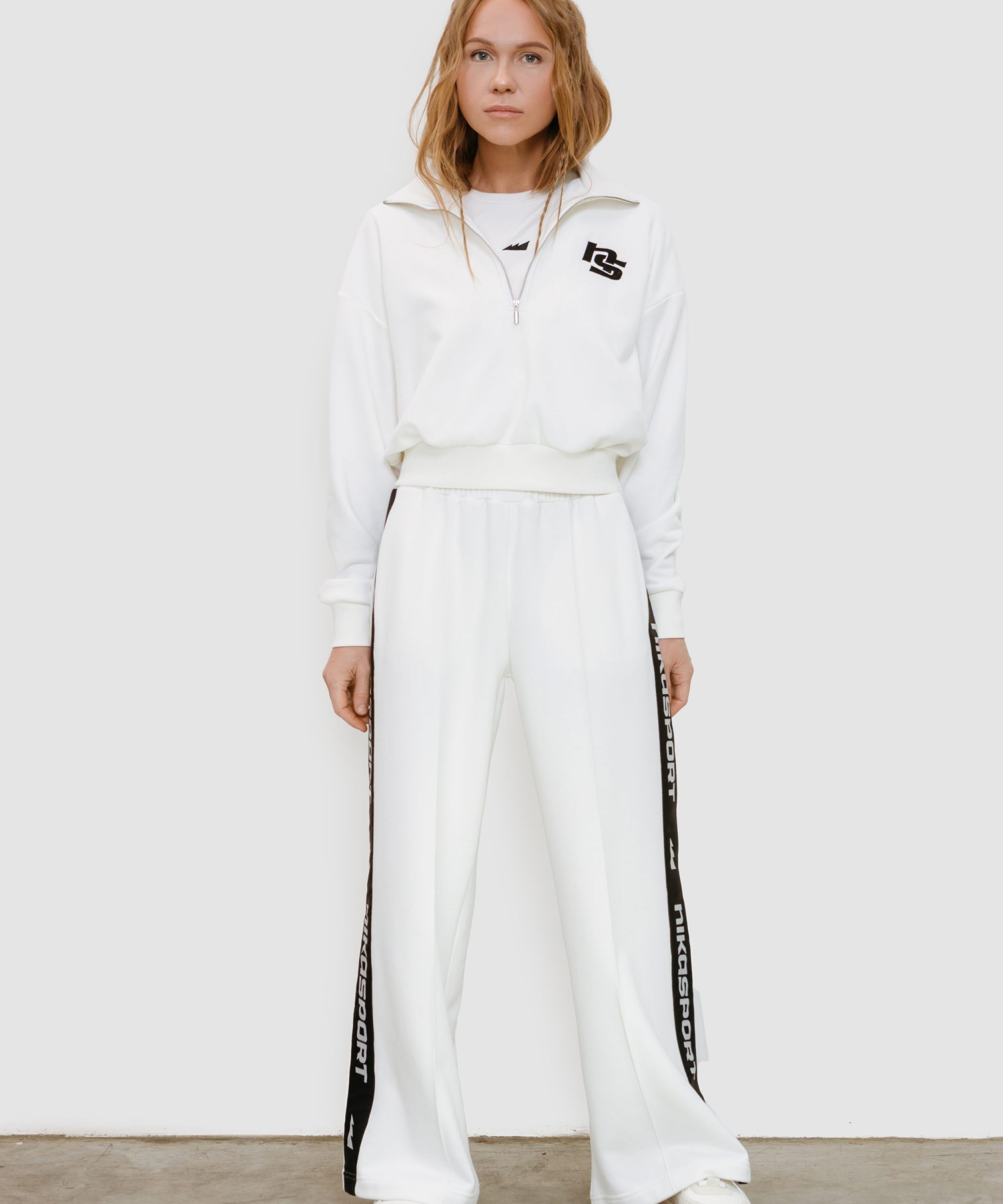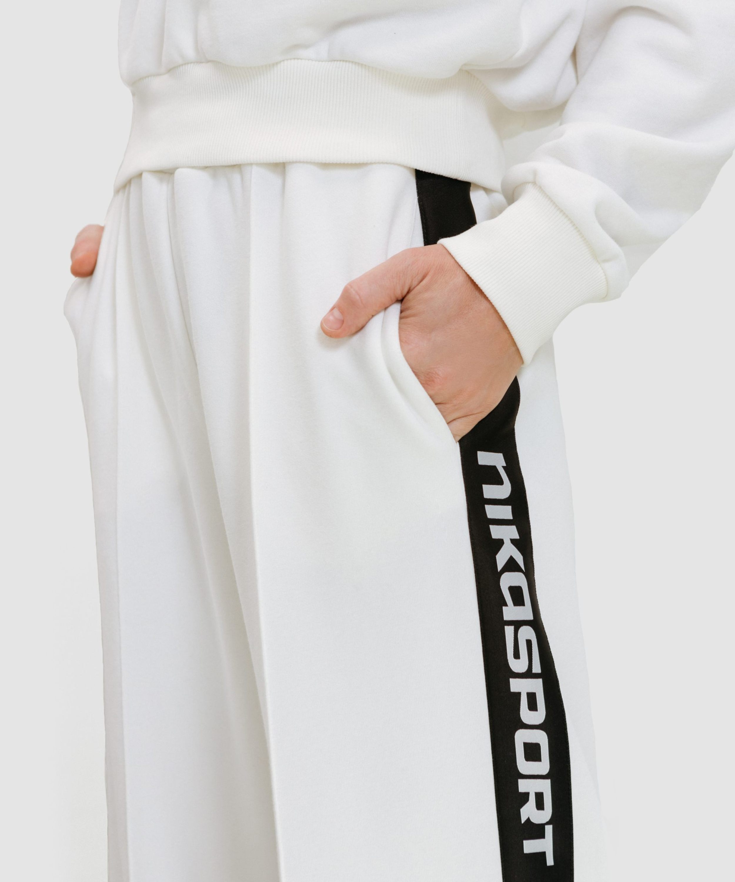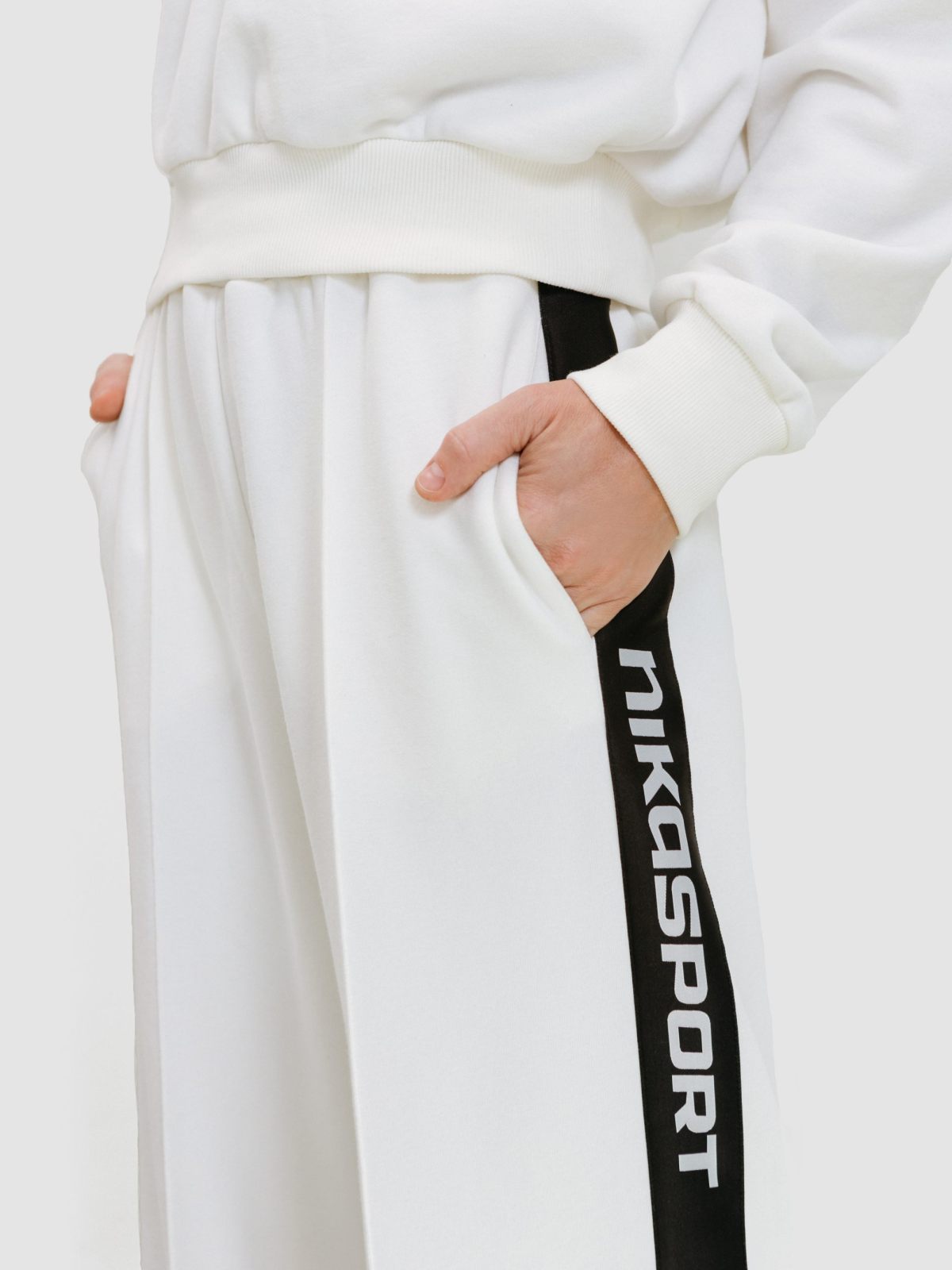 Женские прямые широкие брюки выполнены из материала, в составе которого 70% хлопка и 30% полиэстера, что обеспечивает отличную посадку и долговечность изделия. Представлены в классическом черном и белом цветах. Свободный крой, широкая эластичная резинка на поясе, стильные прострочки и лампасы с принтами-логотипами компании - все это прекрасно подходит для создания стильного спортивного или повседневного образа.
