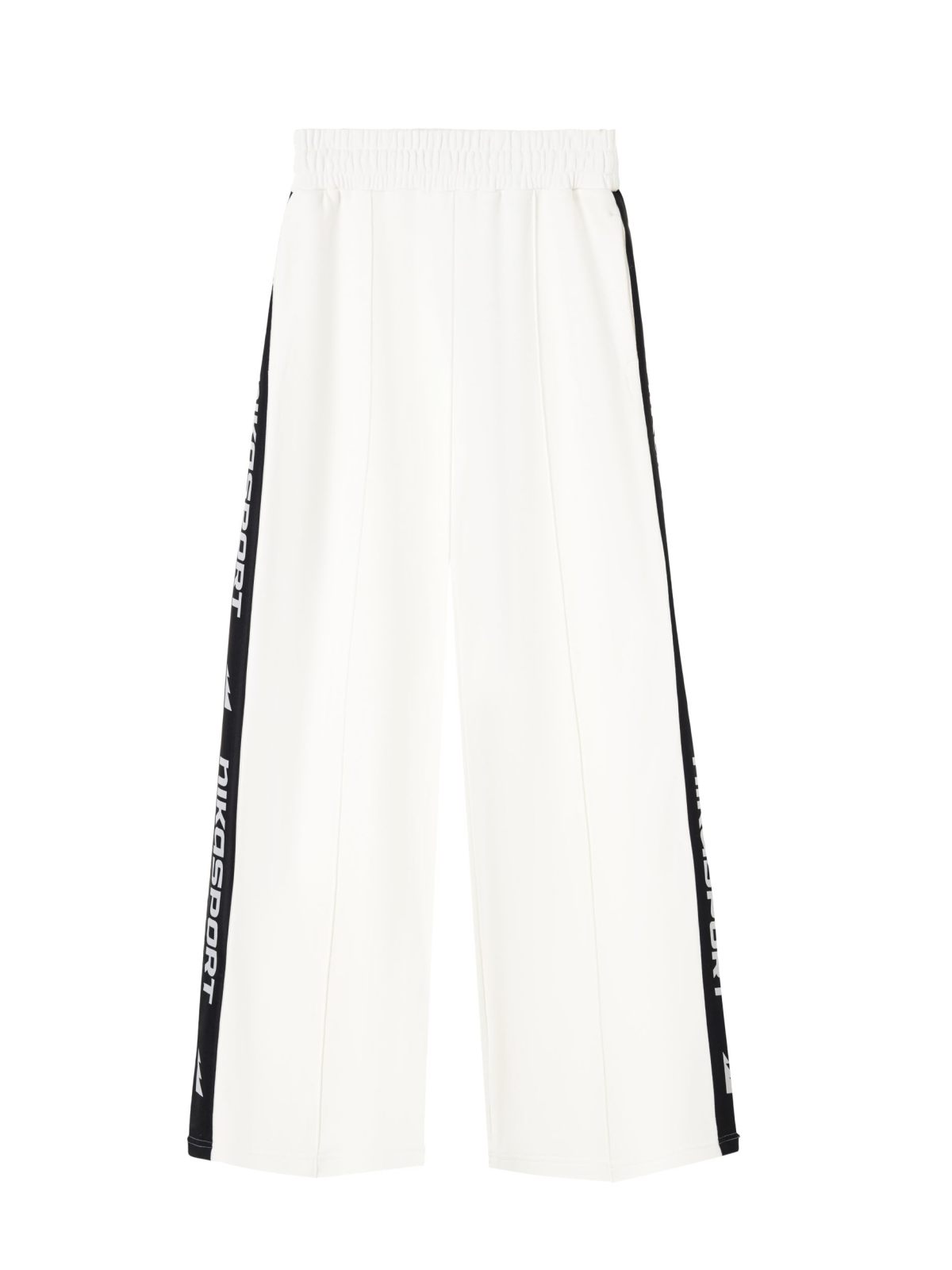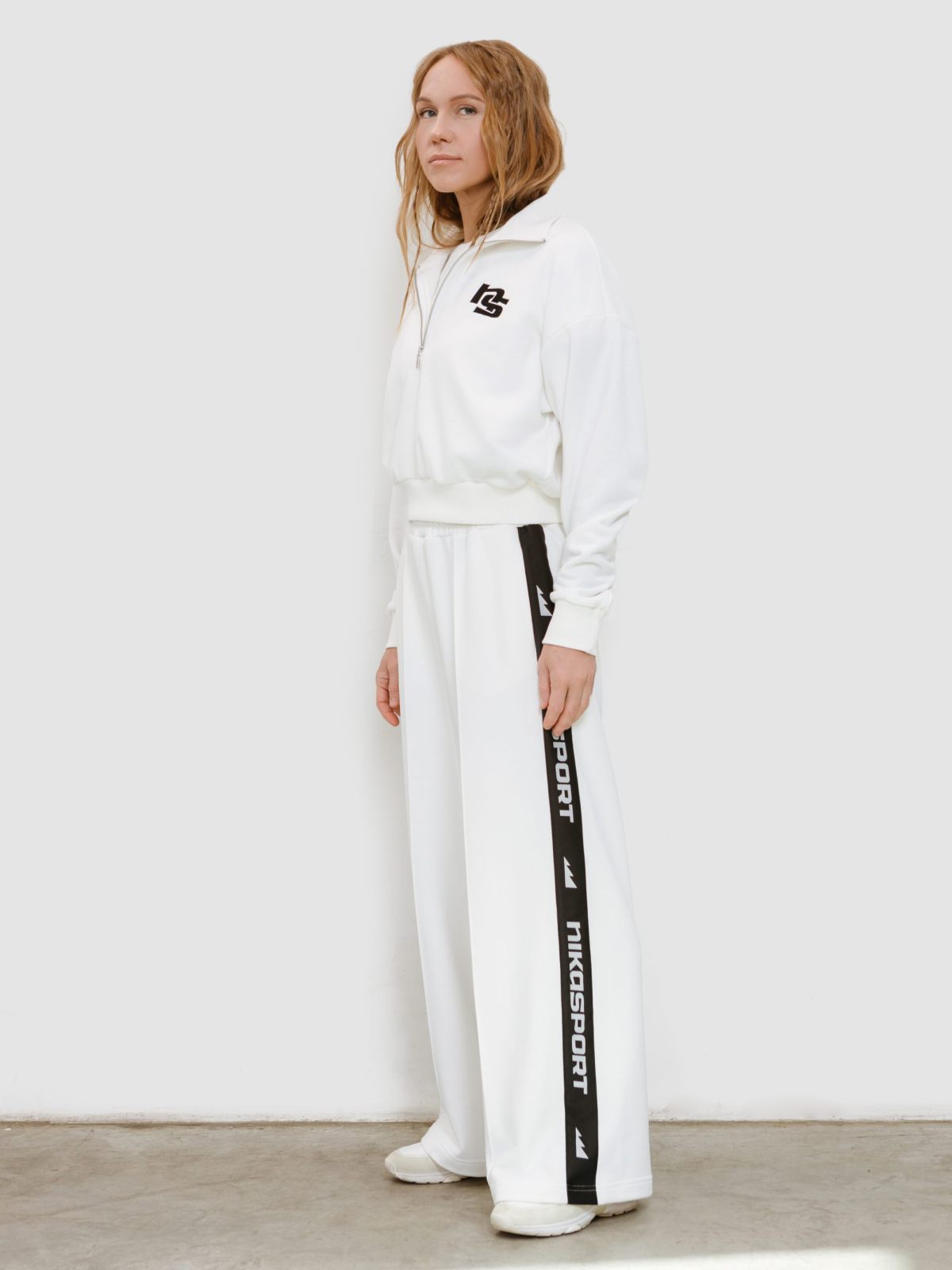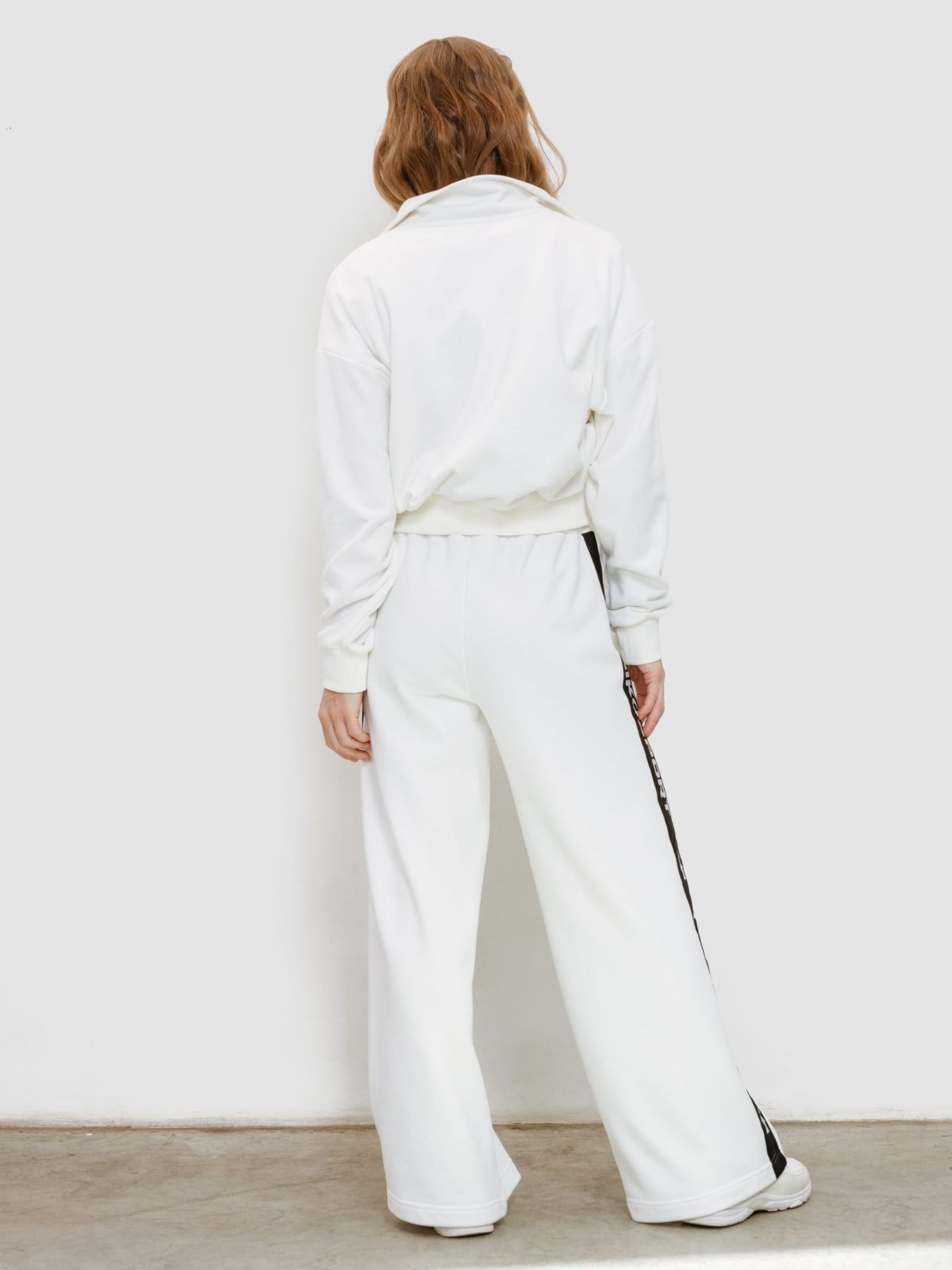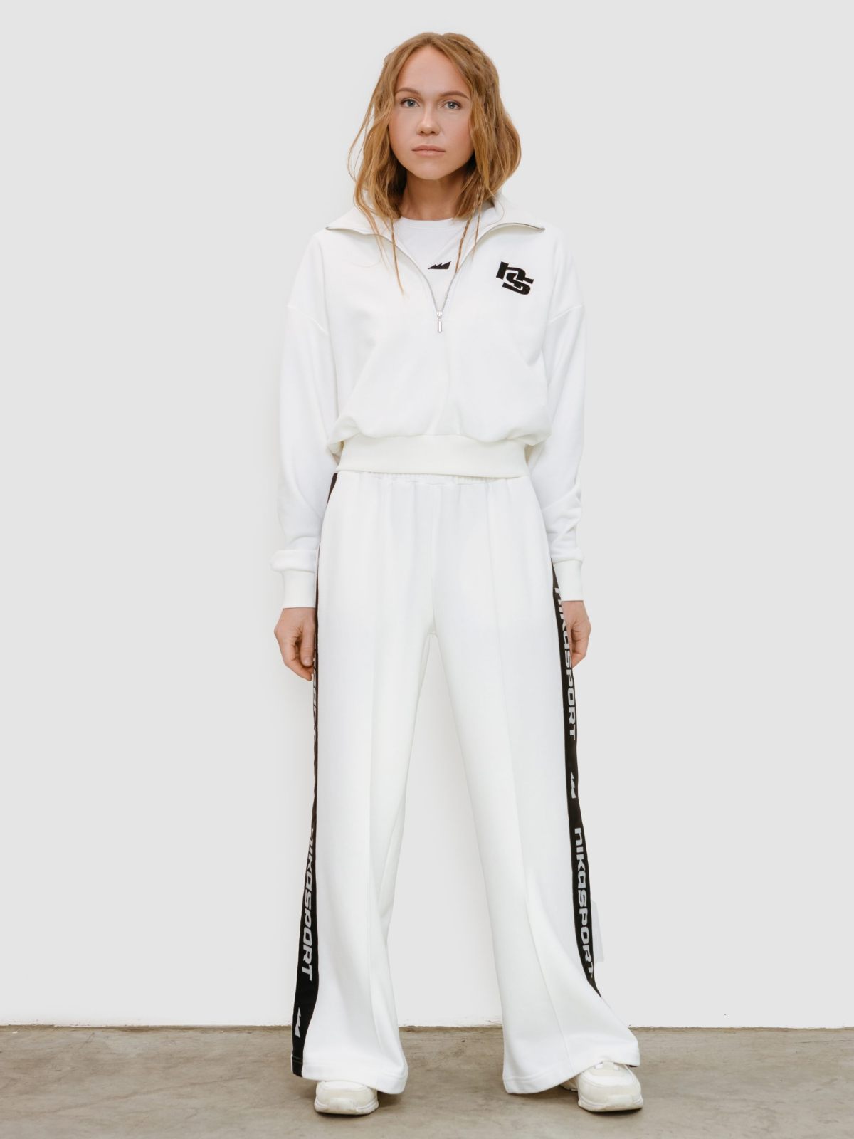 Женские прямые широкие брюки выполнены из материала, в составе которого 70% хлопка и 30% полиэстера, что обеспечивает отличную посадку и долговечность изделия. Представлены в классическом черном и белом цветах. Свободный крой, широкая эластичная резинка на поясе, стильные прострочки и лампасы с принтами-логотипами компании - все это прекрасно подходит для создания стильного спортивного или повседневного образа.