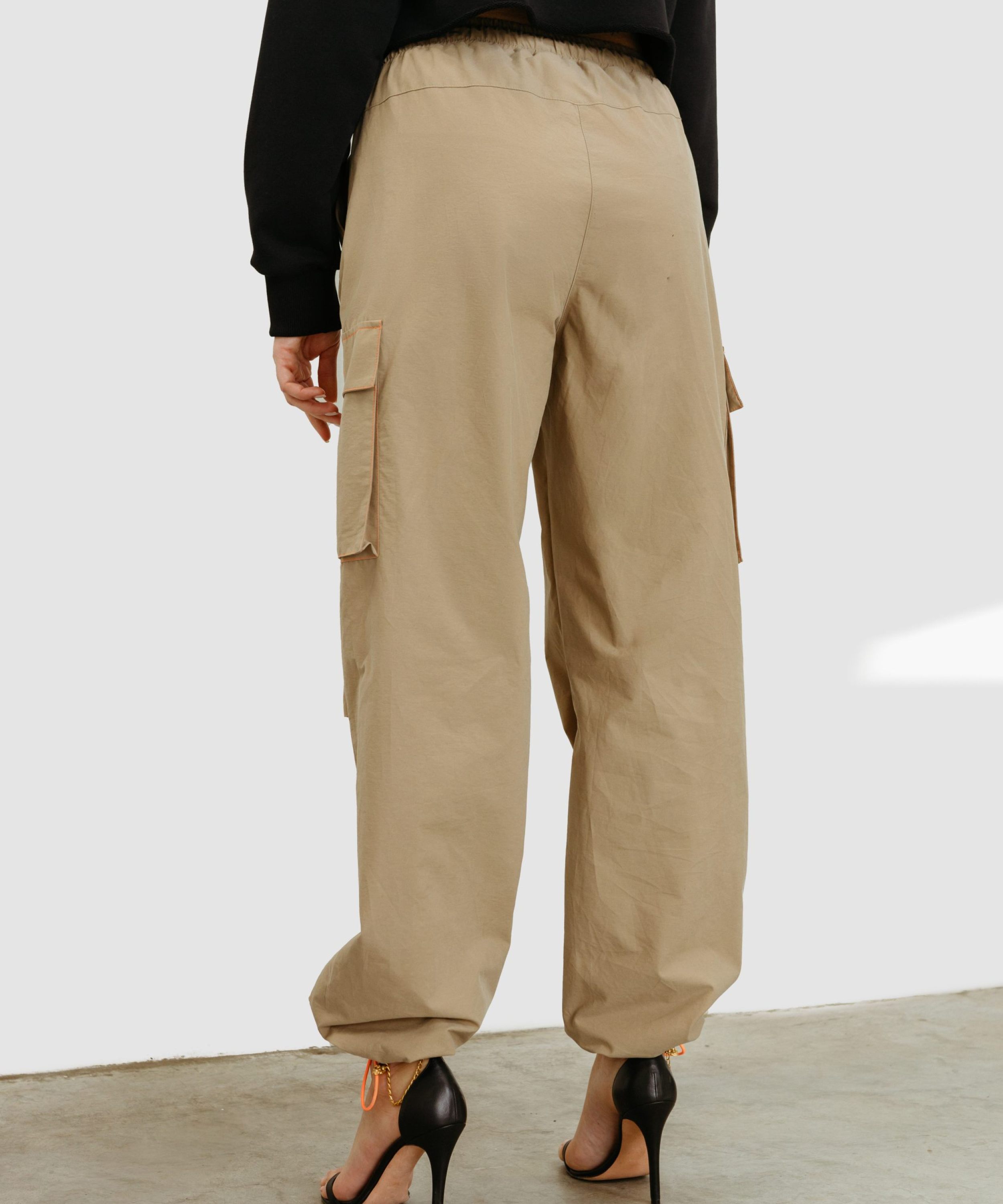 Женские карго-брюки трендового силуэта Loose выполнены из материала, в составе которого 70% хлопка и 30% нейлона. Контрастные и функциональные утяжки-резинки в поясе и на штанах помогают регулировать посадку. Представлены в бежевом и белом цветах. Два больших боковых кармана-портфель, яркий дизайнерский лого-принт на левой ноге, легкий и приятный к телу материал позволяют создавать удобные и стильные образы.