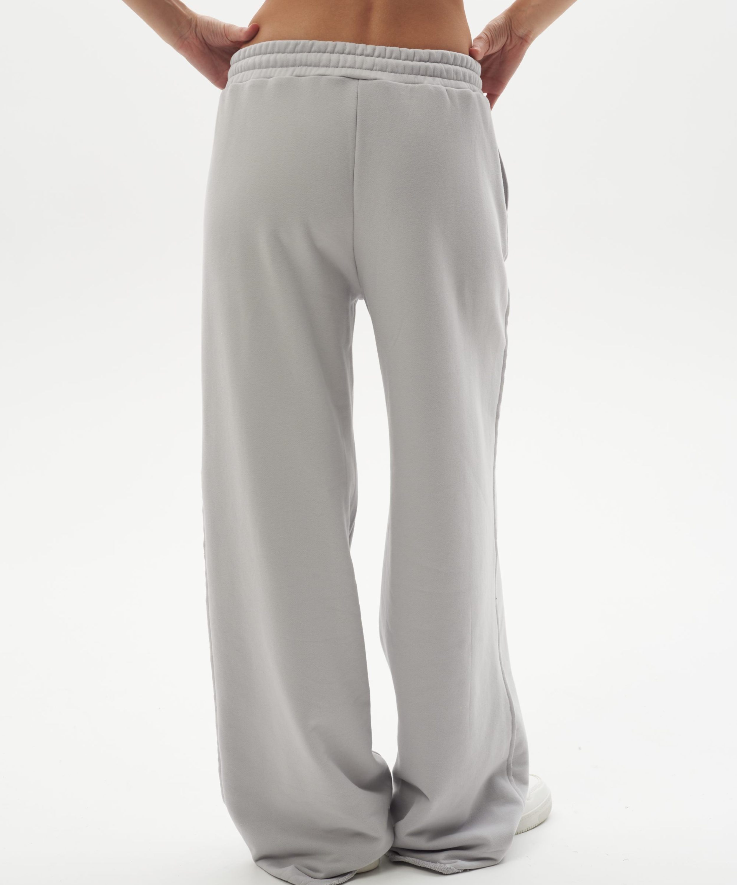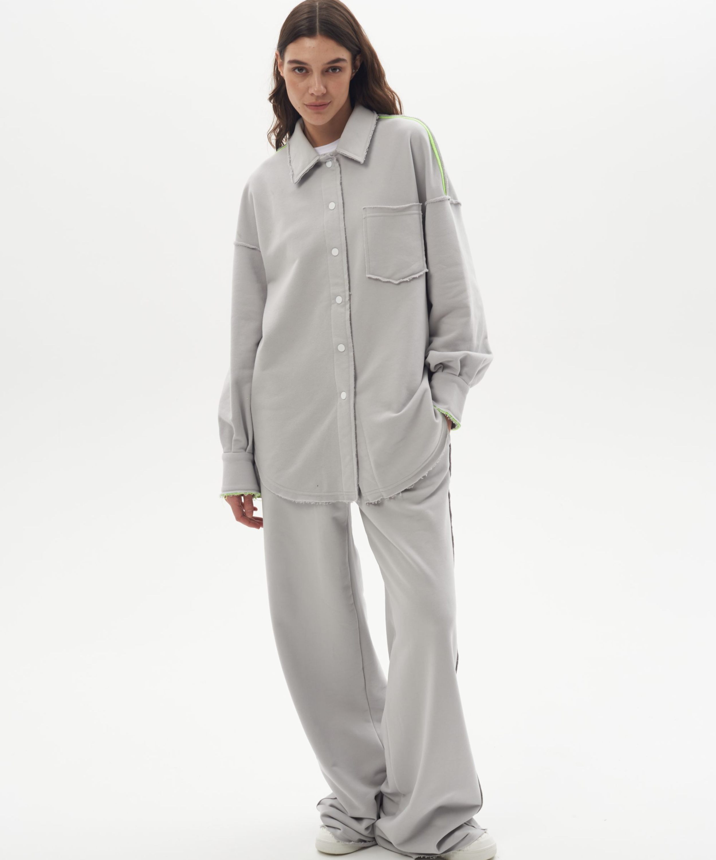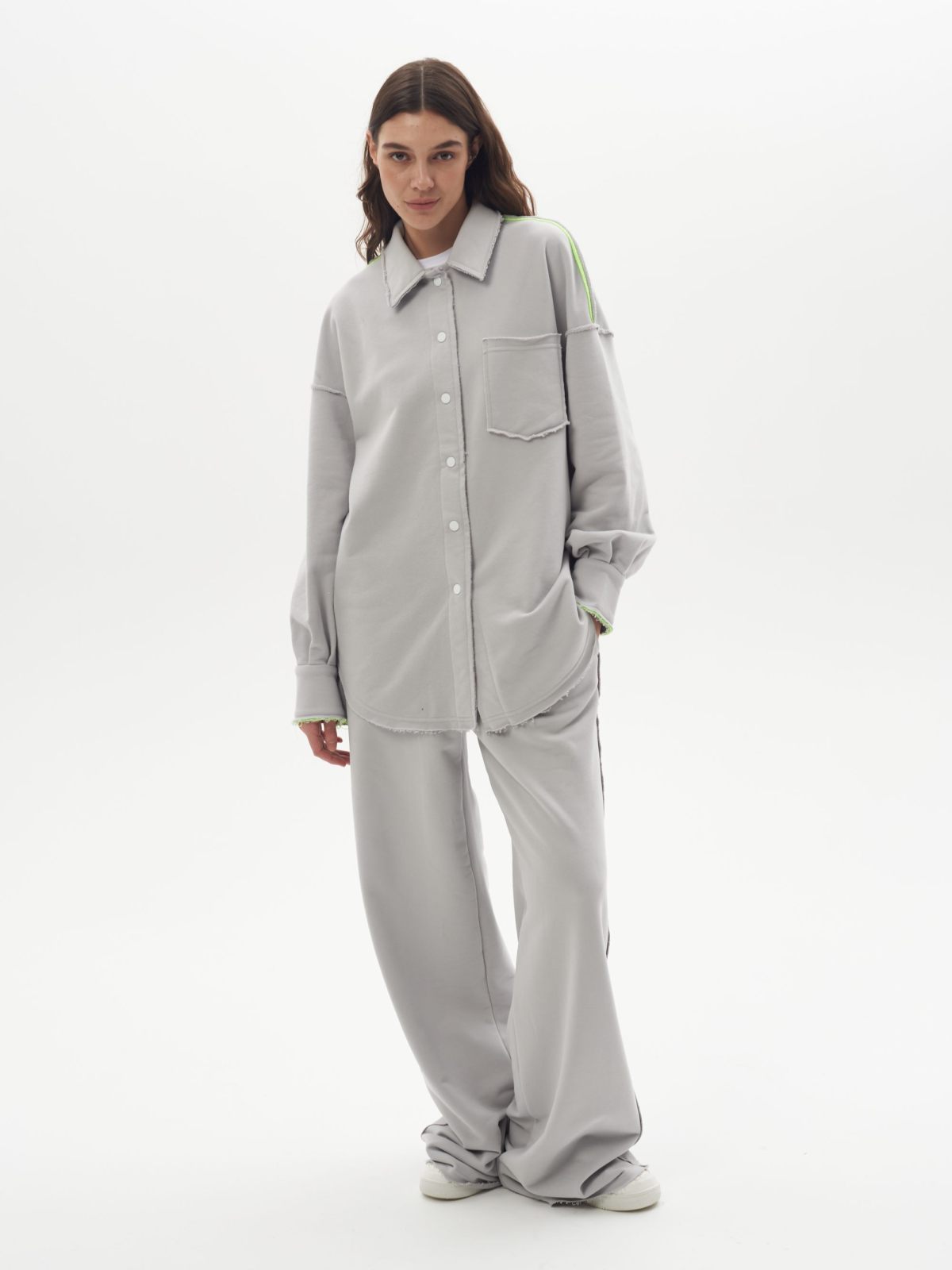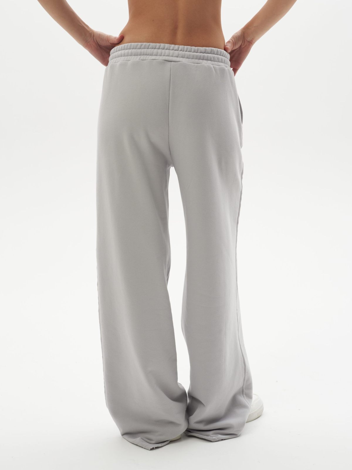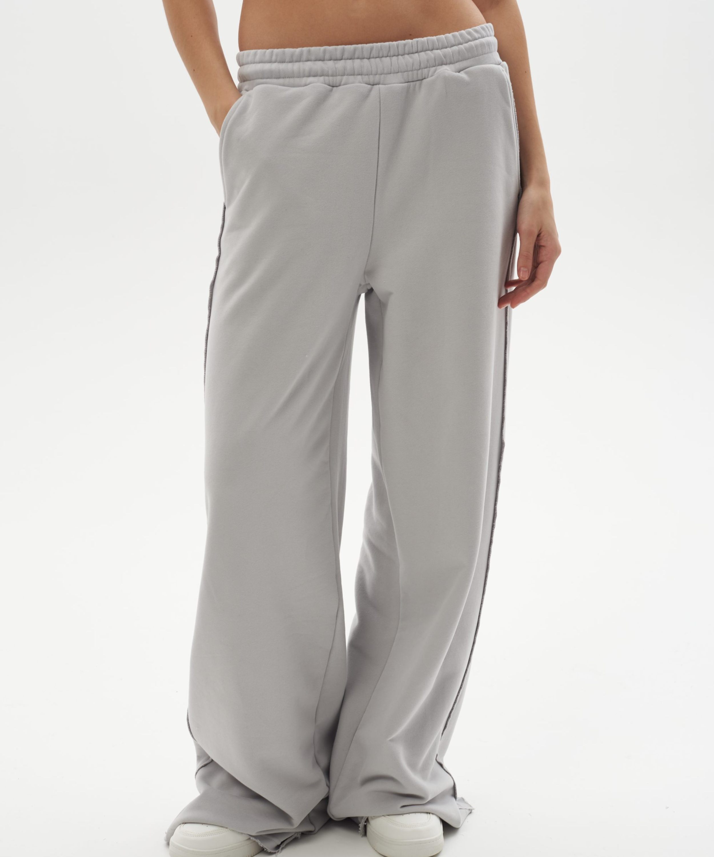 Прямые широкие брюки oversize силуэта выполнены из плотного хлопка с бархатистым эффектом. Брюки имеют боковые карманы и необработанные края, которые подчеркивают расслабленный дизайн брюк. Посадка брюк – средняя, брюки имеют отсроченный пояс с эластичной резинкой внутри и шнуром.
