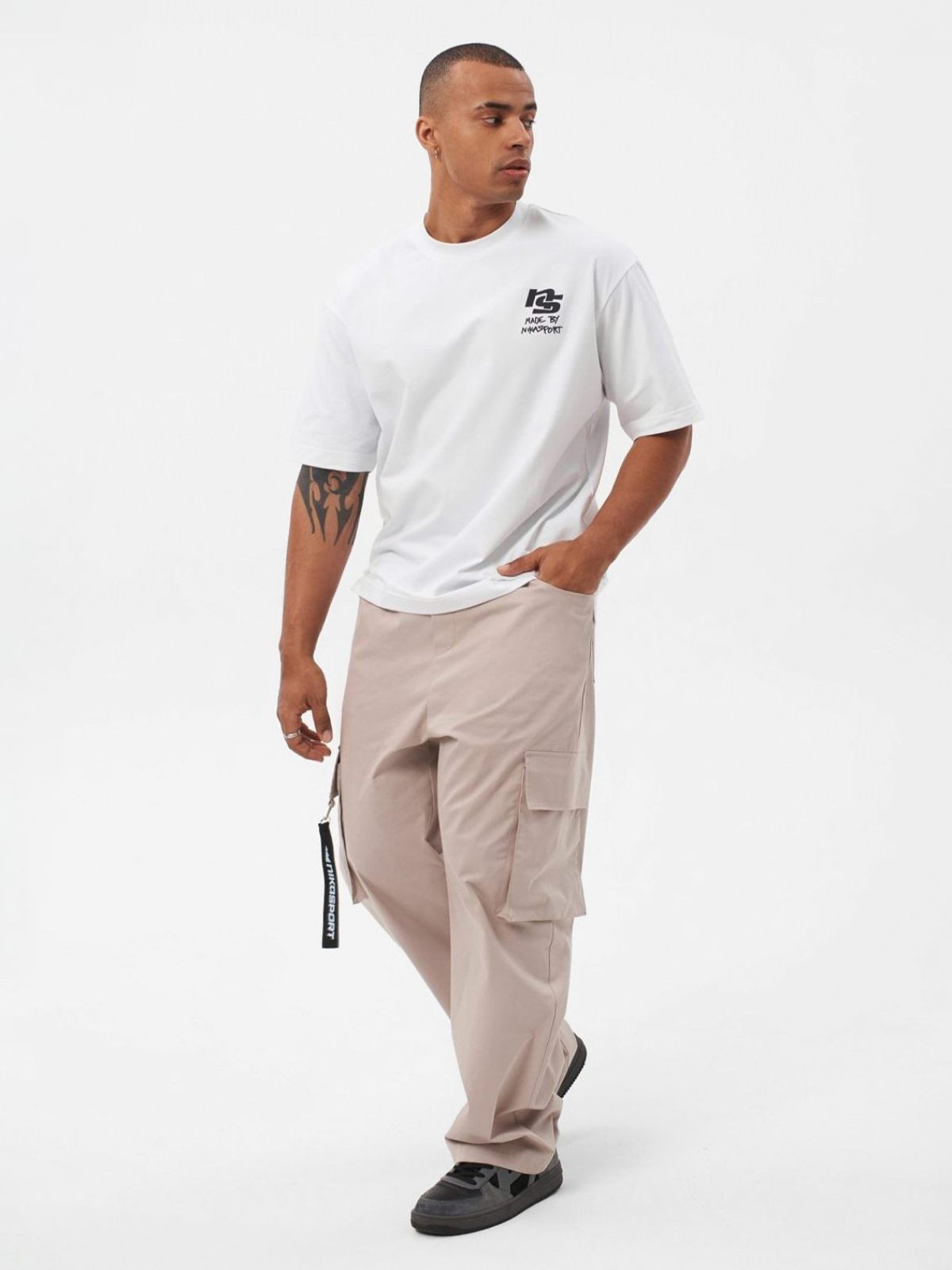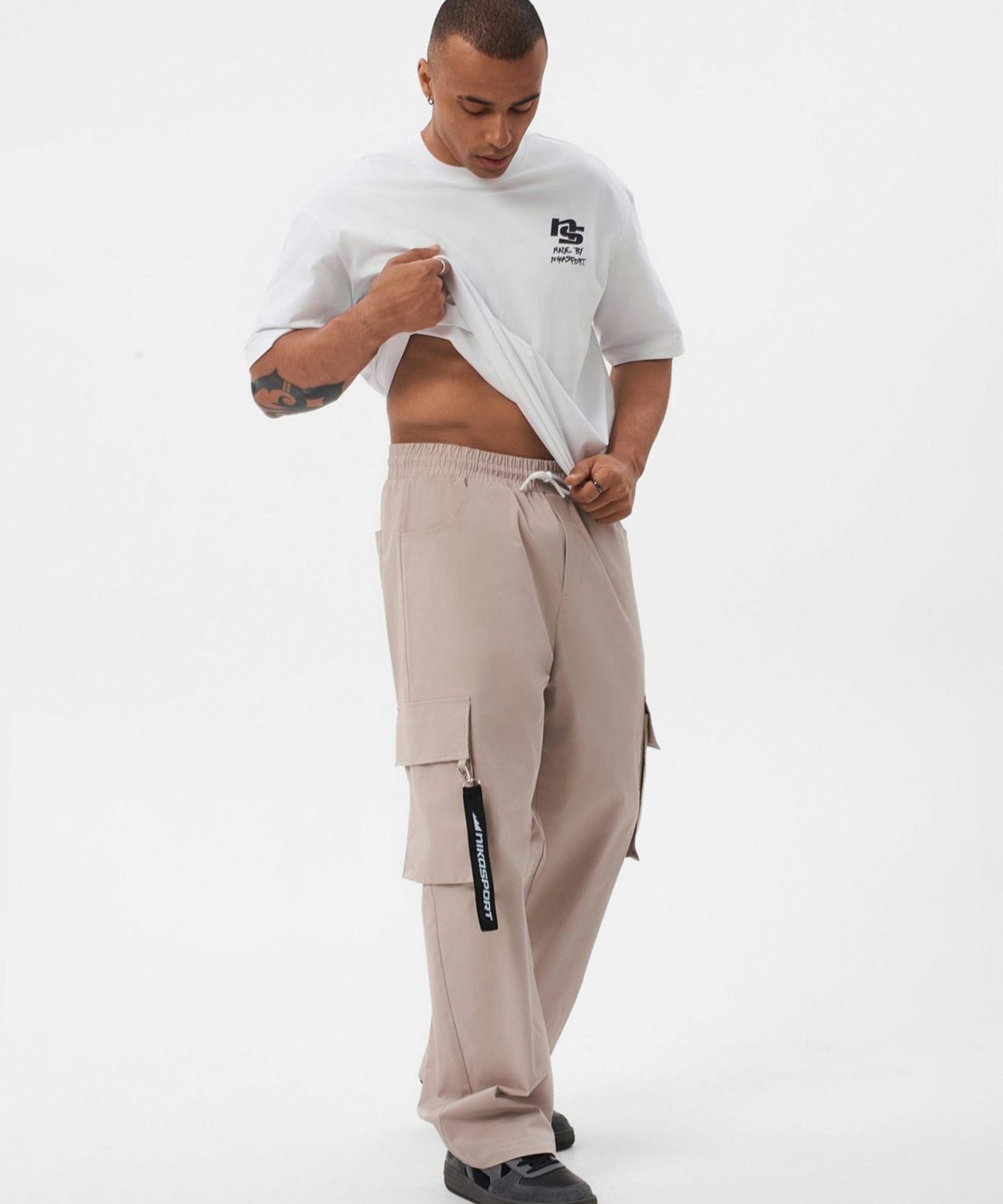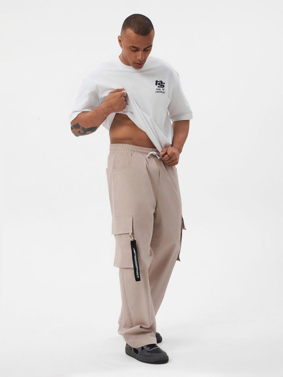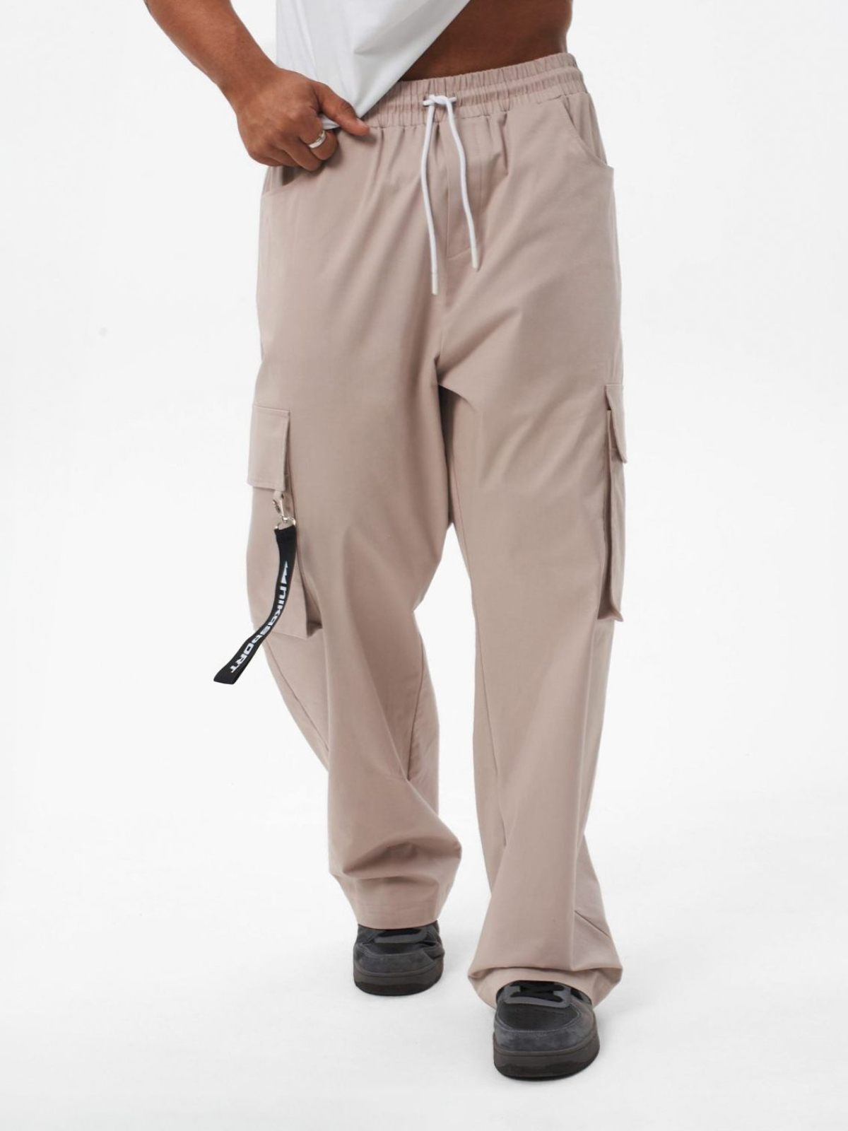 Мужские карго-брюки трендового силуэта oversize выполнены из материала "твил", в составе которого 97% хлопка и 3% эластана. Имеют свободный крой, четыре классических и два больших боковых кармана-портфель с клапанами. Эластичный шнур в поясе помогает регулировать посадку. На правом кармане расположена петля для карабина. Брюки выполнены в двух цветах: светло-бежевый и черный. Легкий и приятный к телу материал брюк, трендовый силуэт и нейтральные цвета позволяют создавать классные образы в спортивном стиле на весну/лето.