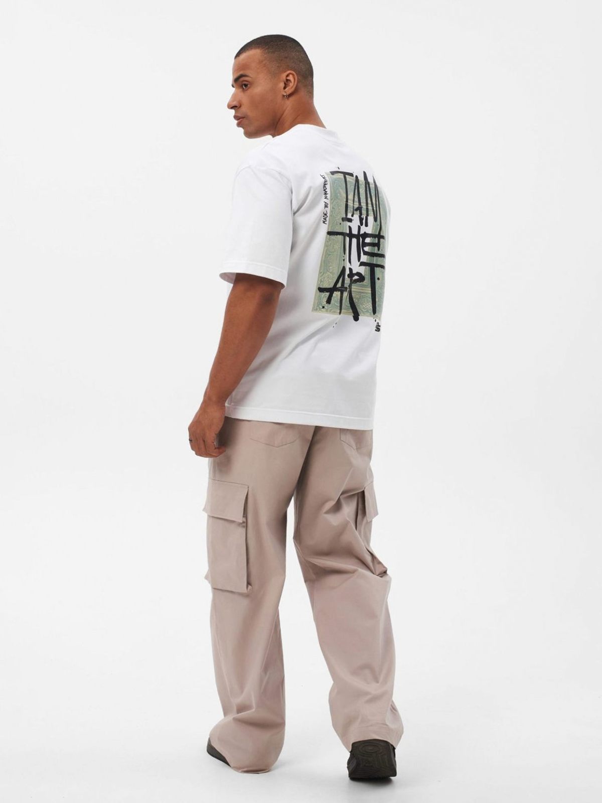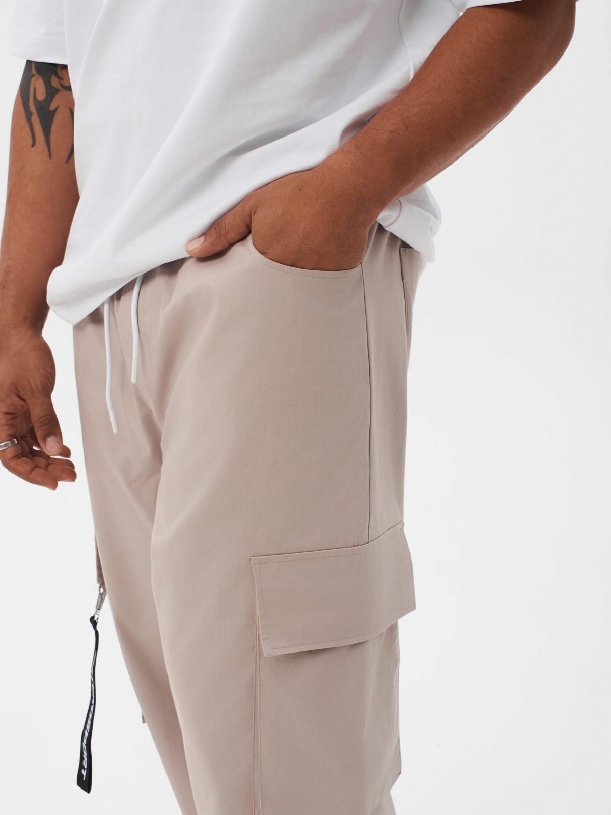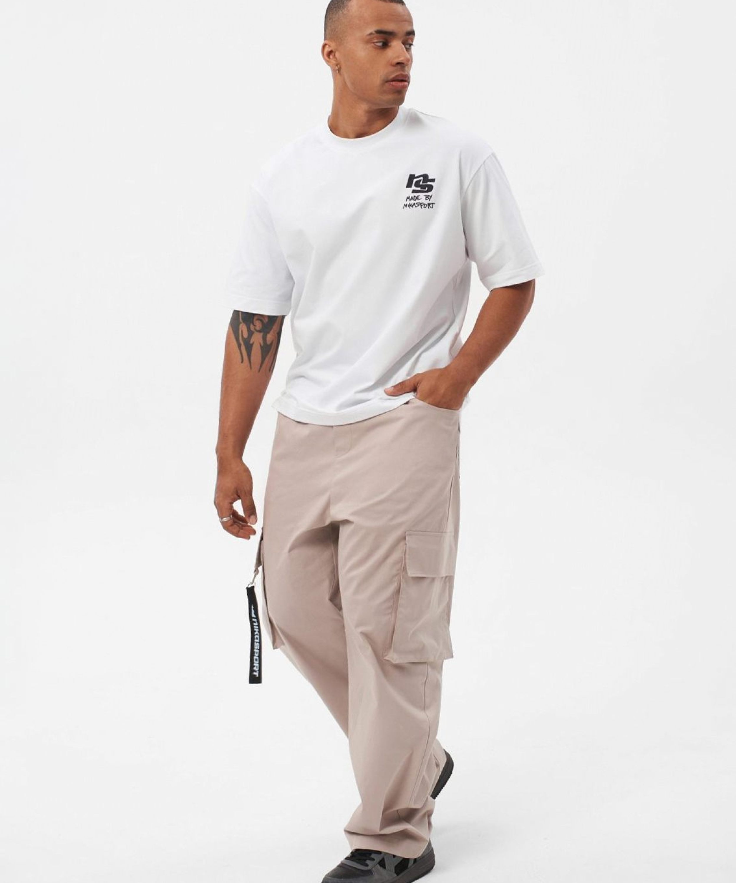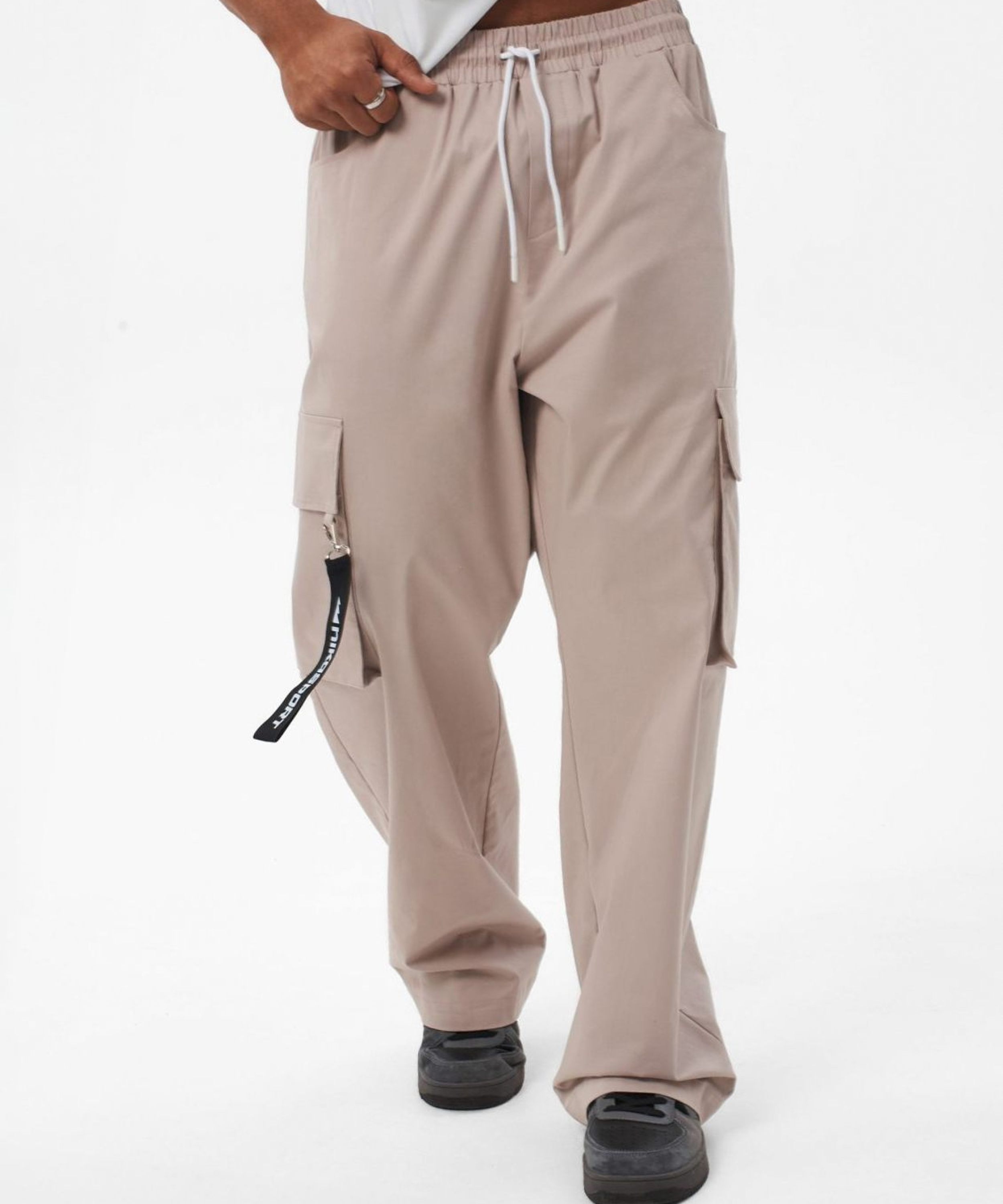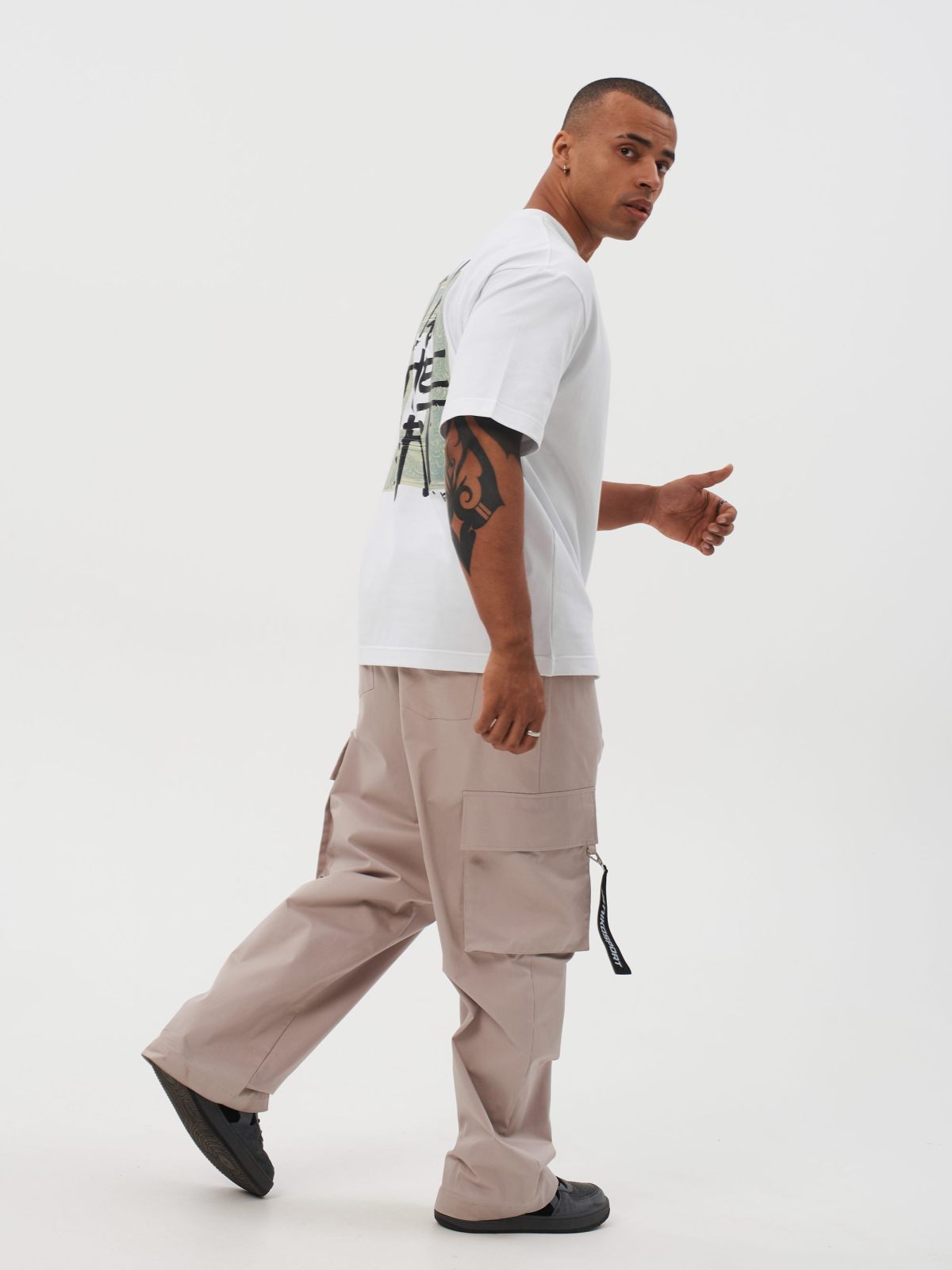 Мужские карго-брюки трендового силуэта oversize выполнены из материала "твил", в составе которого 97% хлопка и 3% эластана. Имеют свободный крой, четыре классических и два больших боковых кармана-портфель с клапанами. Эластичный шнур в поясе помогает регулировать посадку. На правом кармане расположена петля для карабина. Брюки выполнены в двух цветах: светло-бежевый и черный. Легкий и приятный к телу материал брюк, трендовый силуэт и нейтральные цвета позволяют создавать классные образы в спортивном стиле на весну/лето.