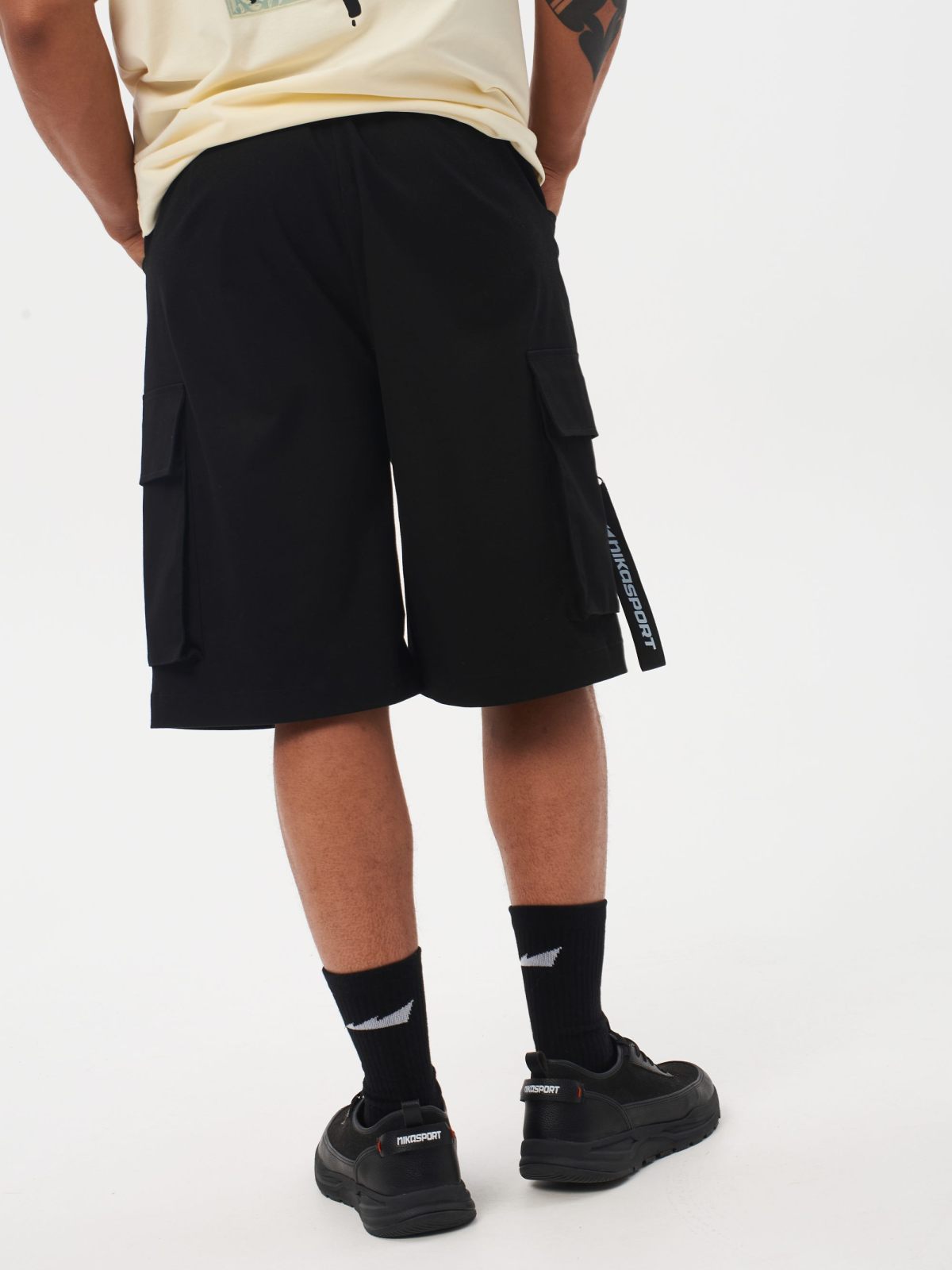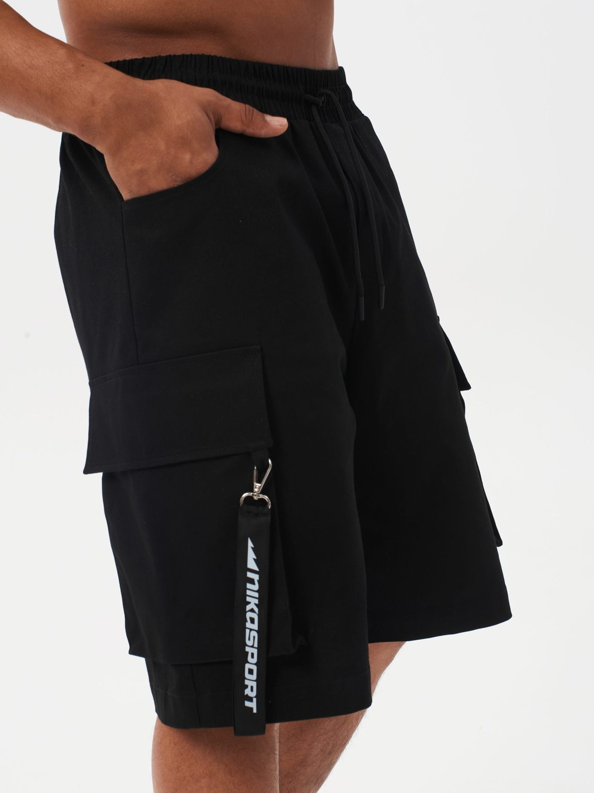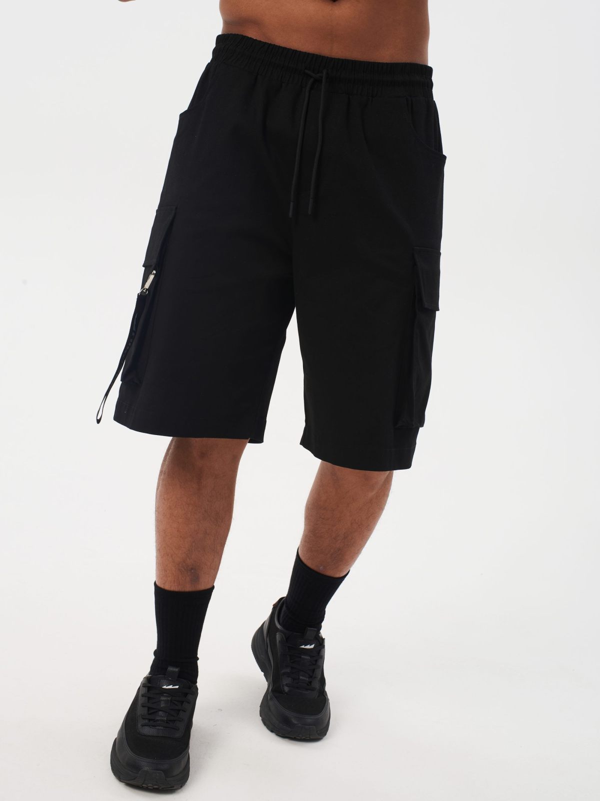 Оверсайз карго-шорты мужские трендового силуэта выполнены из материала "твил", в составе которого 97% хлопка и 3% эластана. Посадка шорт - средняя. Шорты имеют свободный крой, два набедренных кармана и два больших боковых кармана-портфель с клапанами. На правом кармане расположена петля для карабина. Эластичный шнур в поясе помогает регулировать посадку. Шорты выполнены в двух цветах: светло-бежевый и черный. Легкий и приятный к телу материал шорт, трендовый силуэт и нейтральные цвета позволяют создавать классные образы в спортивном стиле на весну/лето.