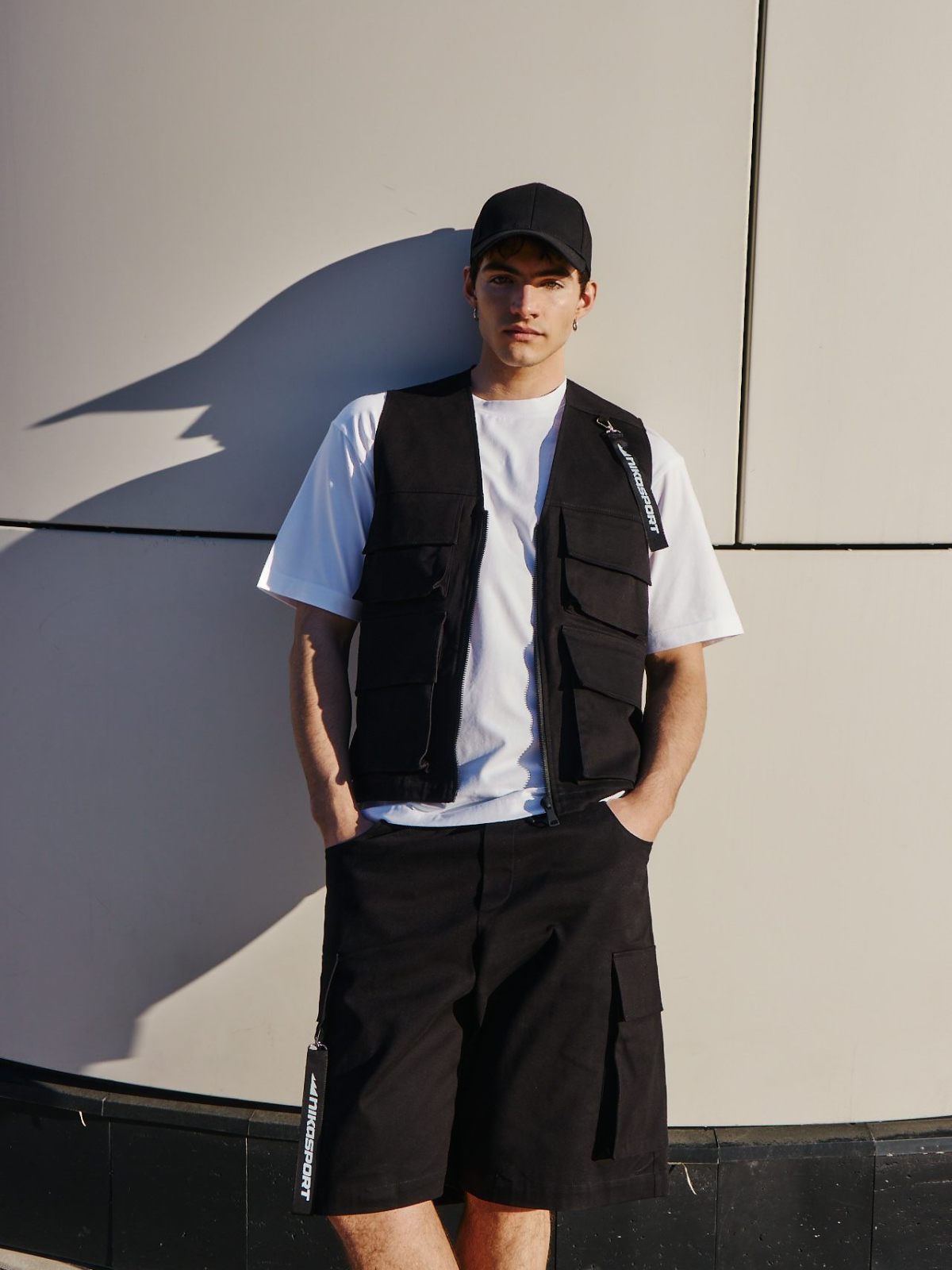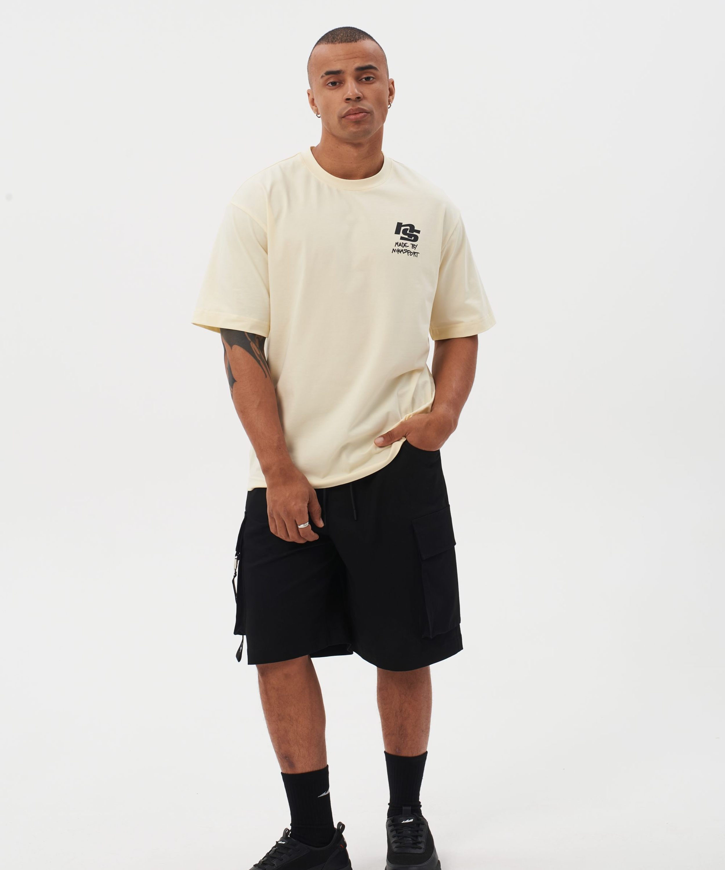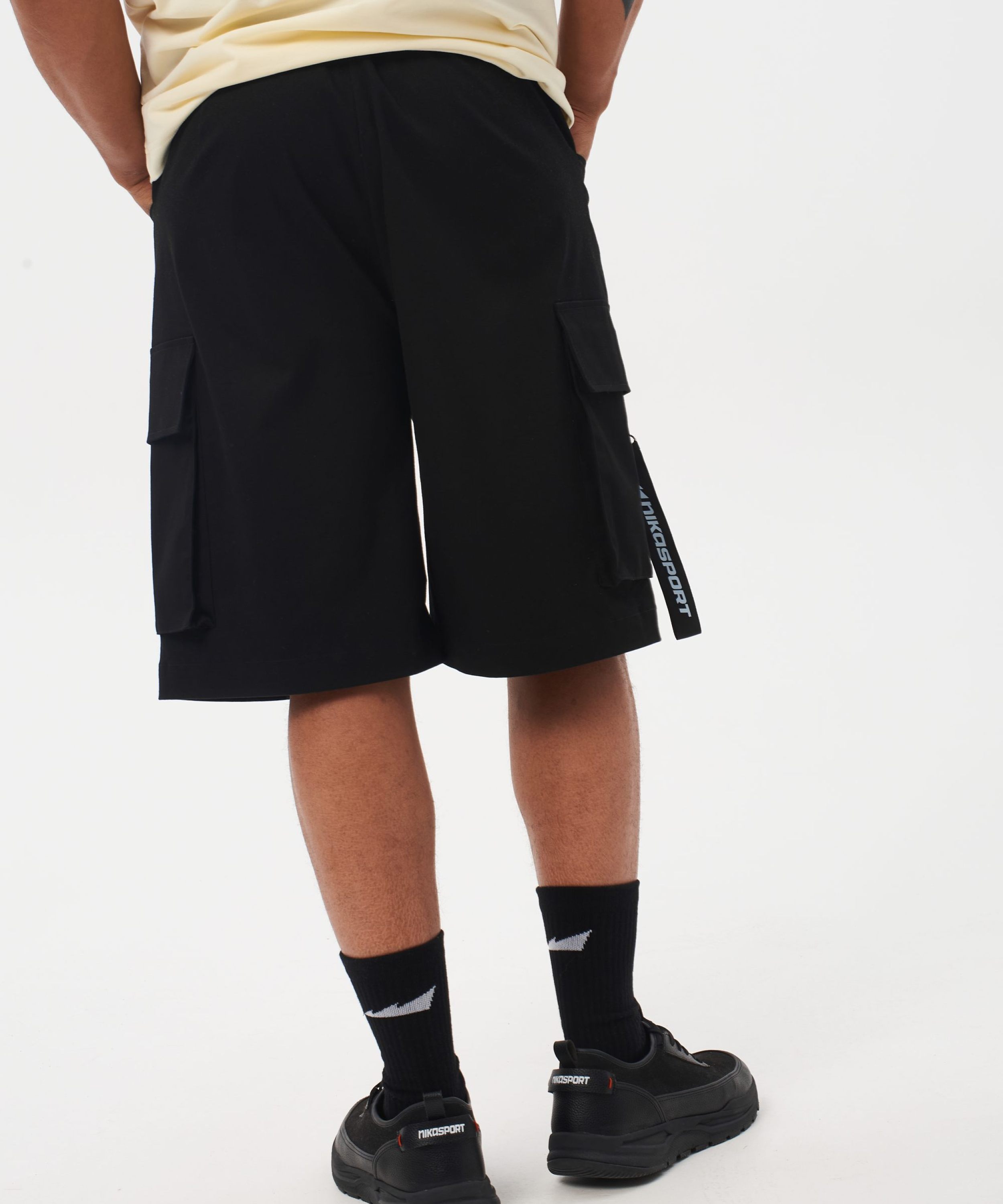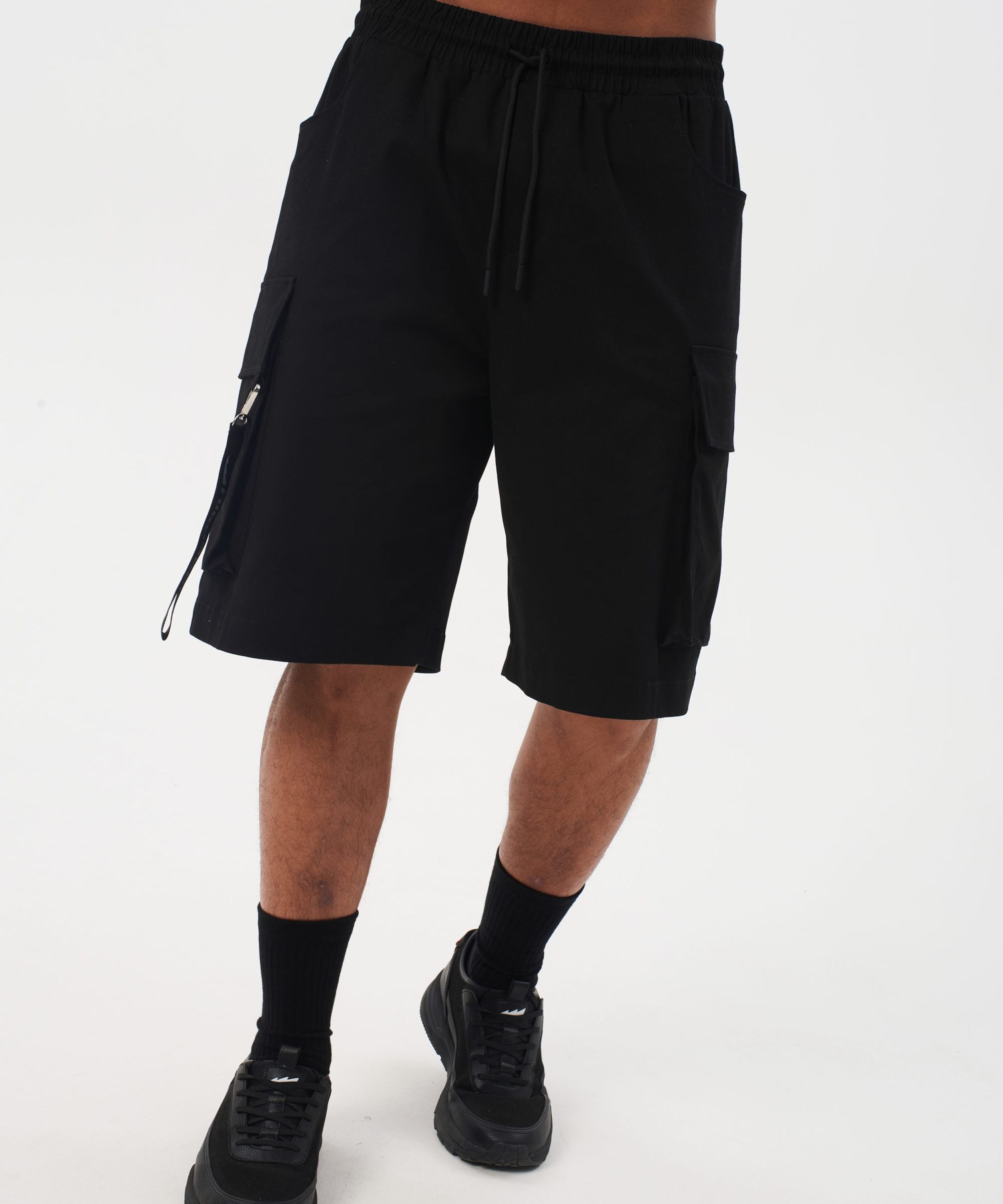 Оверсайз карго-шорты мужские трендового силуэта выполнены из материала "твил", в составе которого 97% хлопка и 3% эластана. Посадка шорт - средняя. Шорты имеют свободный крой, два набедренных кармана и два больших боковых кармана-портфель с клапанами. На правом кармане расположена петля для карабина. Эластичный шнур в поясе помогает регулировать посадку. Шорты выполнены в двух цветах: светло-бежевый и черный. Легкий и приятный к телу материал шорт, трендовый силуэт и нейтральные цвета позволяют создавать классные образы в спортивном стиле на весну/лето.