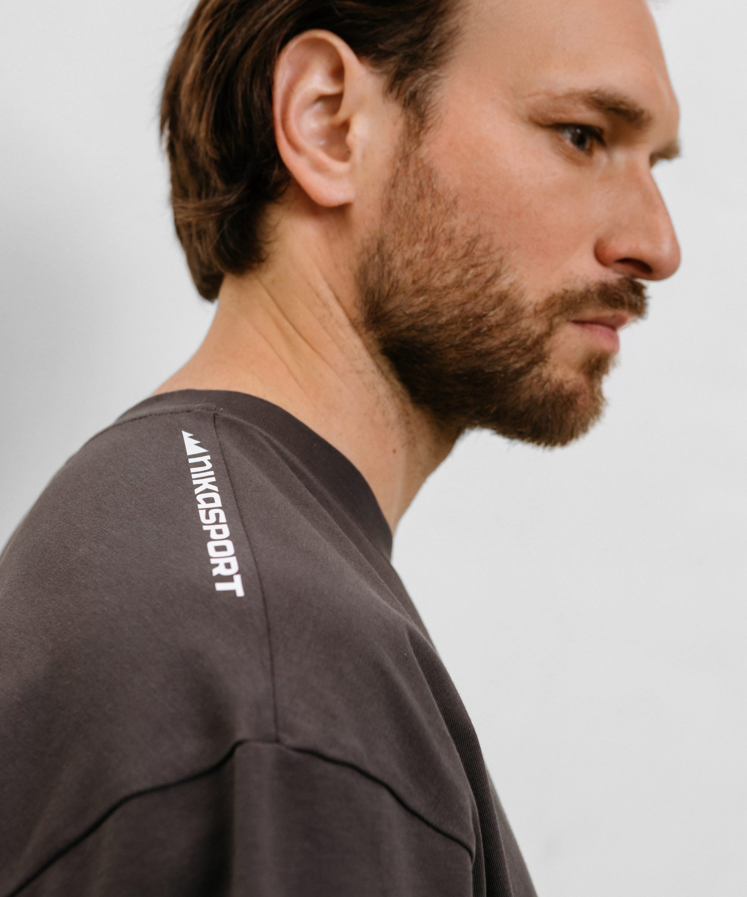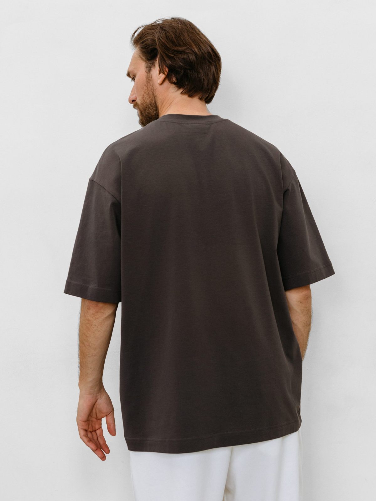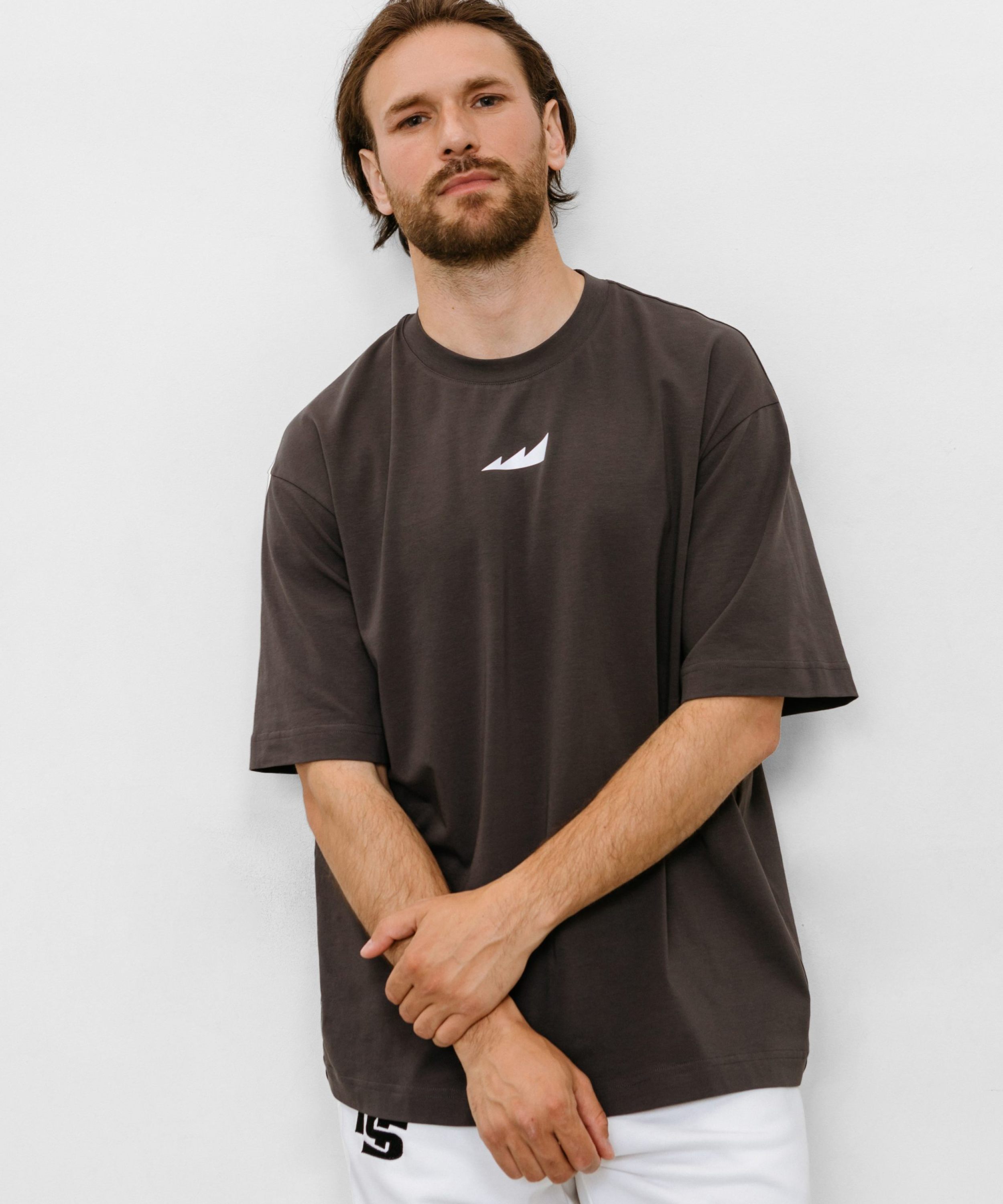 Мужская футболка oversize силуэта. Выполнена из материала, в составе которого 95% хлопка и 5% эластана, за счет чего футболка лучше держит форму. На груди и на плече расположены логотипы бренда. Модель представлена в универсальном темно-сером цвете и легко сочетается как со спортивной так и с повседневной одеждой.