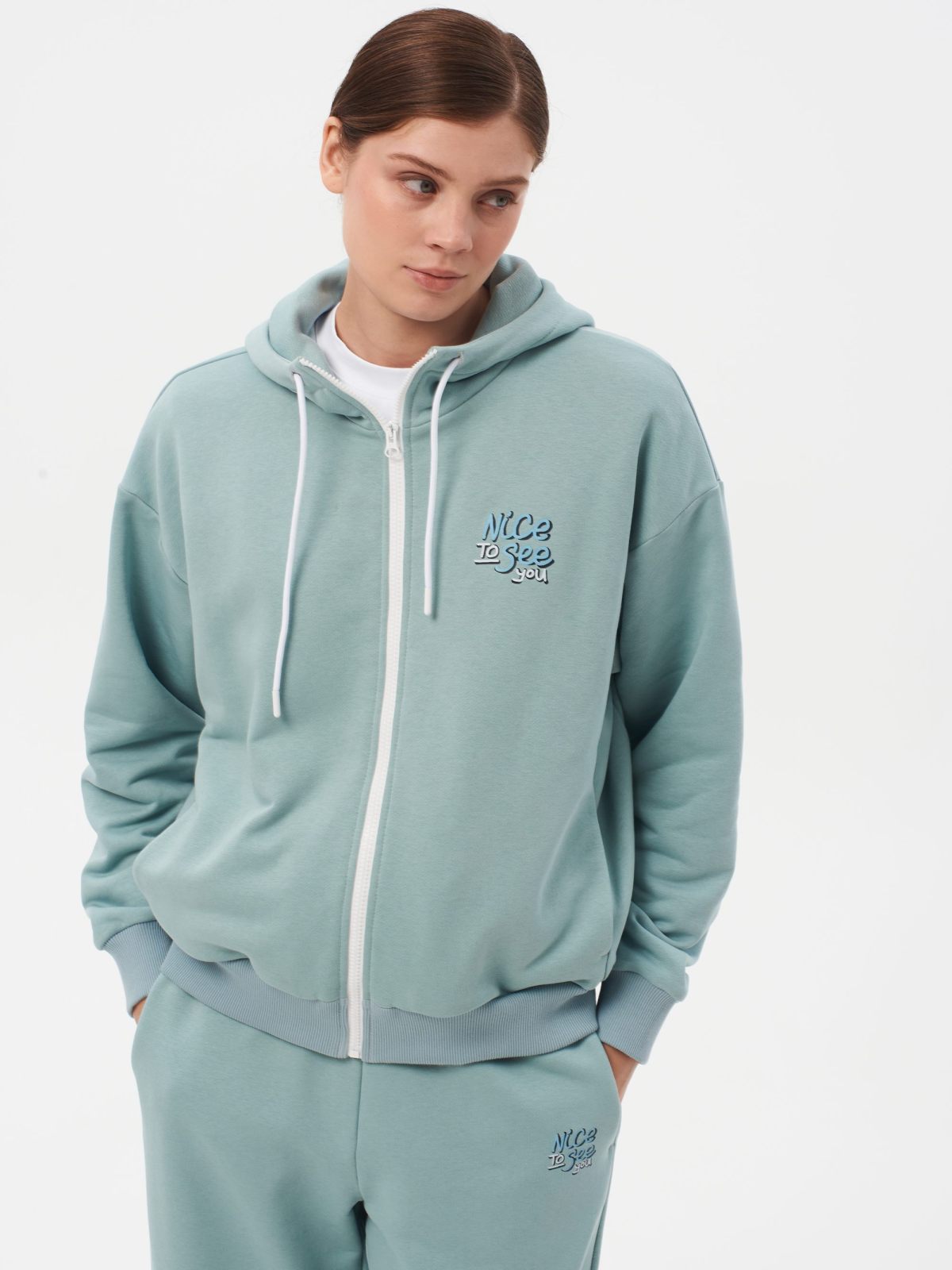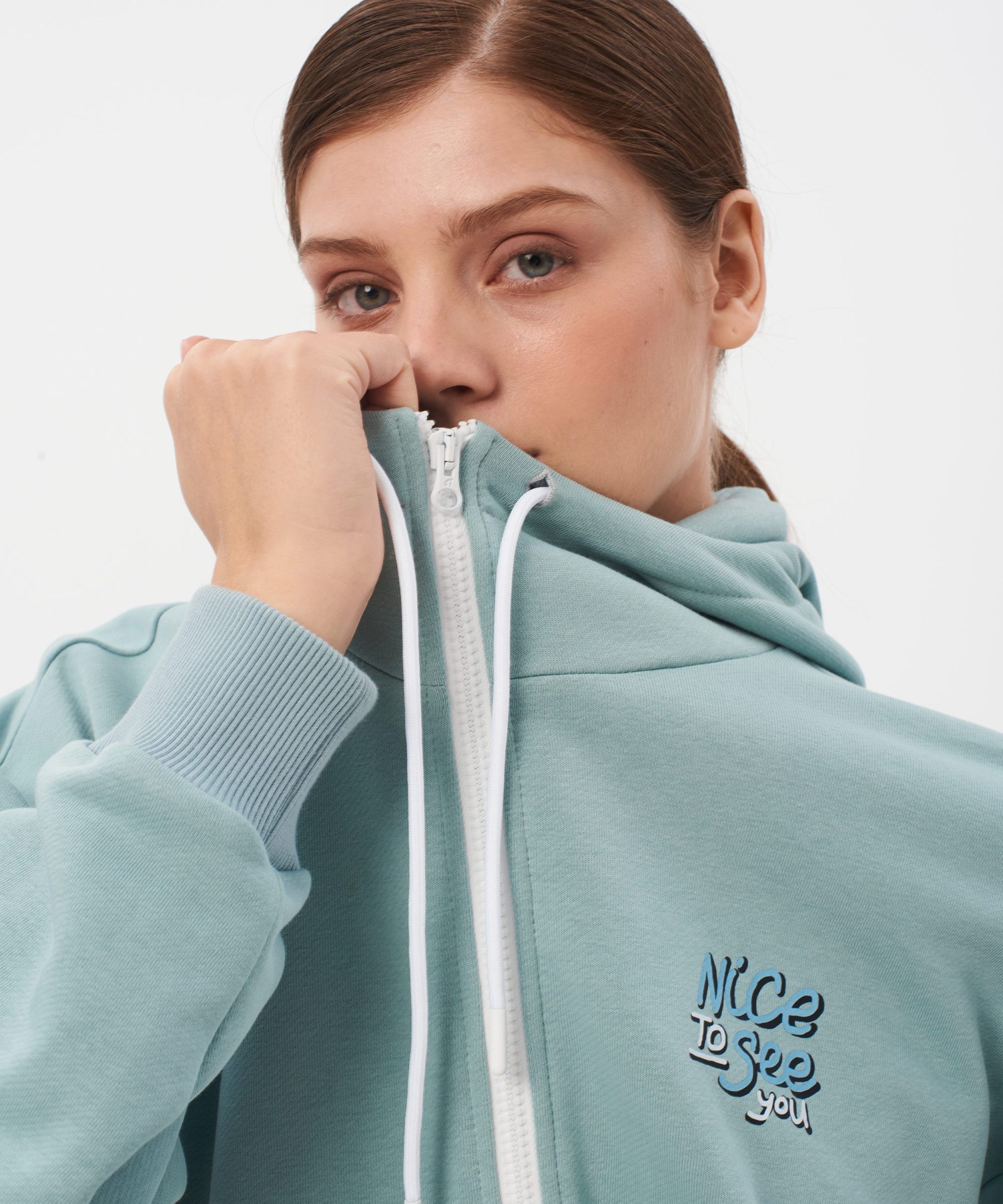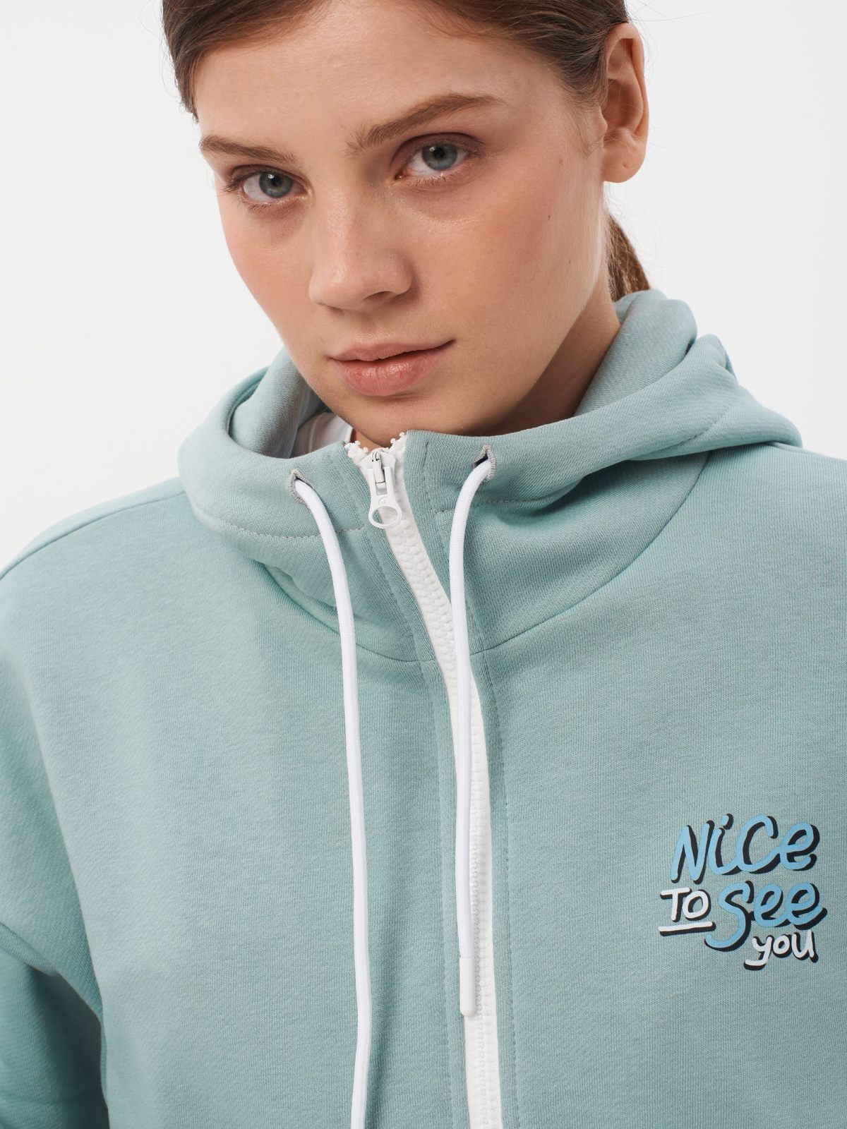 Классическая женская толстовка на молнии. В составе 90% хлопка и 10% полиэстера, что обеспечивает отличную посадку и долговечность изделия. Спущенная линия плеча, свободный крой, высокий воротник на утяжке с капюшоном превращают толстовку в уютный атрибут посведневной одежды. Представлена в сезонных цветах мята и капучино, на груди расположен нежный принт. Модель не сковывает движения и позволяет создавать многослойные образы.