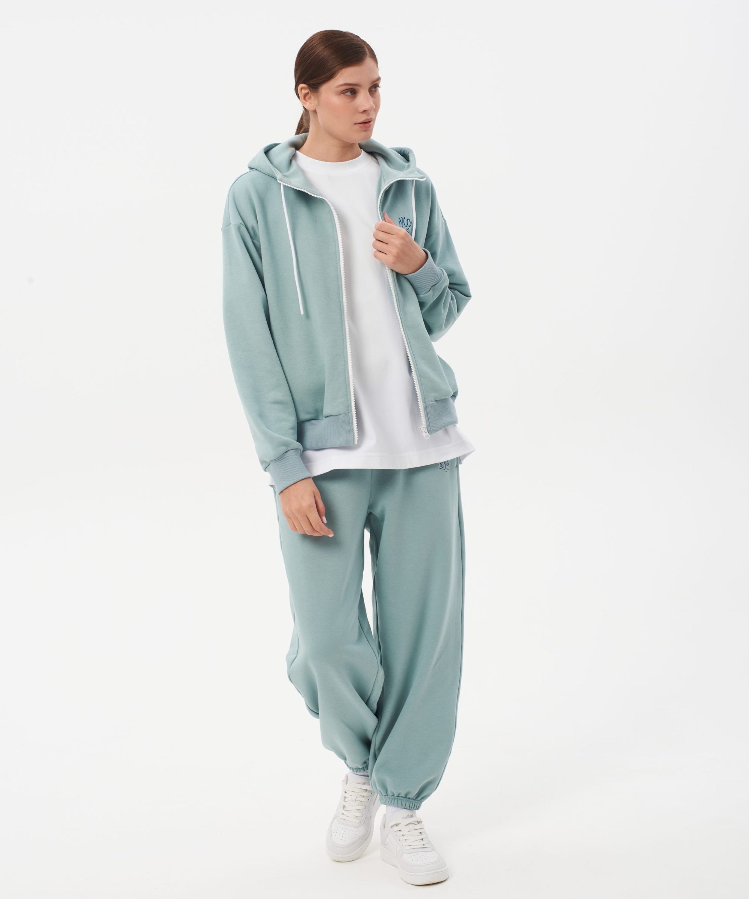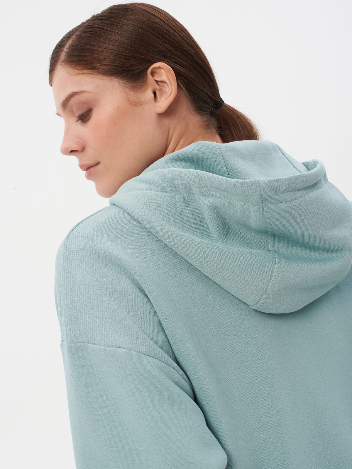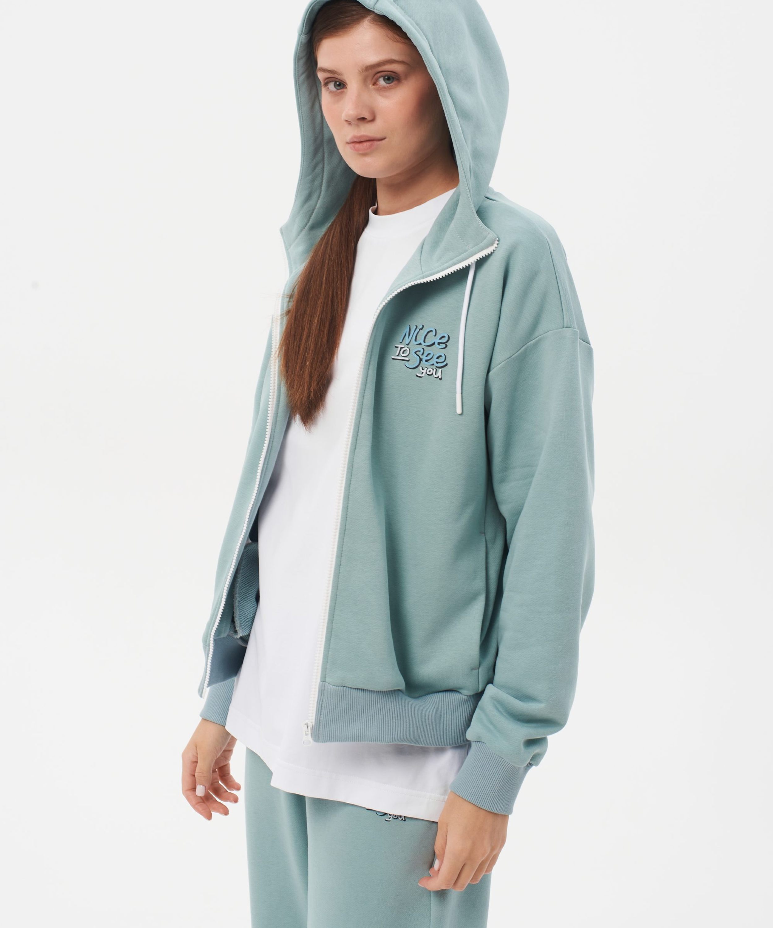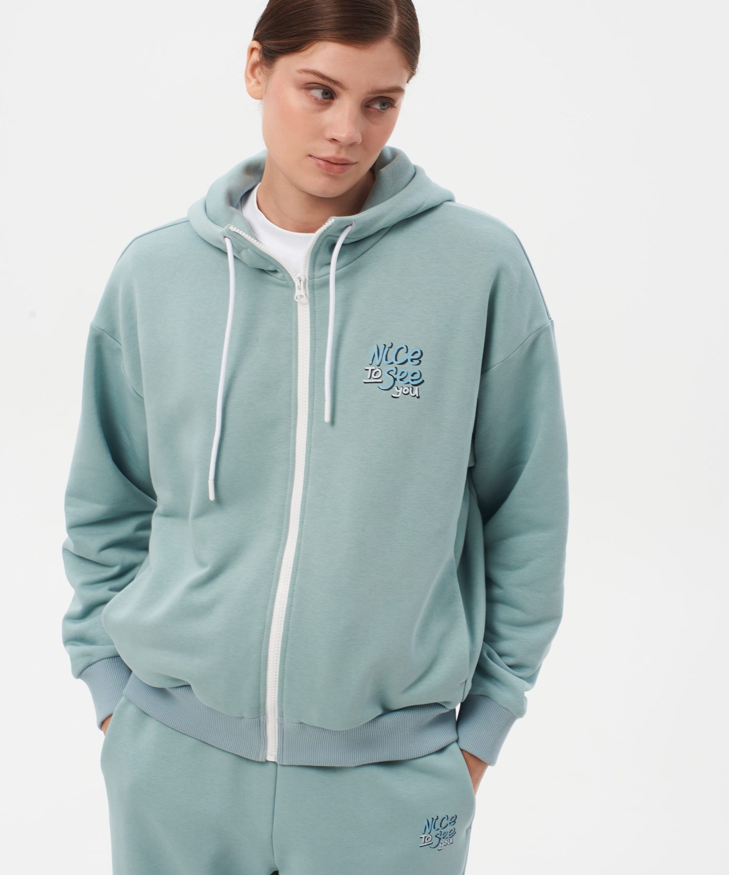 Классическая женская толстовка на молнии. В составе 90% хлопка и 10% полиэстера, что обеспечивает отличную посадку и долговечность изделия. Спущенная линия плеча, свободный крой, высокий воротник на утяжке с капюшоном превращают толстовку в уютный атрибут посведневной одежды. Представлена в сезонных цветах мята и капучино, на груди расположен нежный принт. Модель не сковывает движения и позволяет создавать многослойные образы.