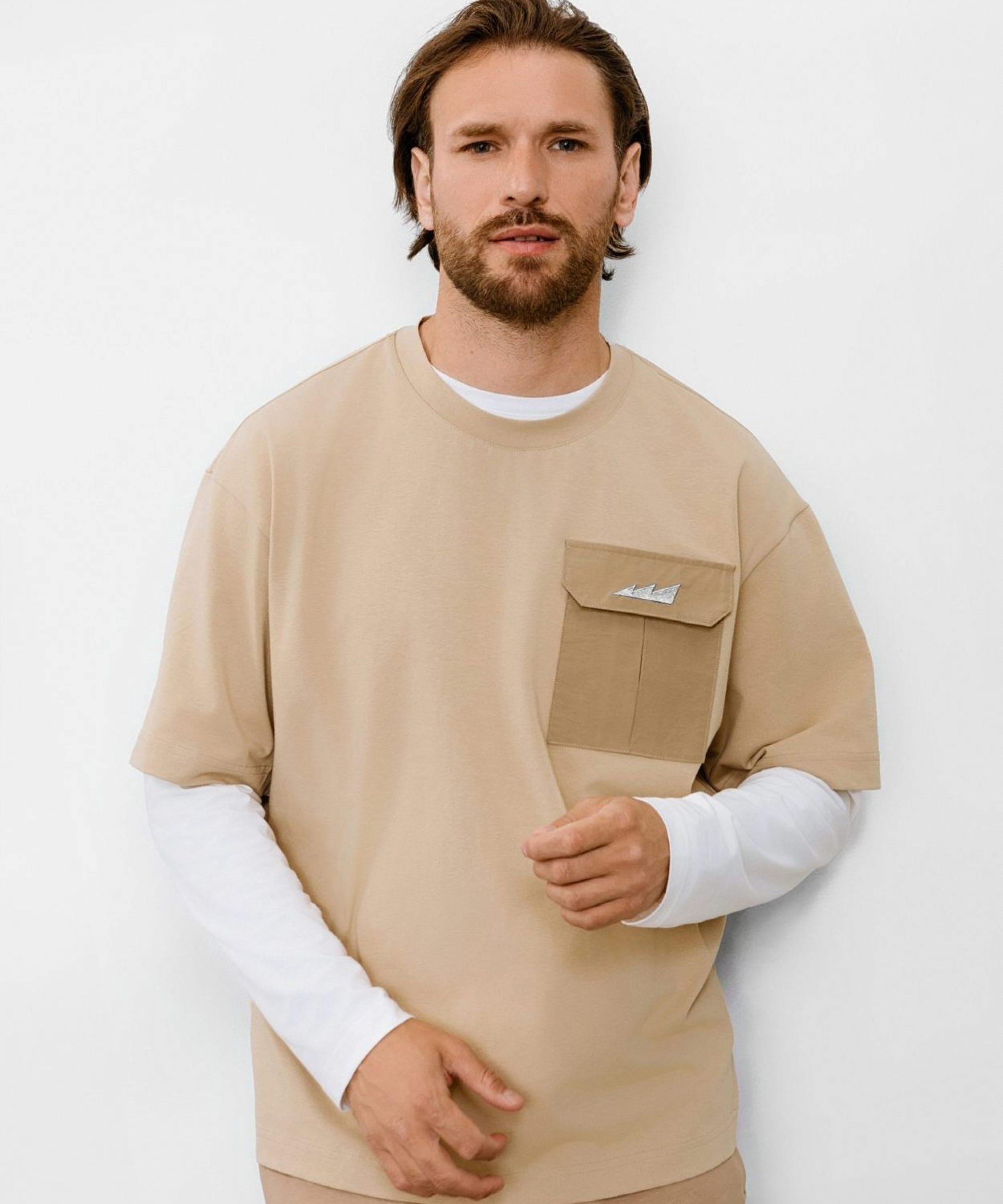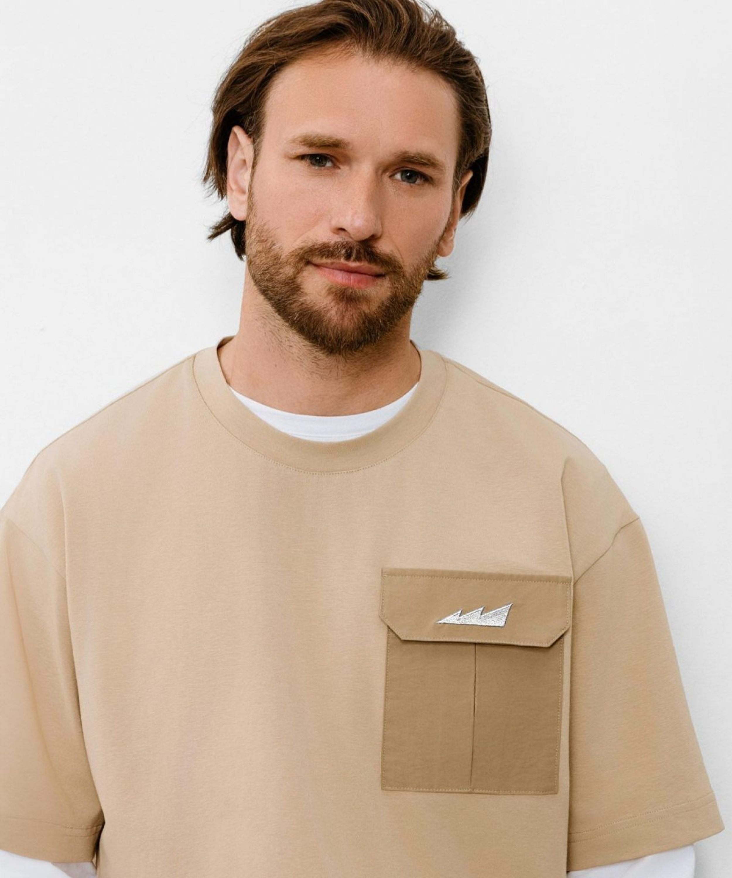 Мужская футболка oversize силуэта. Выполнена из материала, в составе которого 95% хлопка и 5% эластана, за счет чего футболка лучше держит форму. Спущенная линия плеча делает крой футболки более молодежным. Интересный акцент модели - контрастный карман-портфель на груди. Футболка представлена в универсальных бежевых и белом цветах. Создавай спортивный или повседневный образ на каждый день!