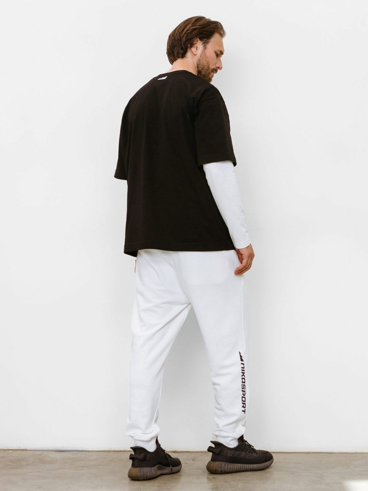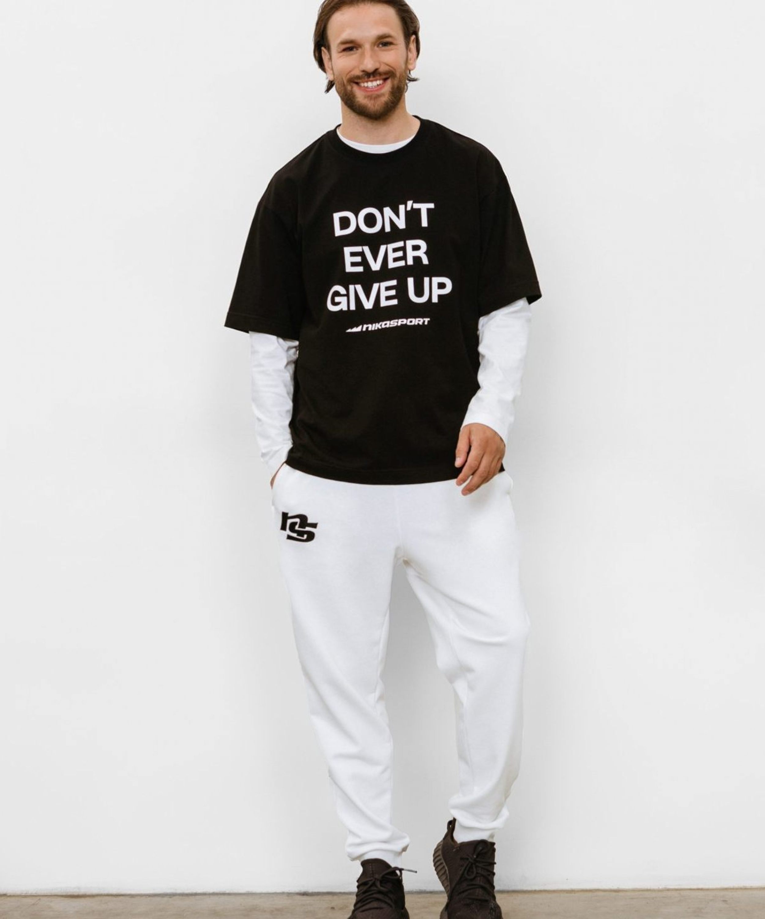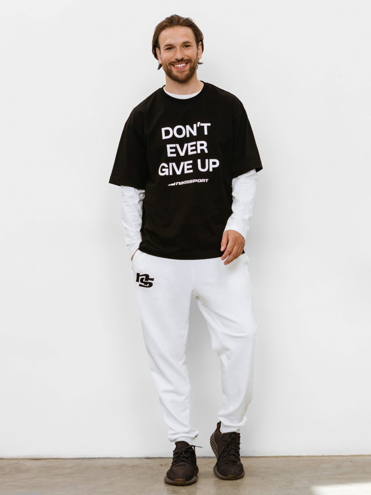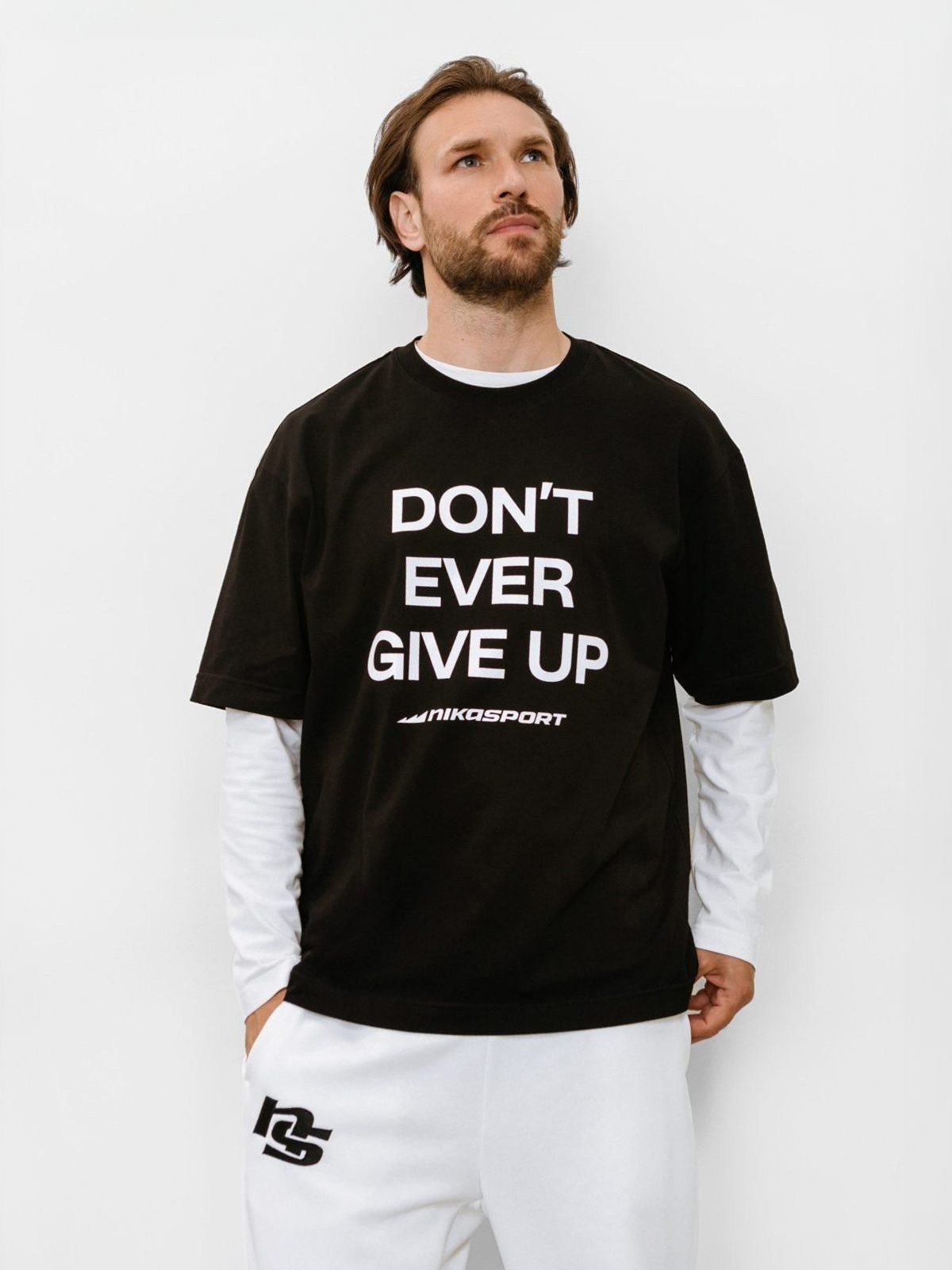 Мужская футболка oversize силуэта. Сделана из 100% плотного хлопка - гипоаллергенного материала, отлично пропускающего воздух. Спущенная линия плеча и большой принт-слоган на спине делают модель более молодежной. Футболка представлена в классическом черном цвете и отлично сочетается как со спортивным, так и с повседневным стилем.
