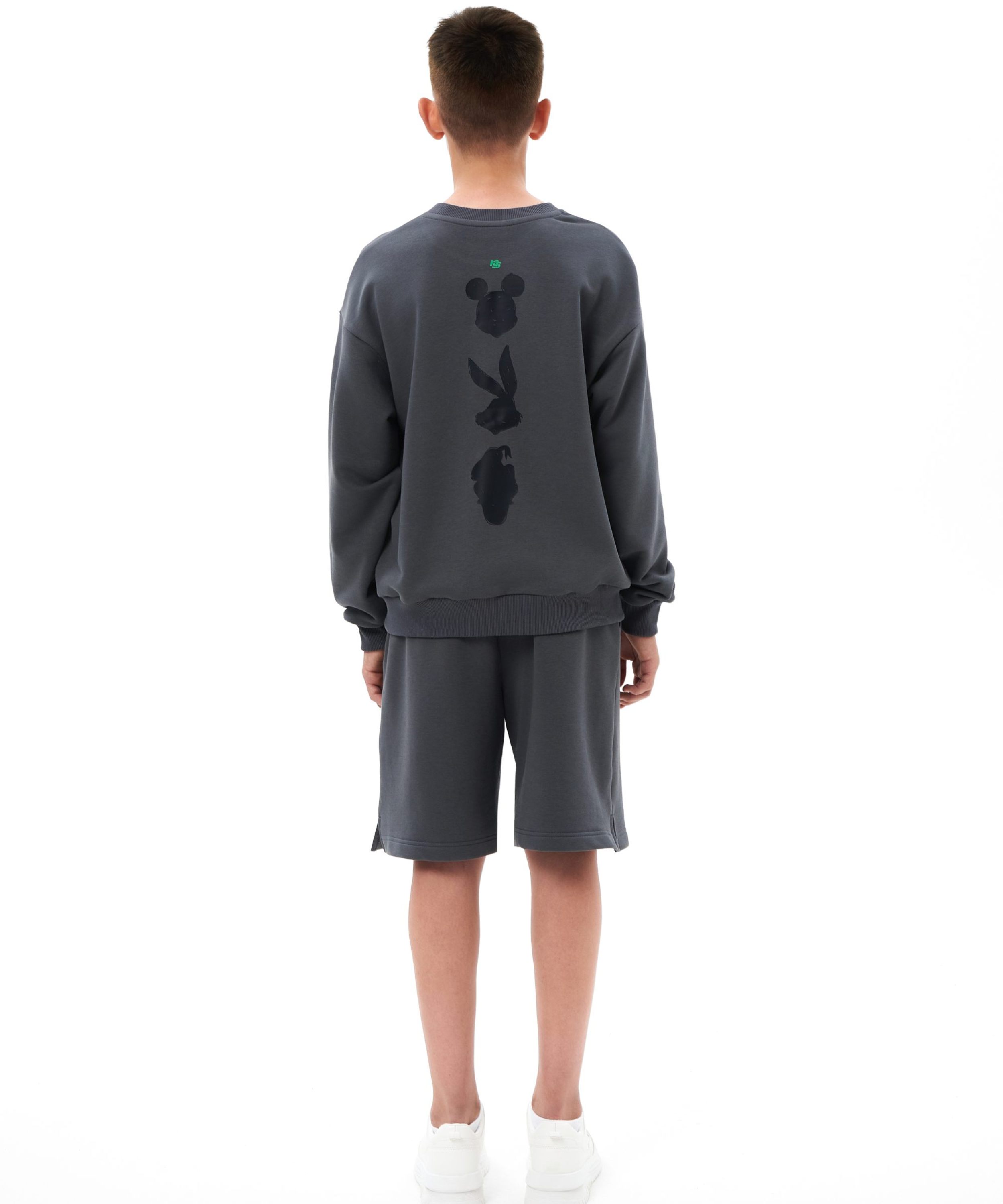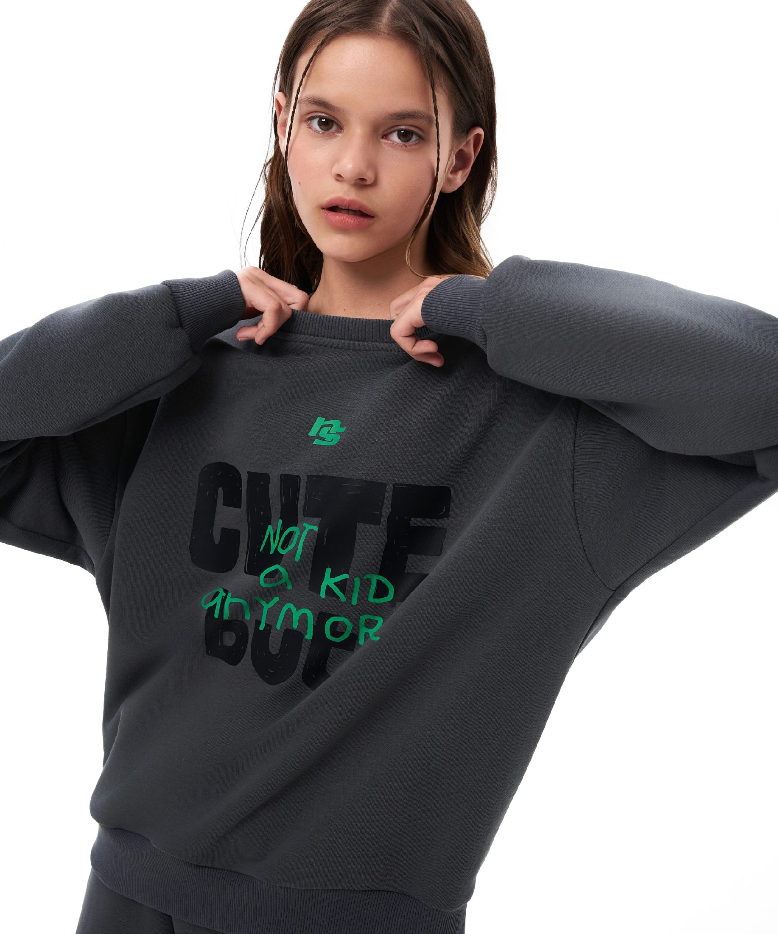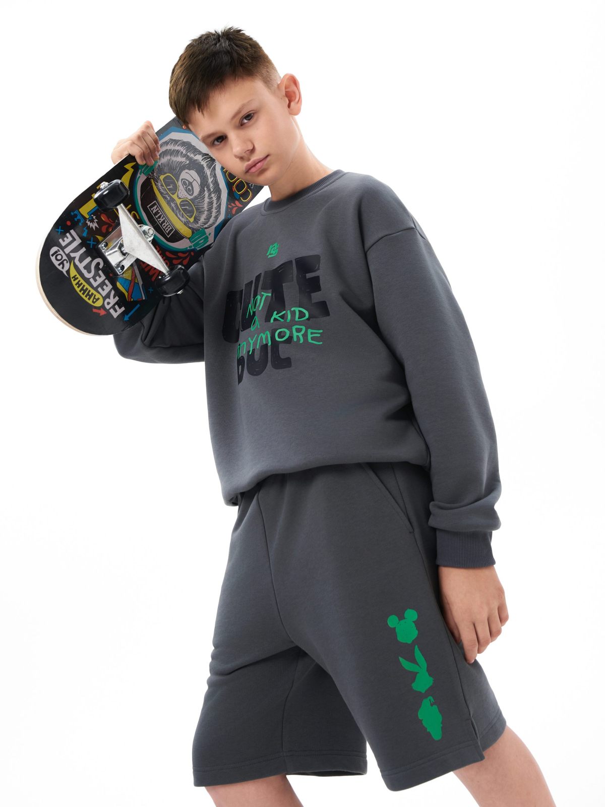 Детский свишот прямого силуэта из коллекции Naka. Выполнен из футера 3х-нитки, в составе которого 92% хлопка и 8% эластана - гипоаллергенного, пропускающего воздух, мягкого и плотного материала. На груди и спине расположены большие принты с дизайнерскими слоганами и символами капсулы "Not A Kid Anymore" - любимыми детскими персонажами для тех, кто уже не ребенок! Создай свой стильный образ в ярком синем или глубоком графитовом цвете!