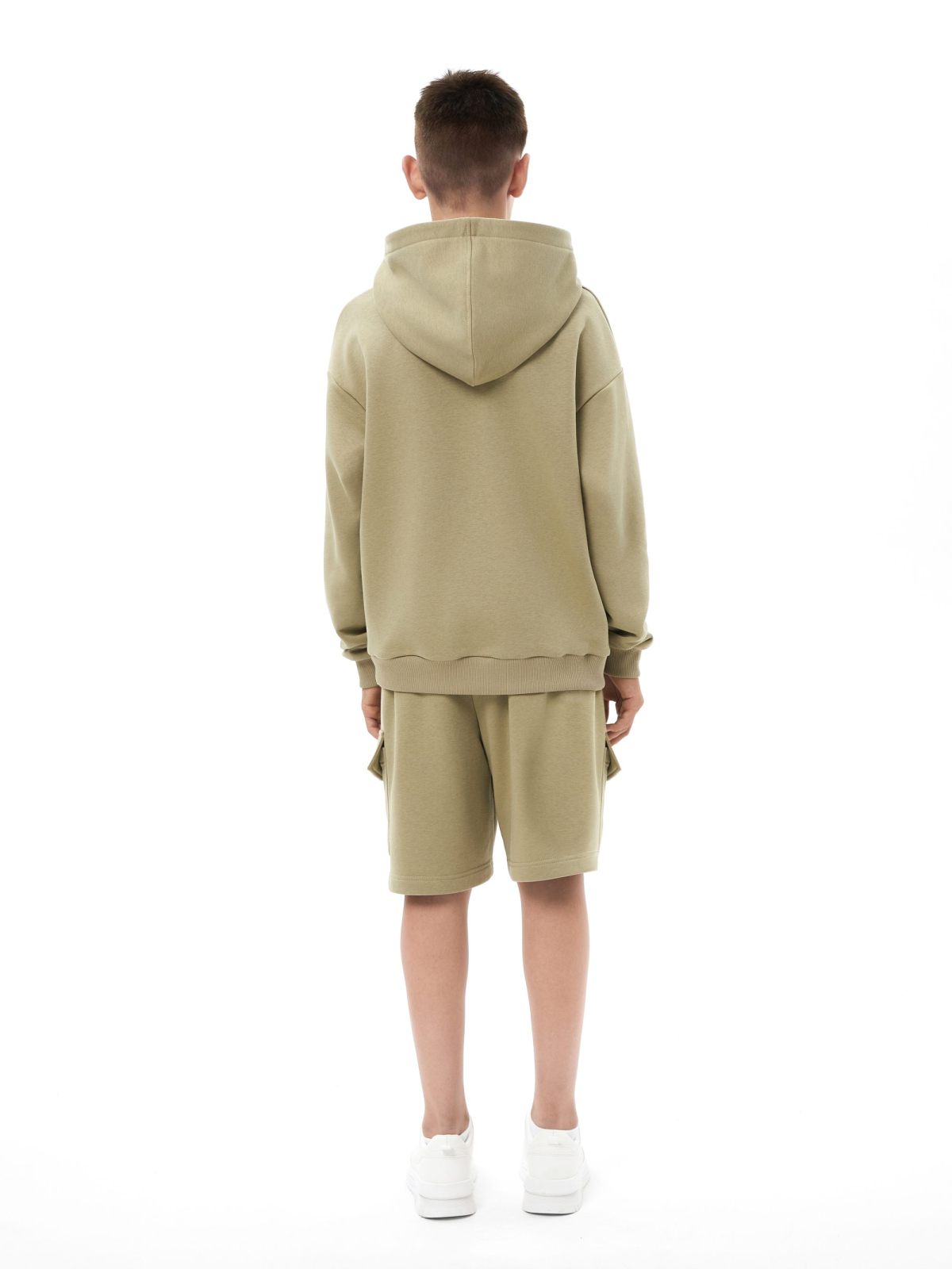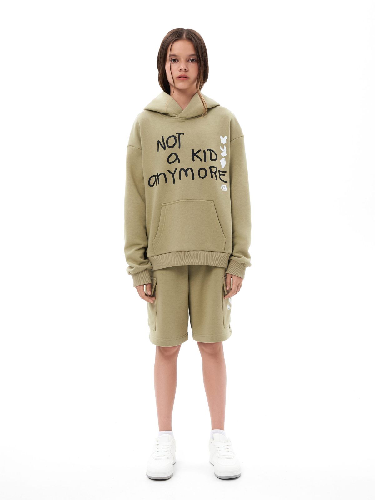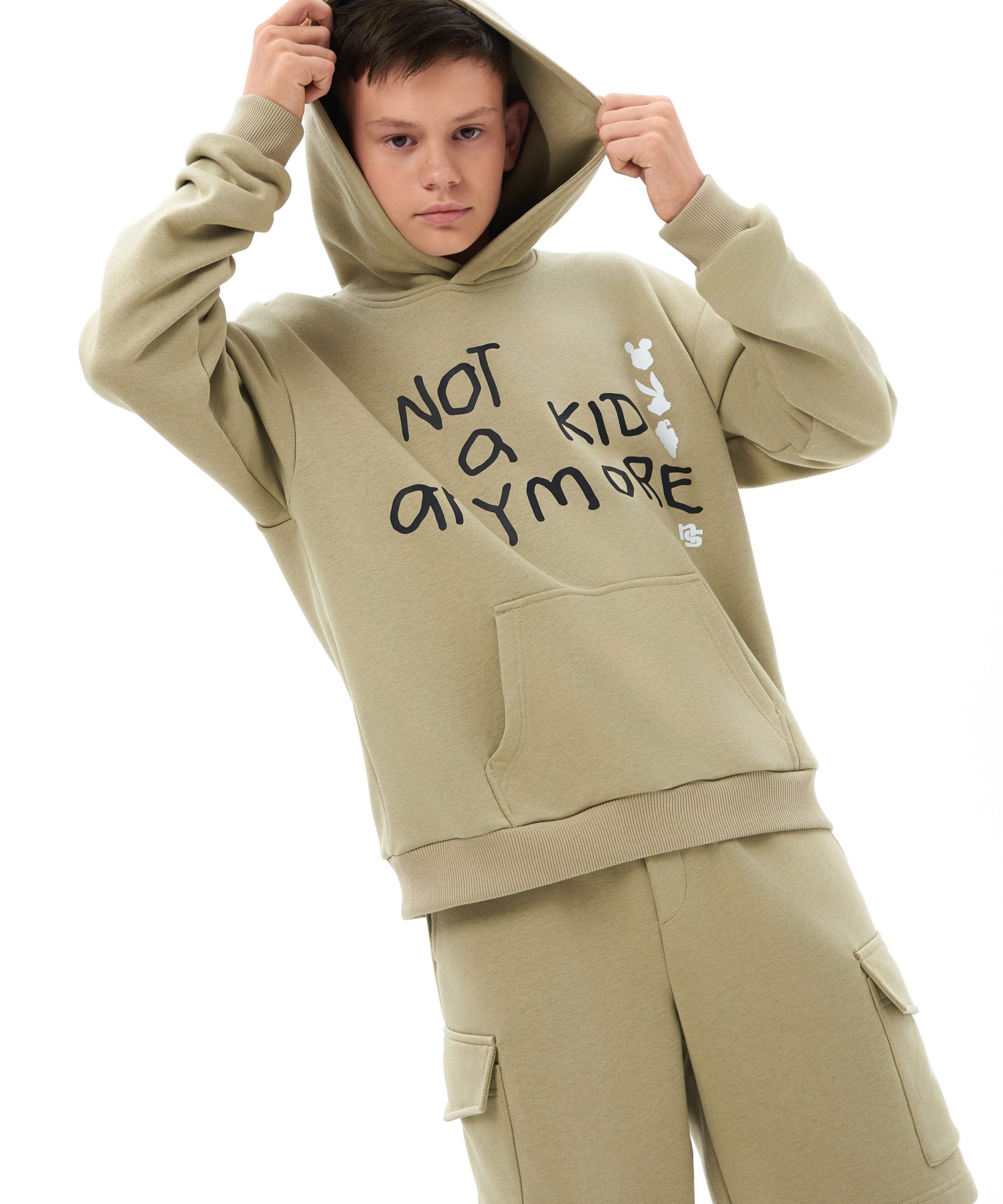 Детское худи прямого силуэта из коллекции Naka. Выполнен из футера 3х-нитки, в составе которого 92% хлопка и 8% эластана - гипоаллергенного, пропускающего воздух, мягкого и плотного материала. На груди расположен большой принт с дизайнерским слоганом, логотипом и символами капсулы "Not A Kid Anymore" - любимыми детскими персонажами для тех, кто уже не ребенок! Особенностью модели являются карман-кенгуру для хранения личных вещей и глубокий капюшон для защиты от непогоды. Создай свой стильный образ в трендовом оливковом цвете!