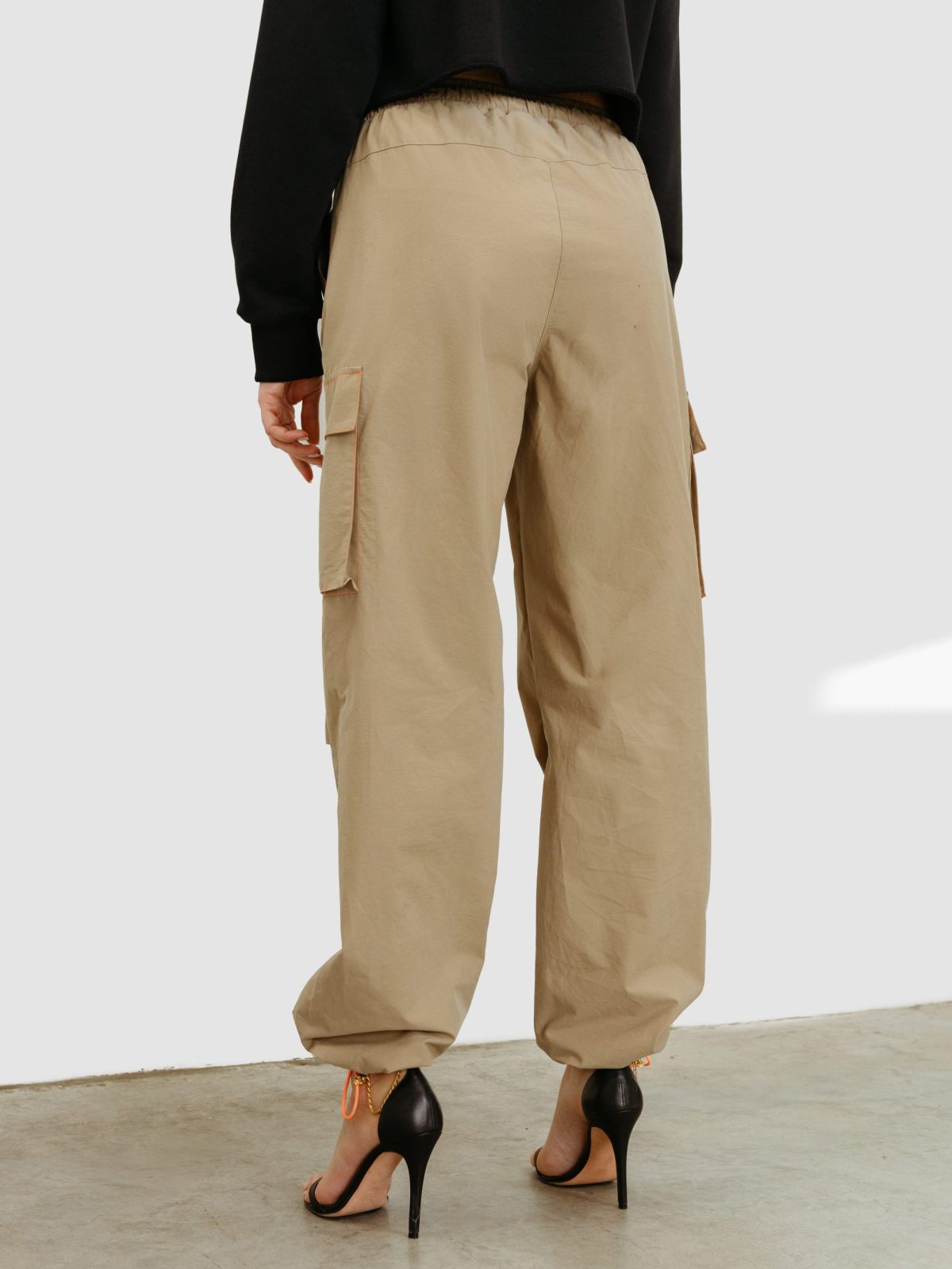 Женские карго-брюки трендового силуэта Loose выполнены из материала, в составе которого 70% хлопка и 30% нейлона. Контрастные и функциональные утяжки-резинки в поясе и на штанах помогают регулировать посадку. Представлены в бежевом и белом цветах. Два больших боковых кармана-портфель, яркий дизайнерский лого-принт на левой ноге, легкий и приятный к телу материал позволяют создавать удобные и стильные образы.