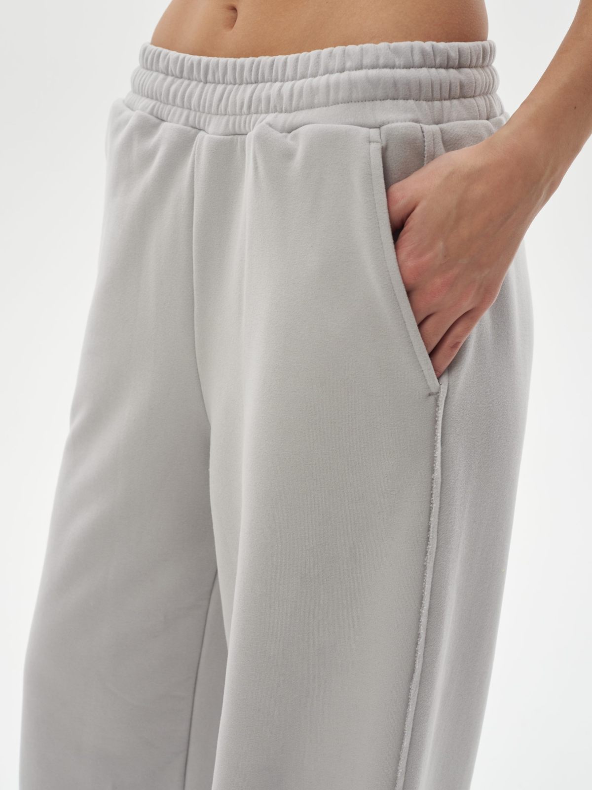 Прямые широкие брюки oversize силуэта выполнены из плотного хлопка с бархатистым эффектом. Брюки имеют боковые карманы и необработанные края, которые подчеркивают расслабленный дизайн брюк. Посадка брюк – средняя, брюки имеют отсроченный пояс с эластичной резинкой внутри и шнуром.
