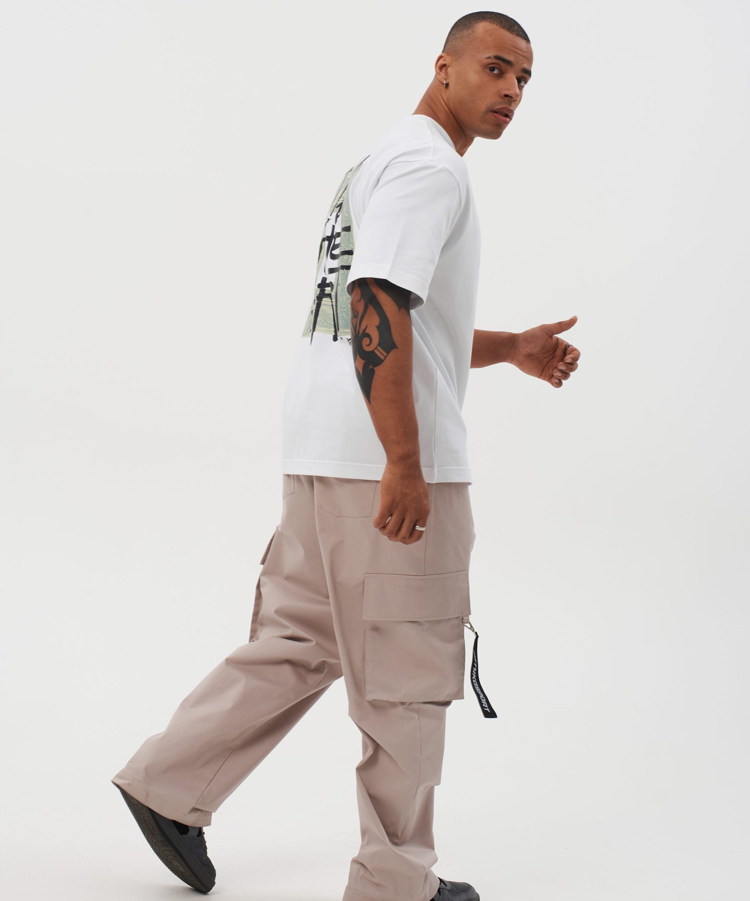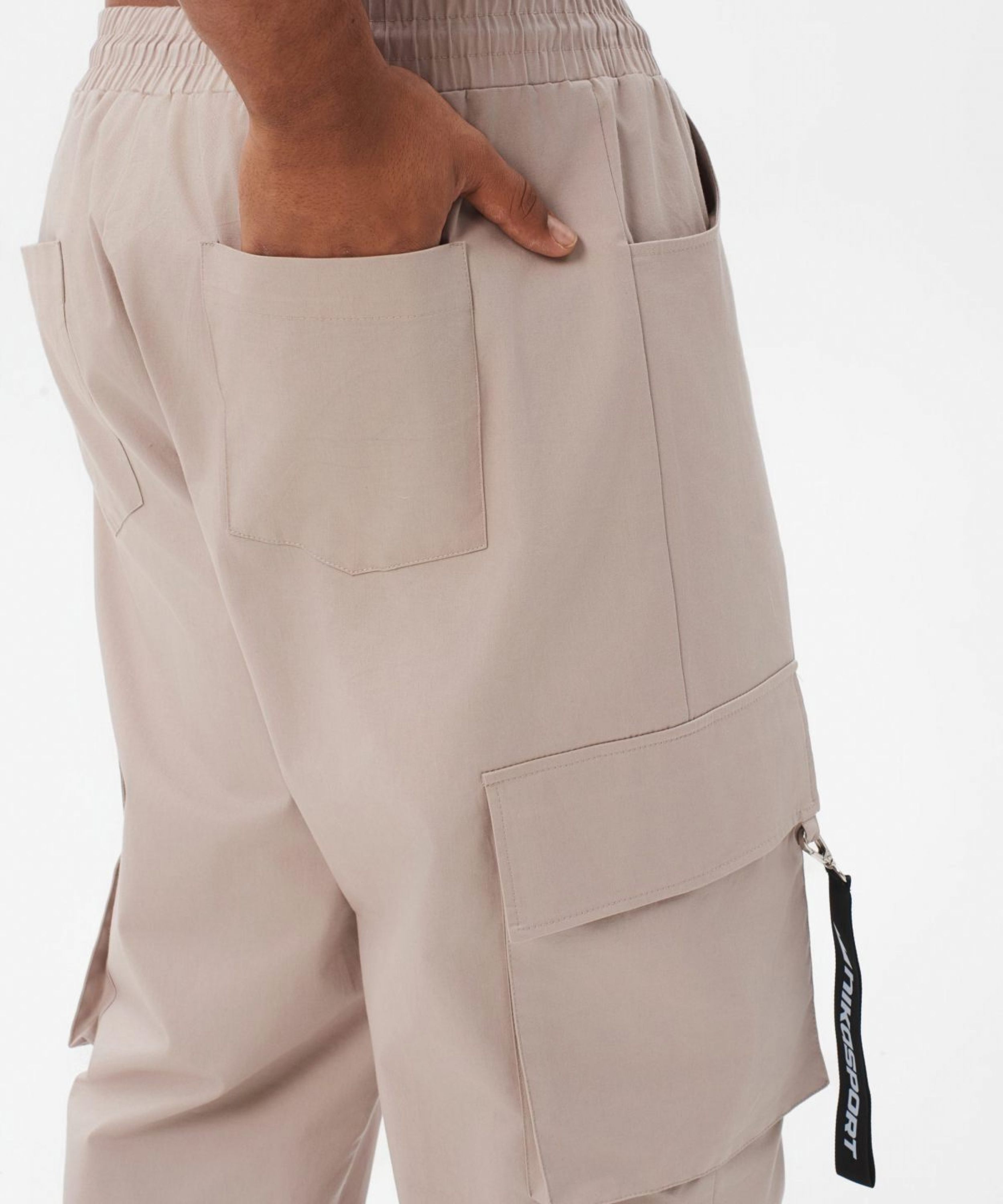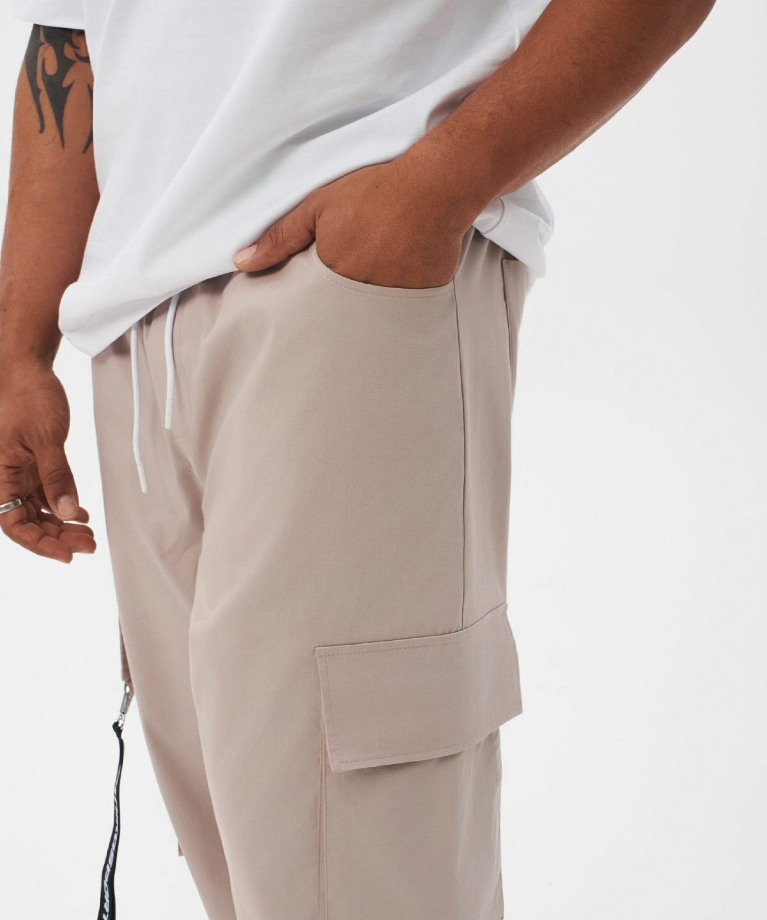 Мужские карго-брюки трендового силуэта oversize выполнены из материала "твил", в составе которого 97% хлопка и 3% эластана. Имеют свободный крой, четыре классических и два больших боковых кармана-портфель с клапанами. Эластичный шнур в поясе помогает регулировать посадку. На правом кармане расположена петля для карабина. Брюки выполнены в двух цветах: светло-бежевый и черный. Легкий и приятный к телу материал брюк, трендовый силуэт и нейтральные цвета позволяют создавать классные образы в спортивном стиле на весну/лето.