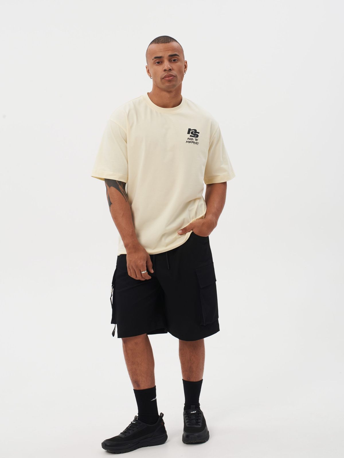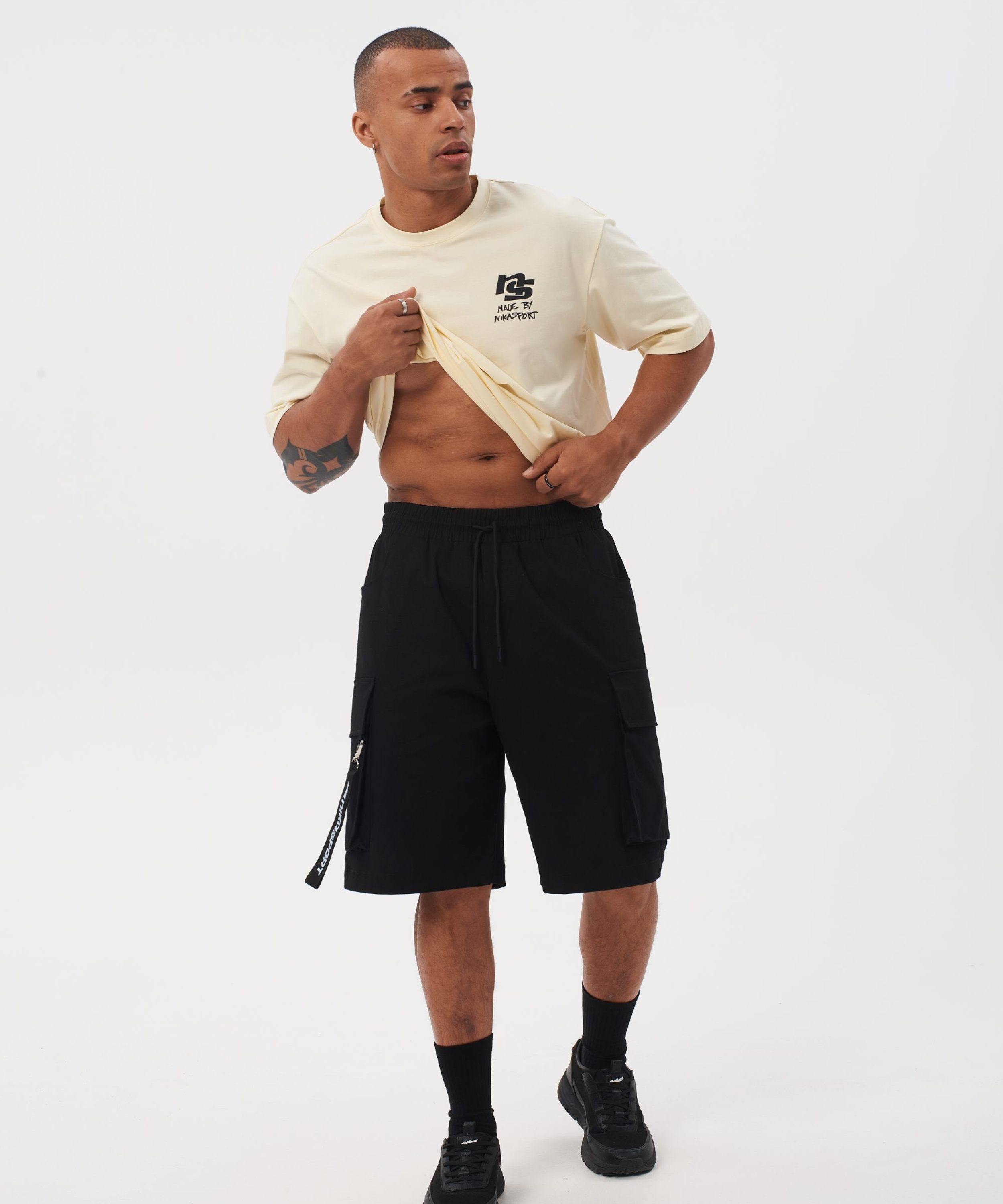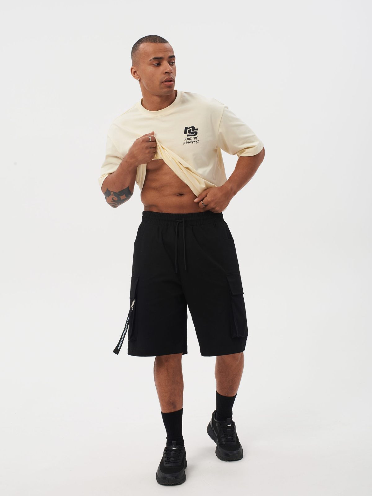 Оверсайз карго-шорты мужские трендового силуэта выполнены из материала "твил", в составе которого 97% хлопка и 3% эластана. Посадка шорт - средняя. Шорты имеют свободный крой, два набедренных кармана и два больших боковых кармана-портфель с клапанами. На правом кармане расположена петля для карабина. Эластичный шнур в поясе помогает регулировать посадку. Шорты выполнены в двух цветах: светло-бежевый и черный. Легкий и приятный к телу материал шорт, трендовый силуэт и нейтральные цвета позволяют создавать классные образы в спортивном стиле на весну/лето.