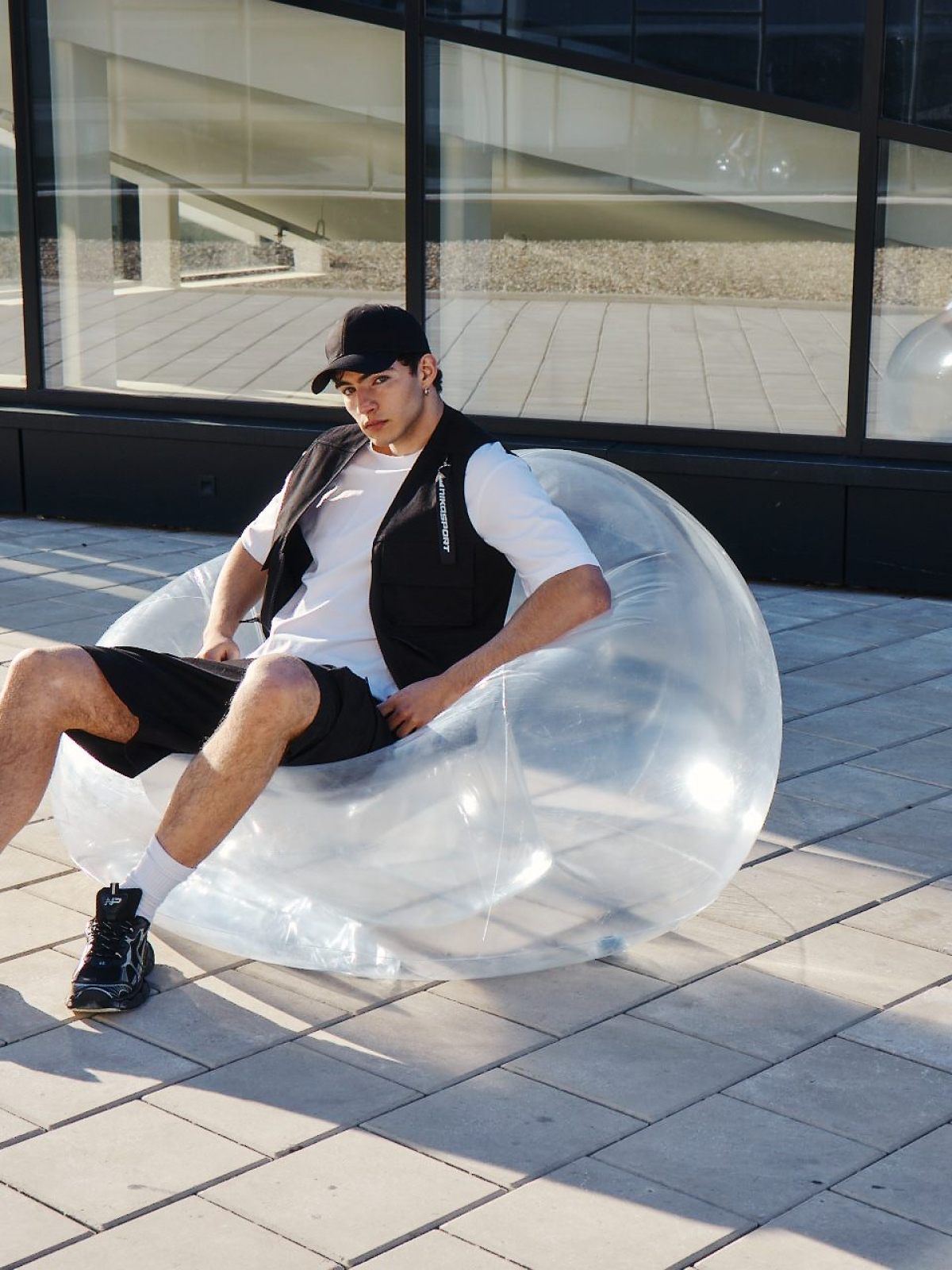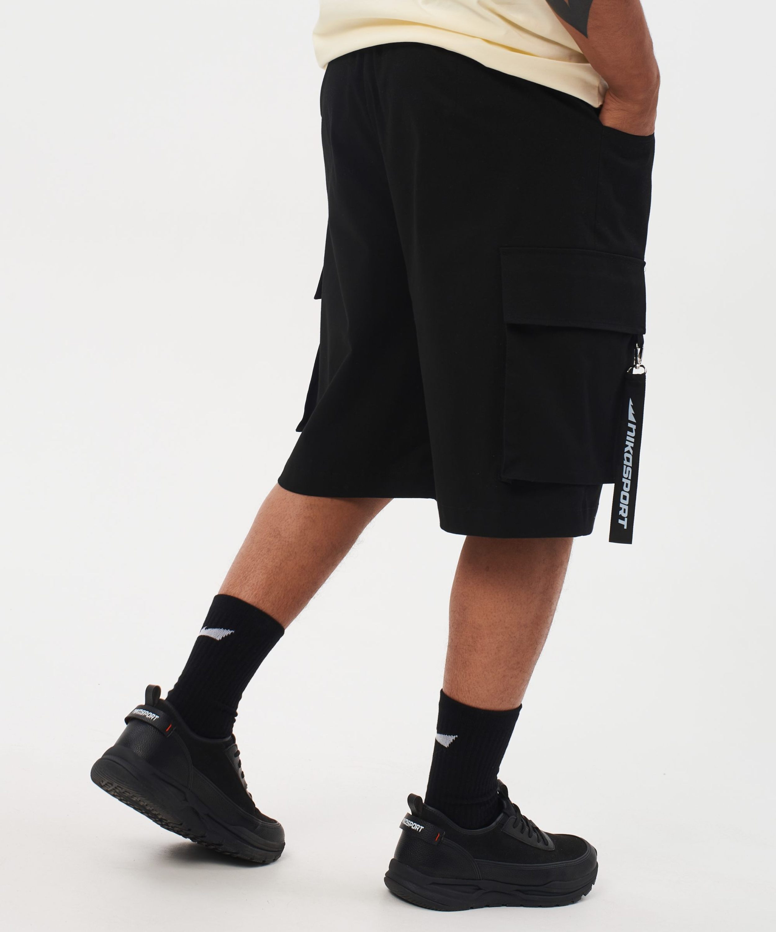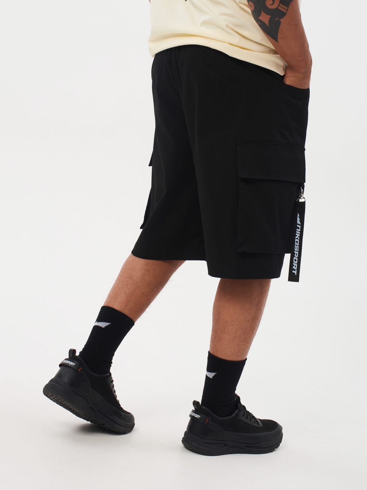 Оверсайз карго-шорты мужские трендового силуэта выполнены из материала "твил", в составе которого 97% хлопка и 3% эластана. Посадка шорт - средняя. Шорты имеют свободный крой, два набедренных кармана и два больших боковых кармана-портфель с клапанами. На правом кармане расположена петля для карабина. Эластичный шнур в поясе помогает регулировать посадку. Шорты выполнены в двух цветах: светло-бежевый и черный. Легкий и приятный к телу материал шорт, трендовый силуэт и нейтральные цвета позволяют создавать классные образы в спортивном стиле на весну/лето.