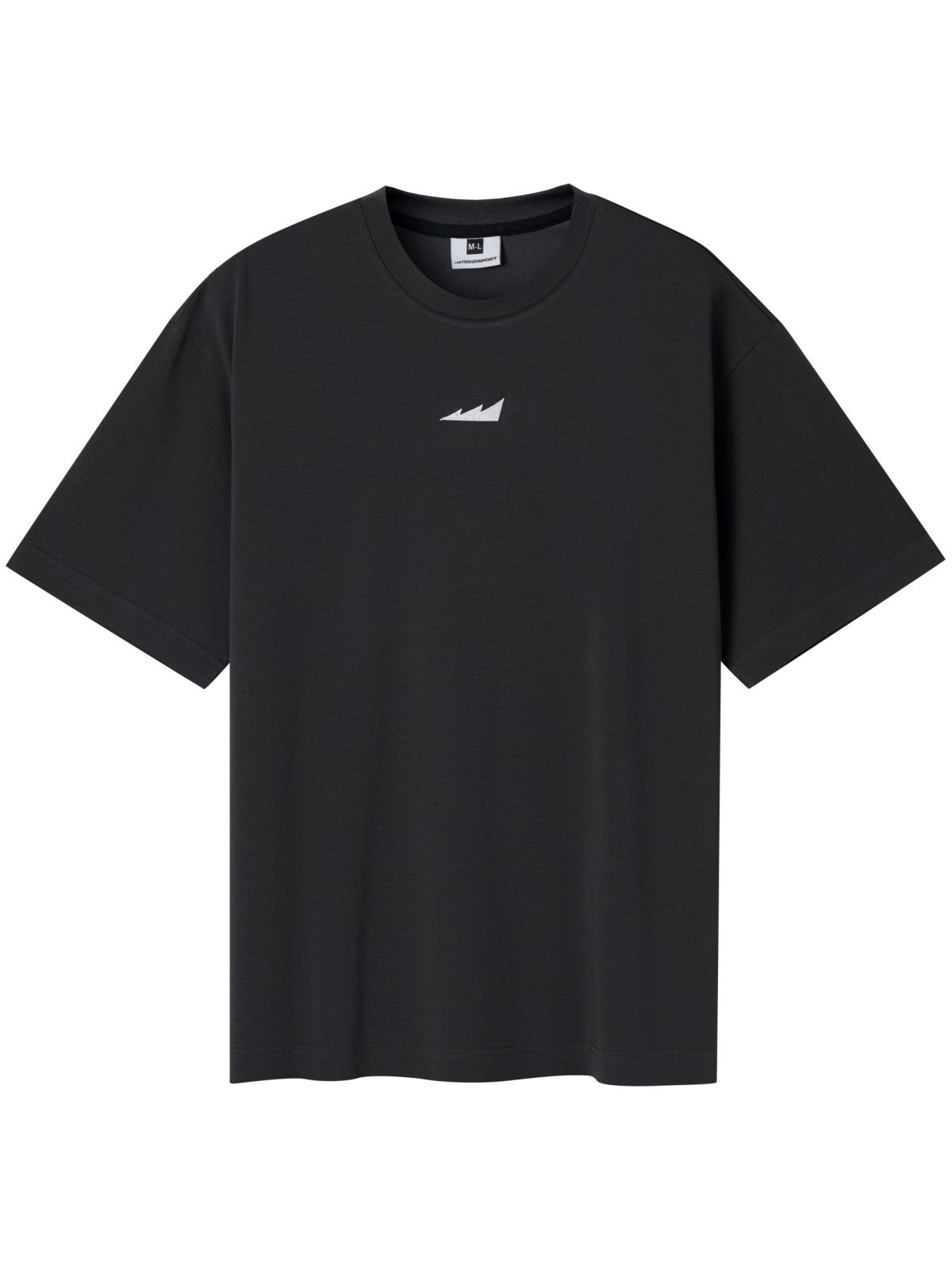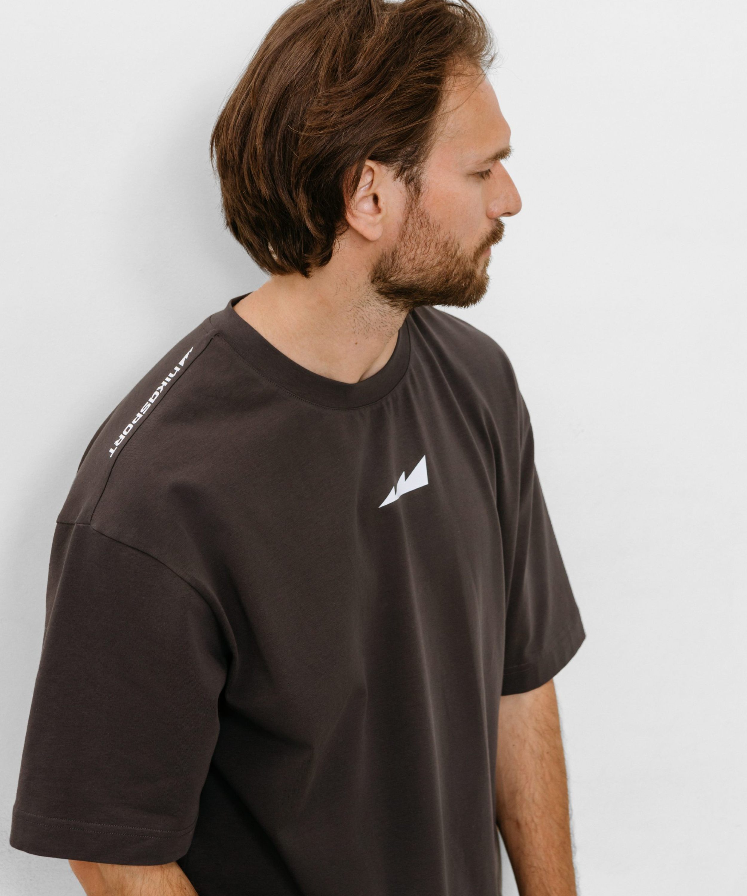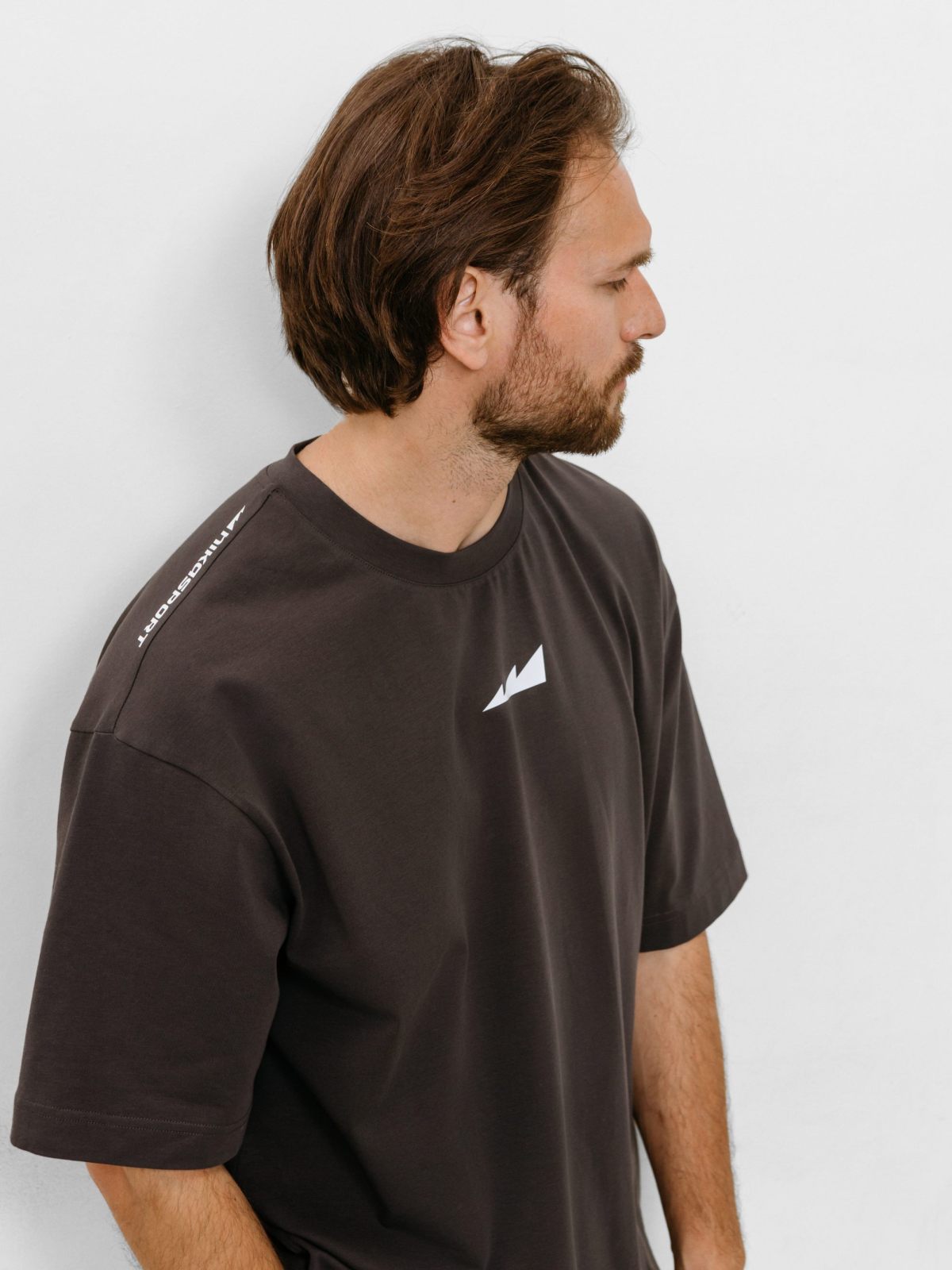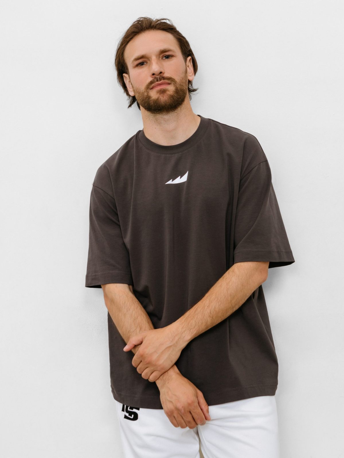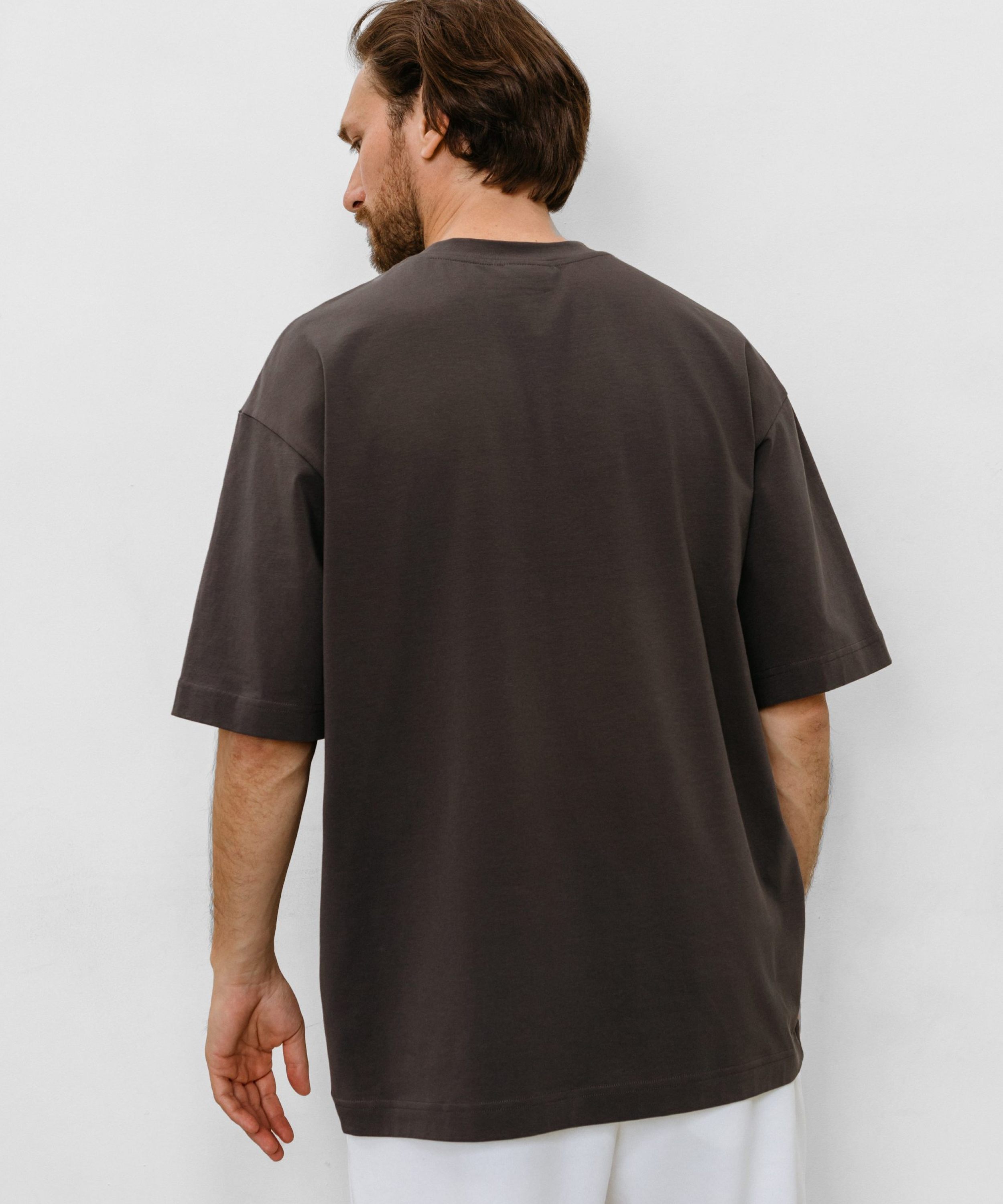 Мужская футболка oversize силуэта. Выполнена из материала, в составе которого 95% хлопка и 5% эластана, за счет чего футболка лучше держит форму. На груди и на плече расположены логотипы бренда. Модель представлена в универсальном темно-сером цвете и легко сочетается как со спортивной так и с повседневной одеждой.