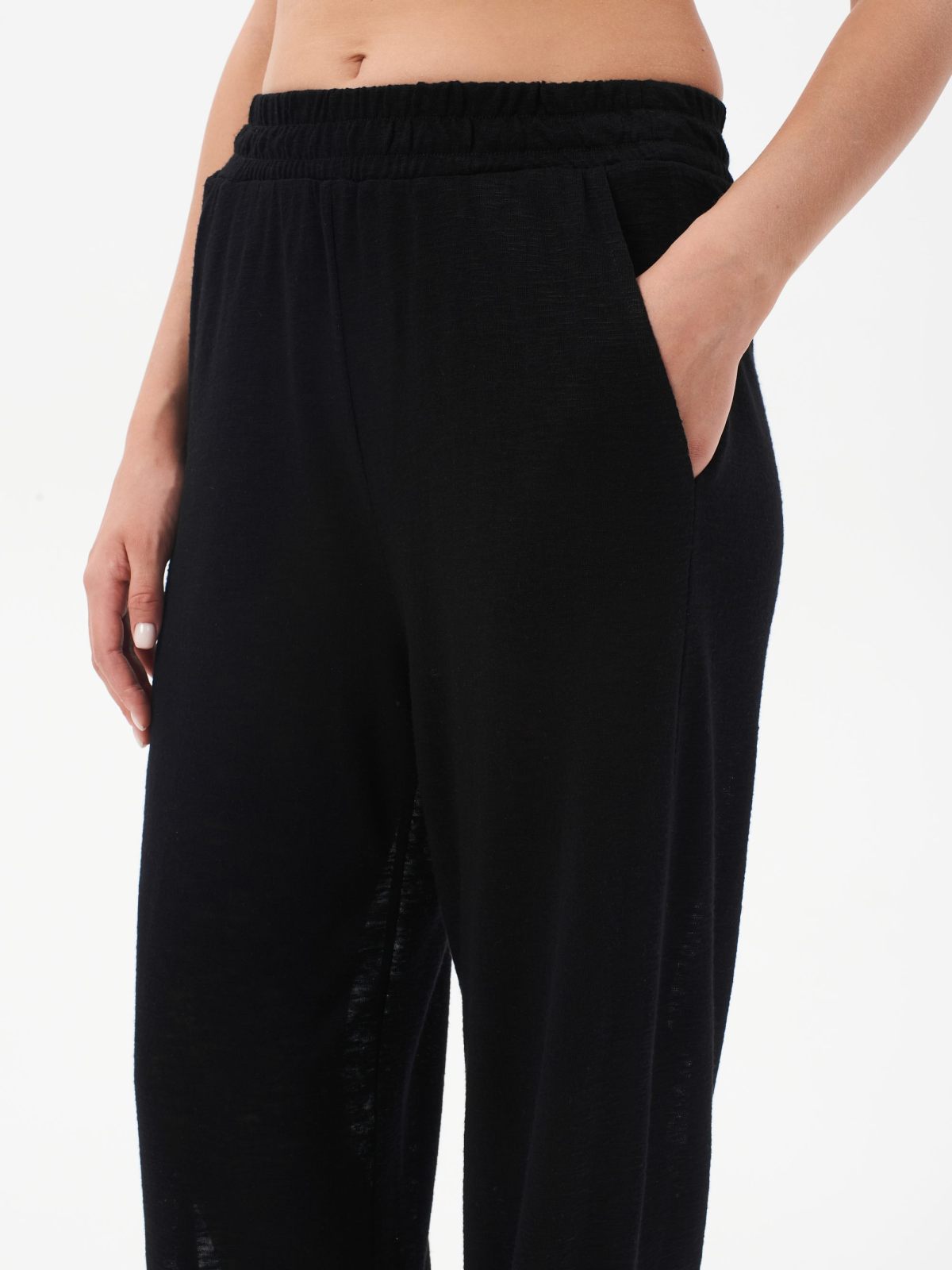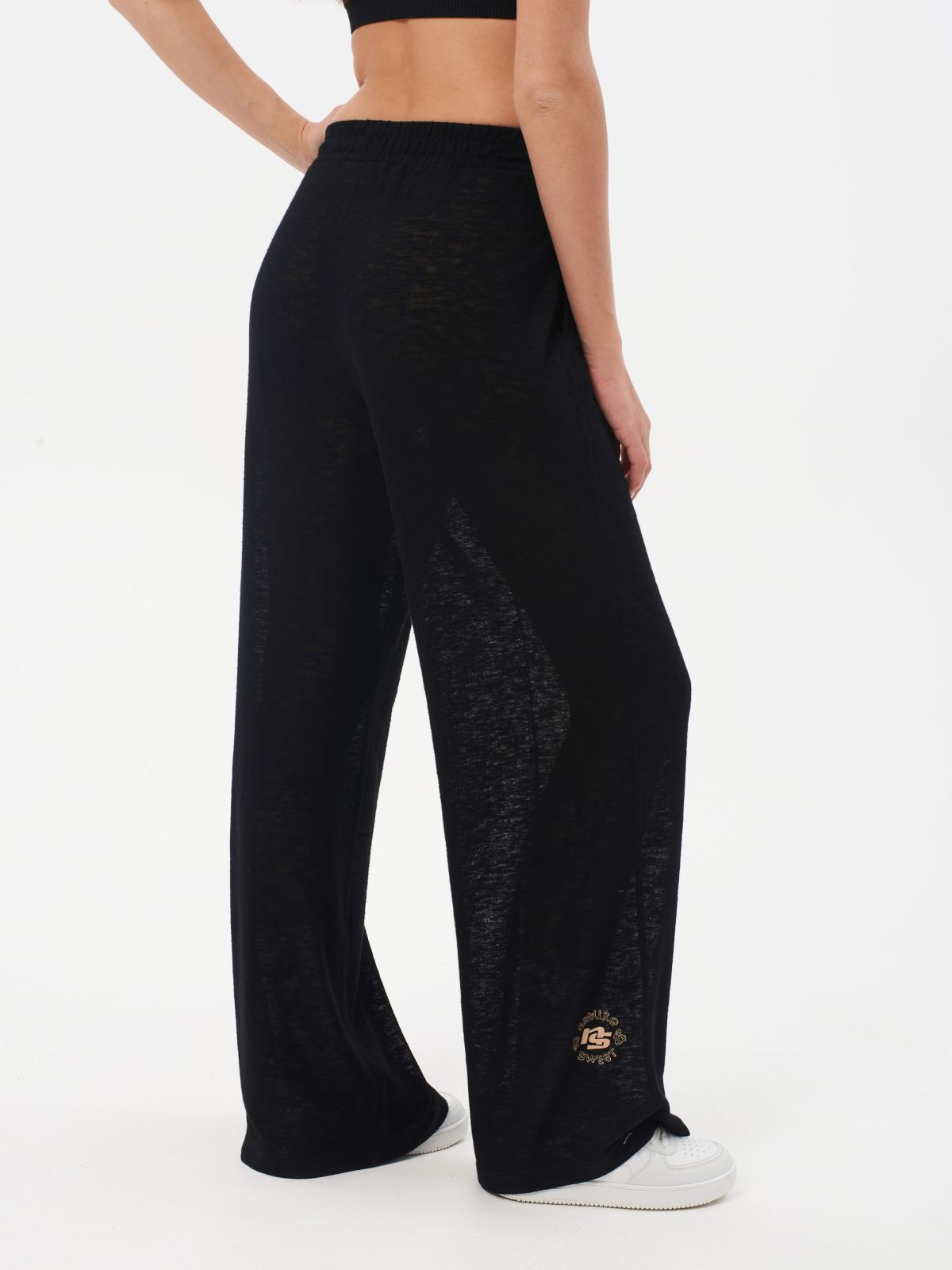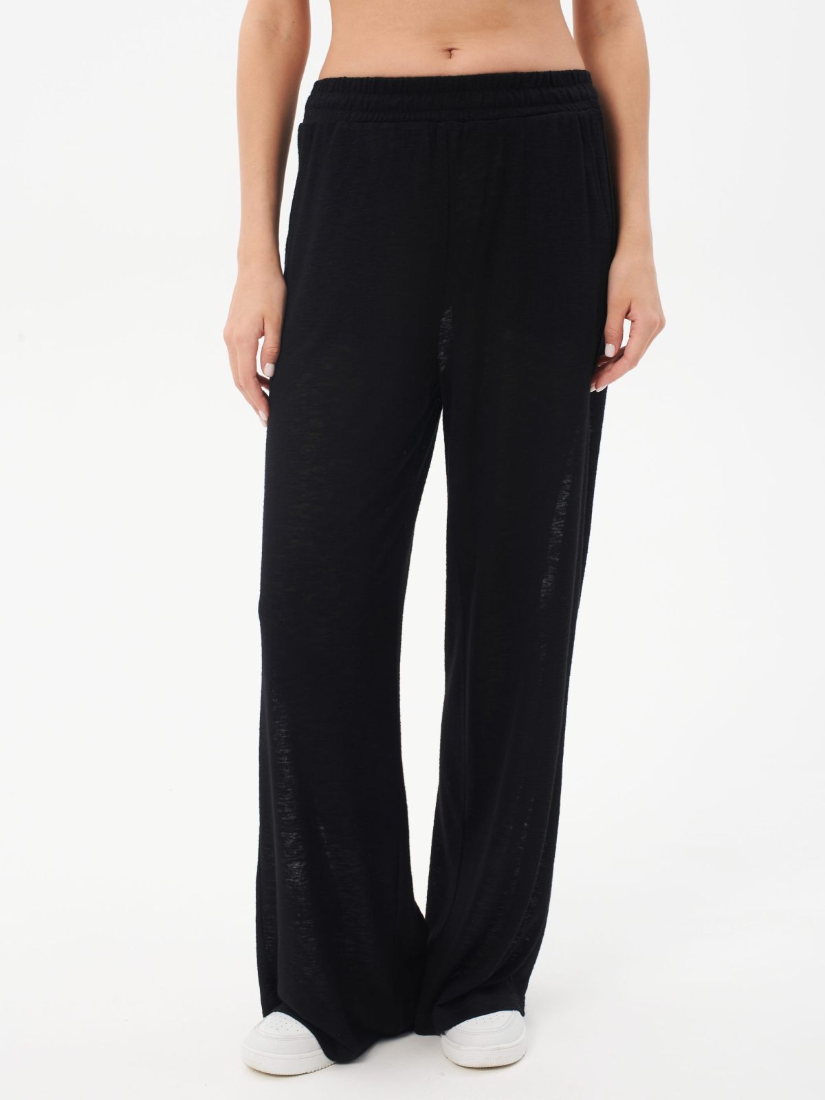 Женские прямые широкие брюки oversize силуэта. В составе 65% вискозы и 35% полиэстера. Материал является главным преимуществом этой модели - брюки легкие, мягкие, практически не ощущаются на теле. Выполнены в классическом черном цвете и отлично подходят для летних образов.