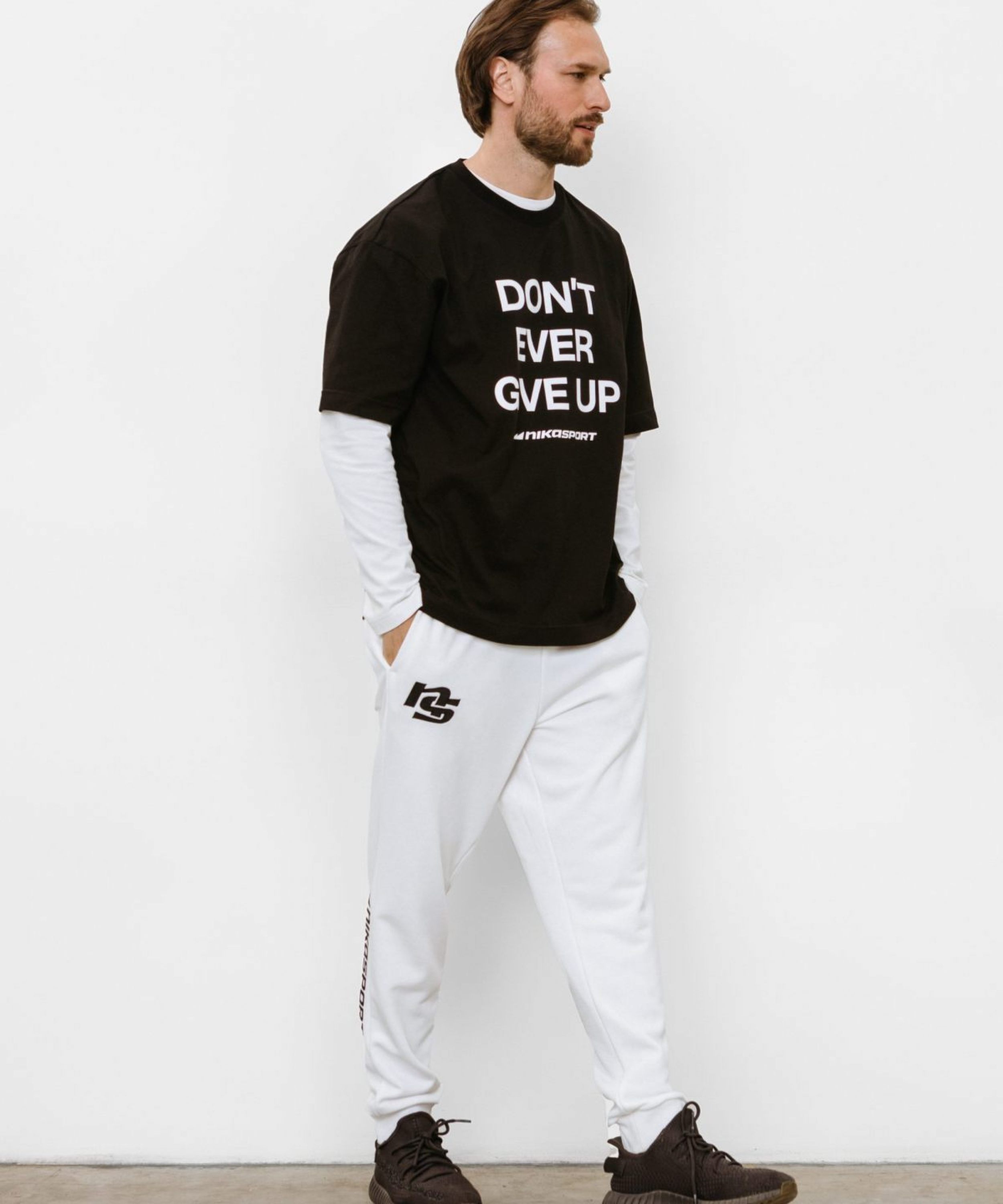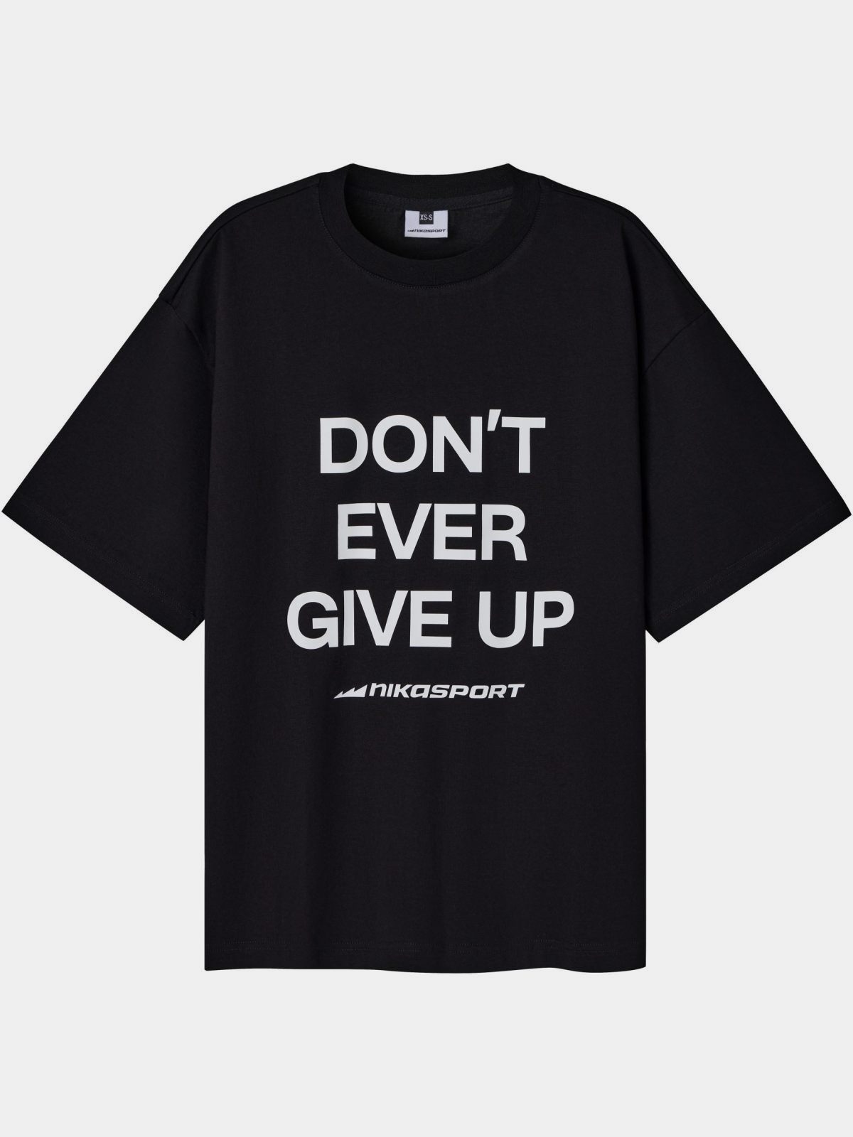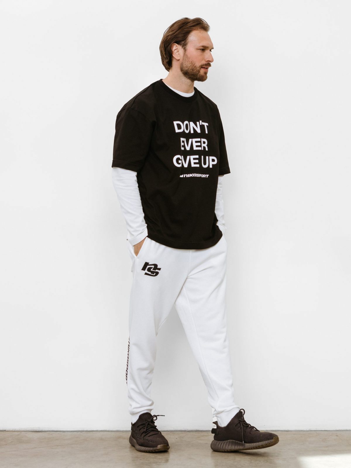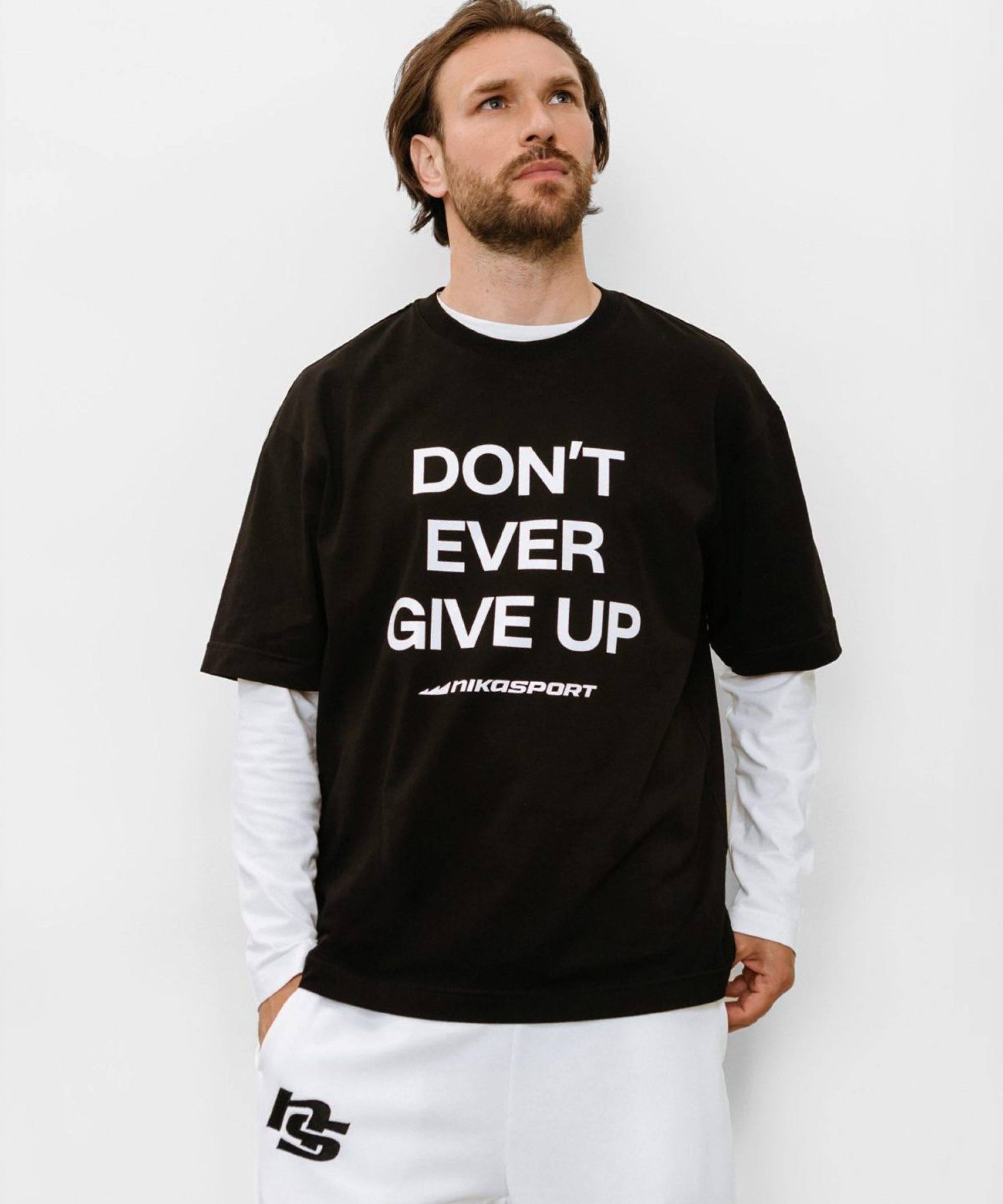 Мужская футболка oversize силуэта. Сделана из 100% плотного хлопка - гипоаллергенного материала, отлично пропускающего воздух. Спущенная линия плеча и большой принт-слоган на спине делают модель более молодежной. Футболка представлена в классическом черном цвете и отлично сочетается как со спортивным, так и с повседневным стилем.