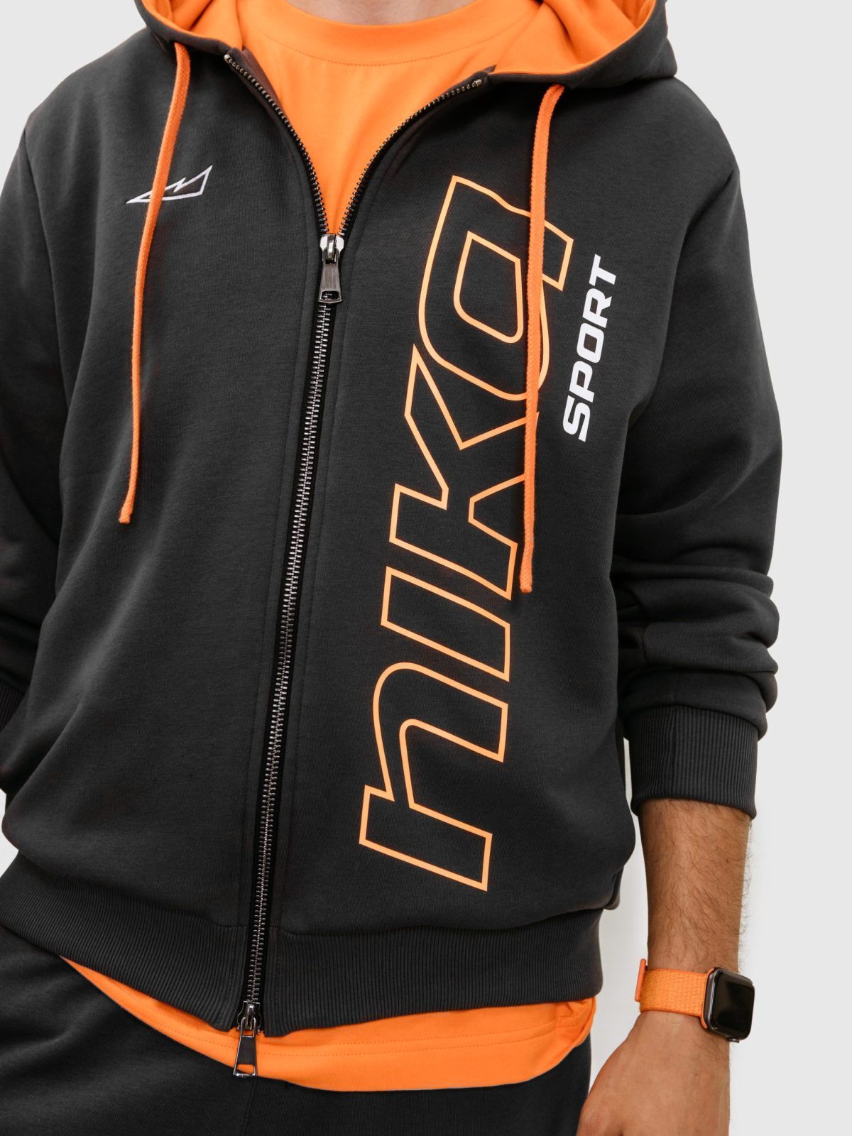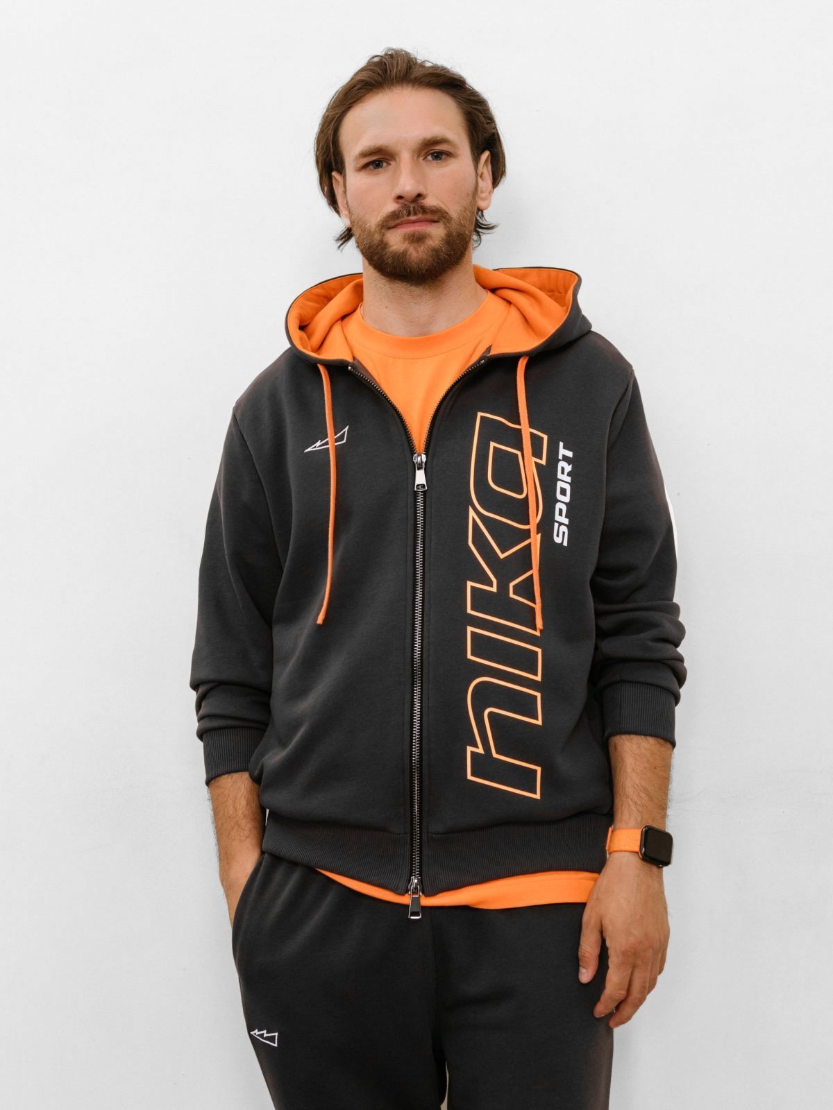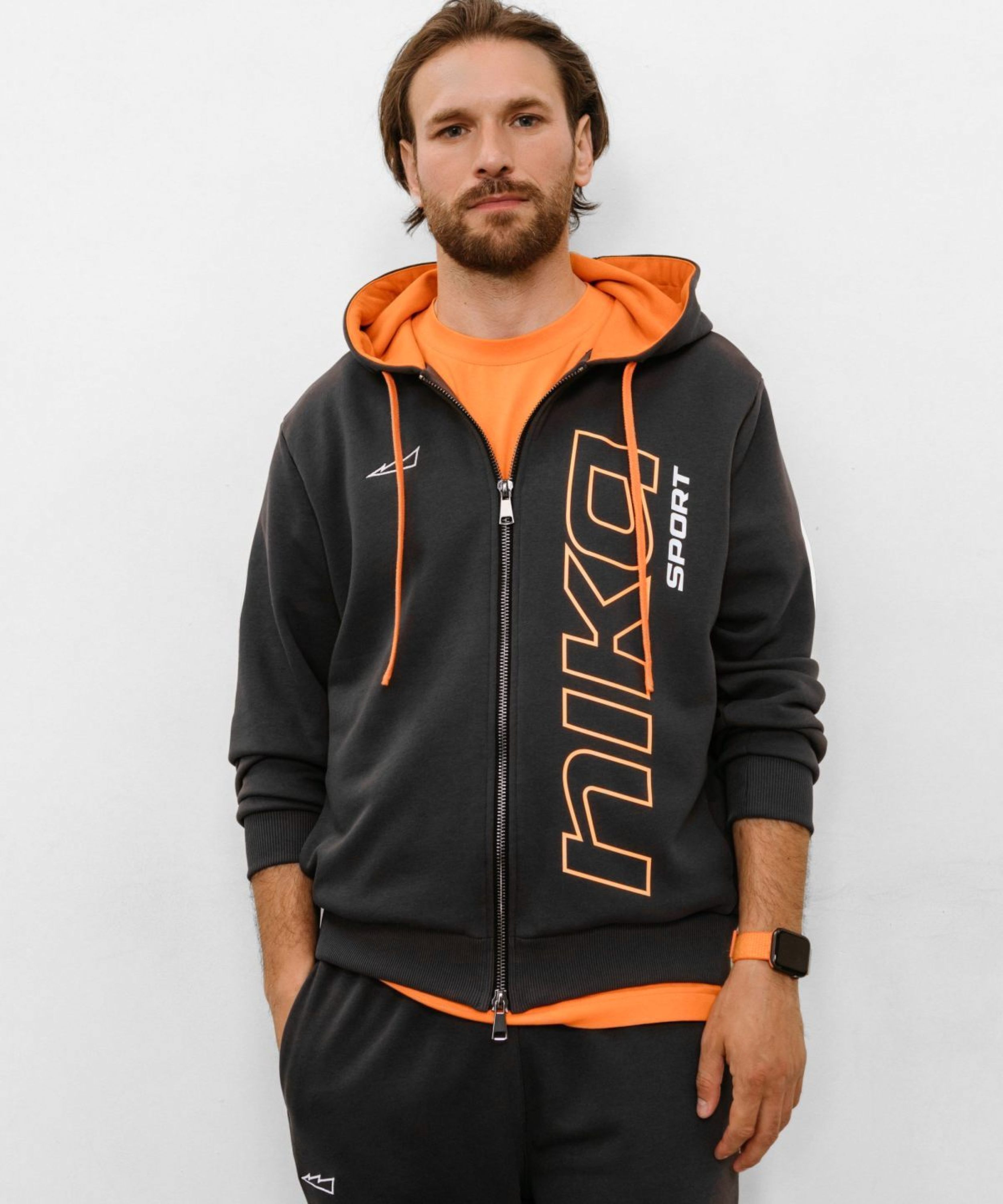 Мужское худи силуэта Regular из лимитированной коллекции B&G. В составе 80% хлопка и 20% полиэстера, что обеспечивает отличную посадку и долговечность изделия. Представлен в 2 цветах: спокойный бежевый и дерзкий темно-серый с оранжевыми акцентами. Дизайнерский лого-принт на груди, капюшон для защиты от непогоды с контрастной подкладкой и два глубоких кармана делают худи незаменимой и стильной вещью вашего повседневного гардероба.