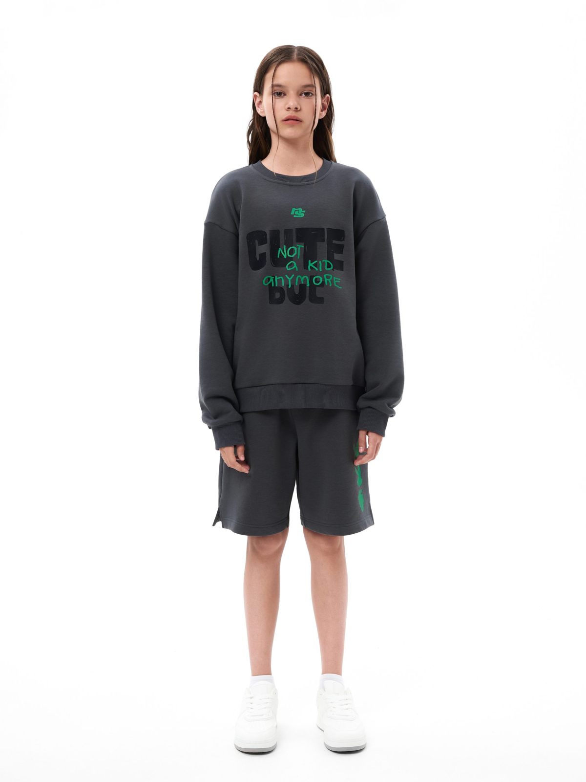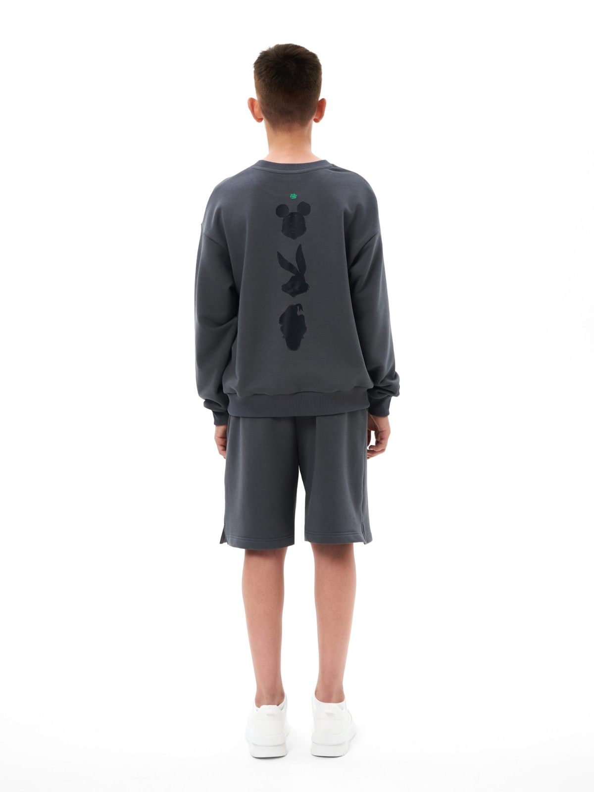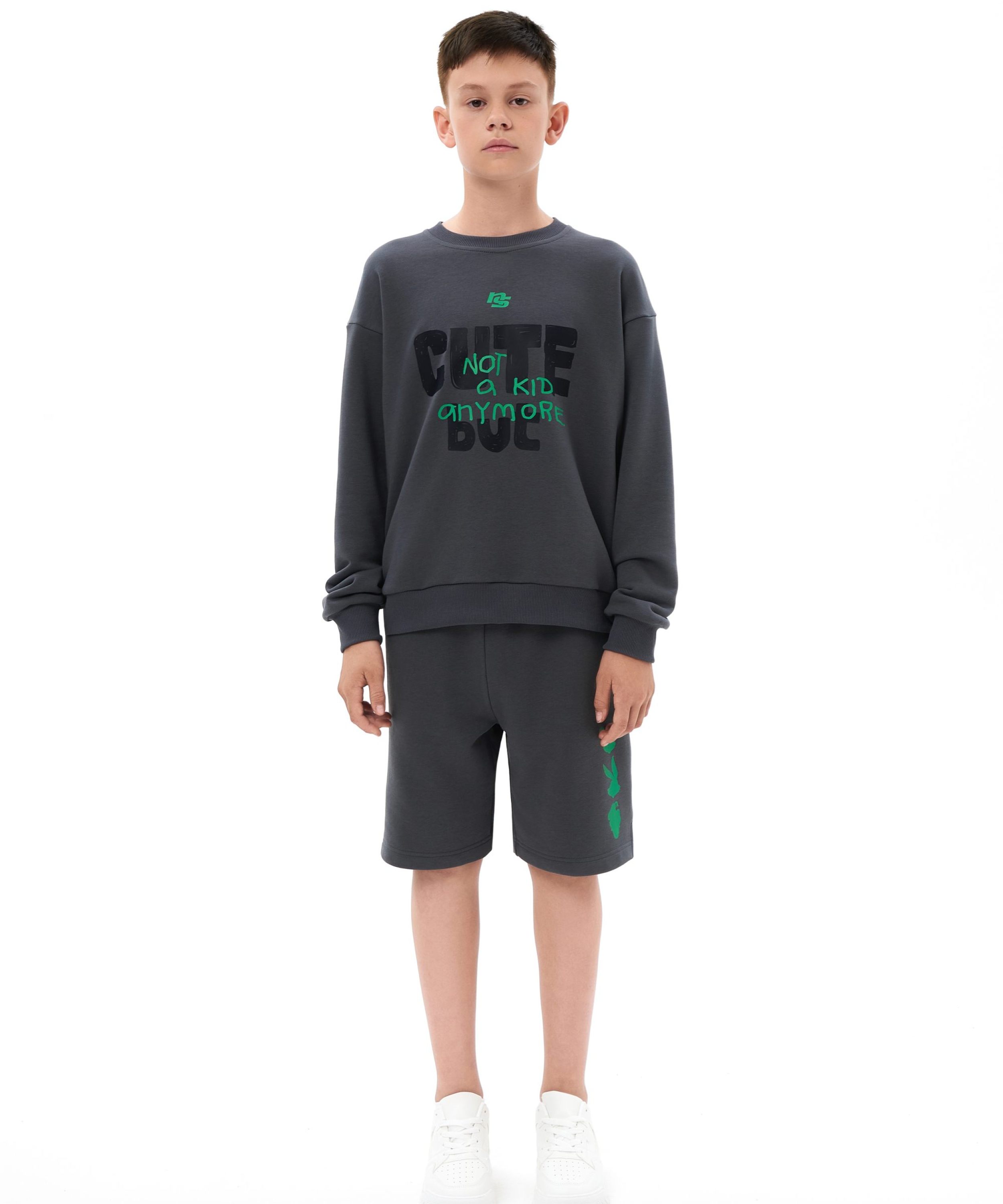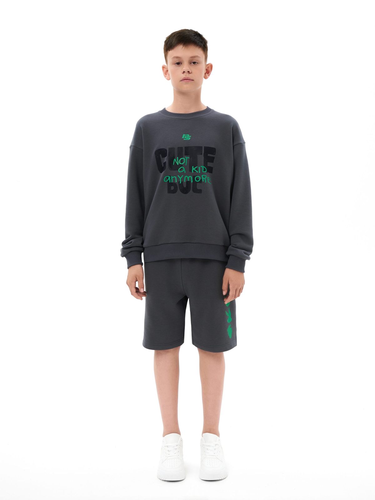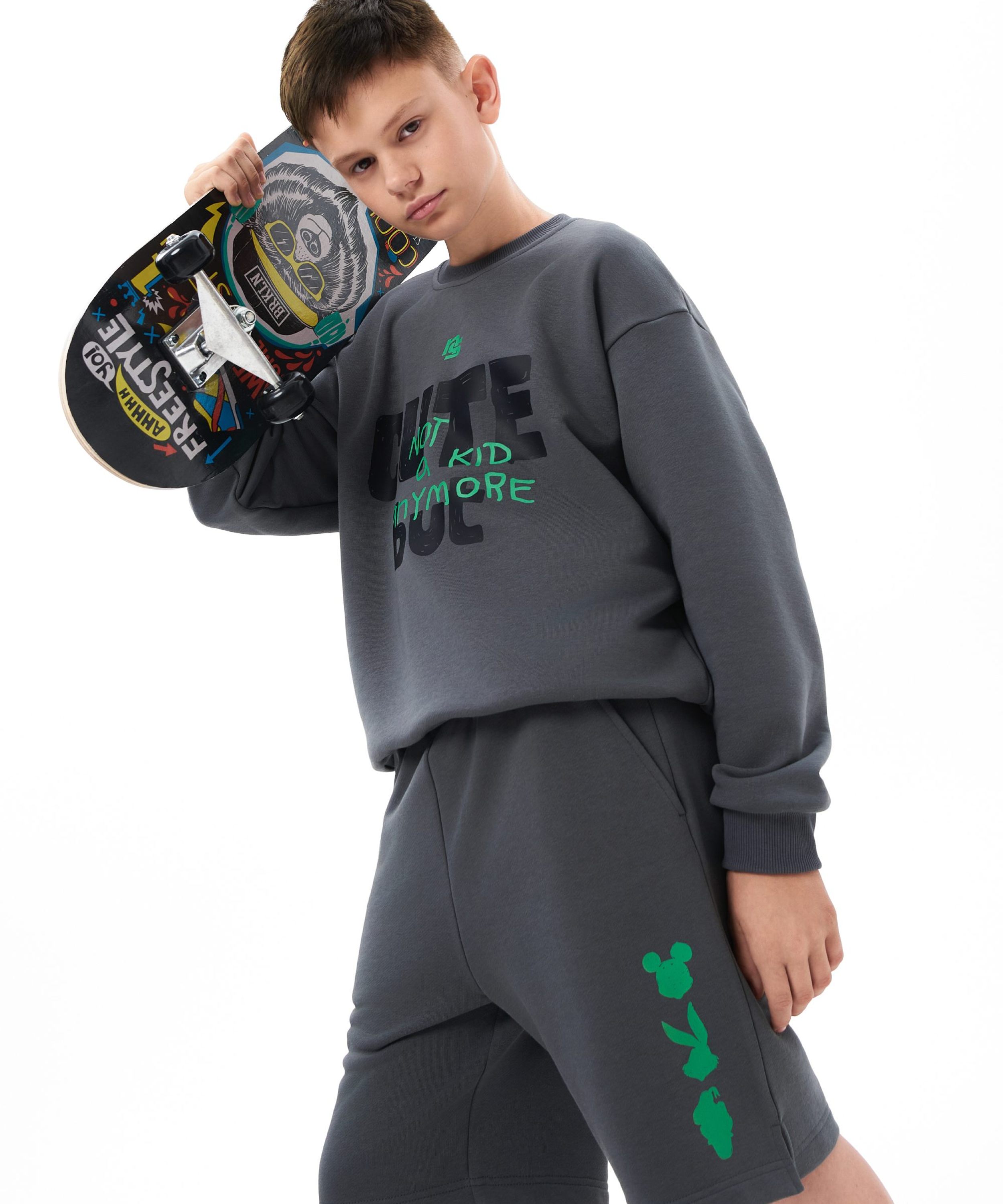 Детский свишот прямого силуэта из коллекции Naka. Выполнен из футера 3х-нитки, в составе которого 92% хлопка и 8% эластана - гипоаллергенного, пропускающего воздух, мягкого и плотного материала. На груди и спине расположены большие принты с дизайнерскими слоганами и символами капсулы "Not A Kid Anymore" - любимыми детскими персонажами для тех, кто уже не ребенок! Создай свой стильный образ в ярком синем или глубоком графитовом цвете!