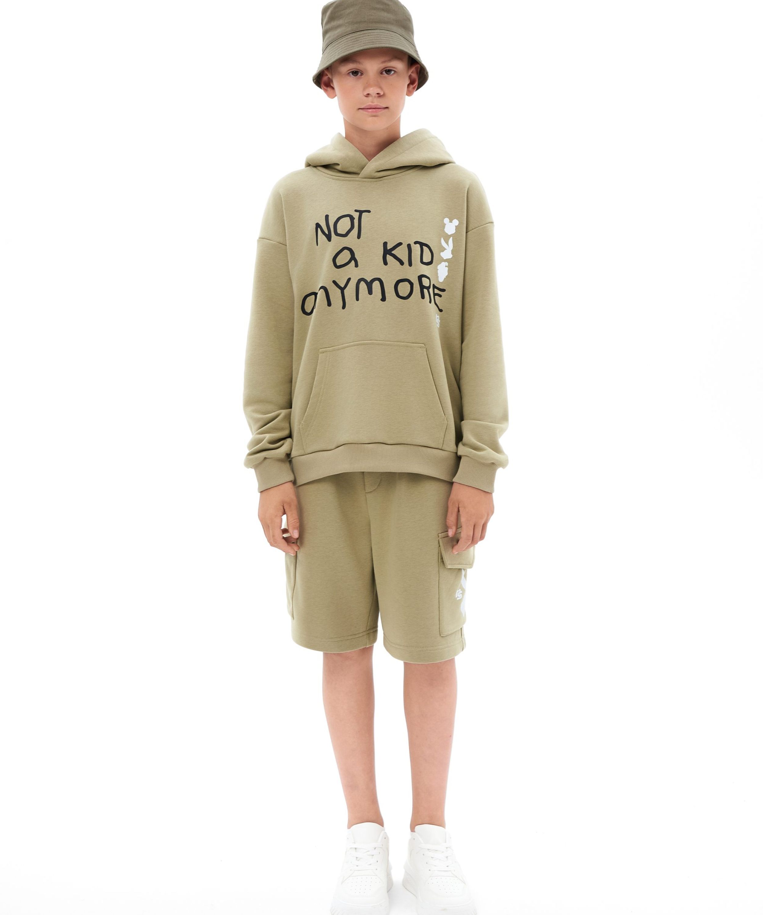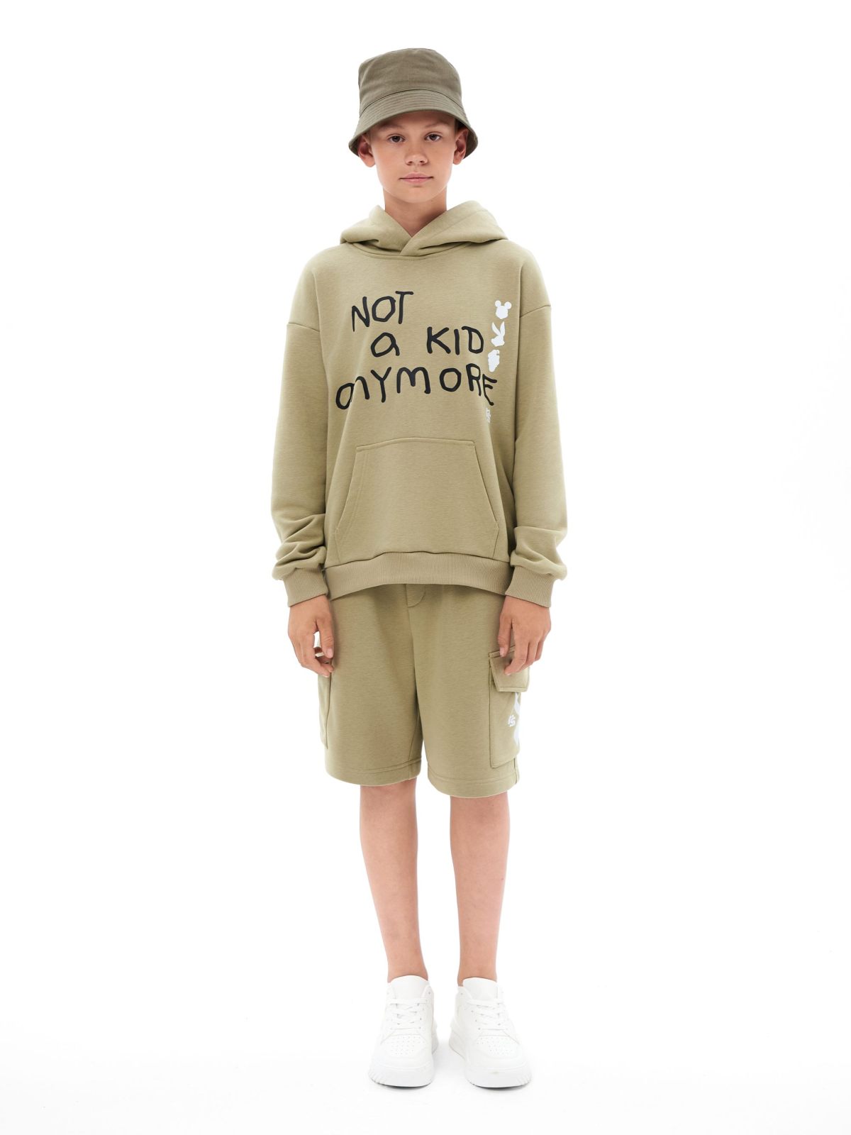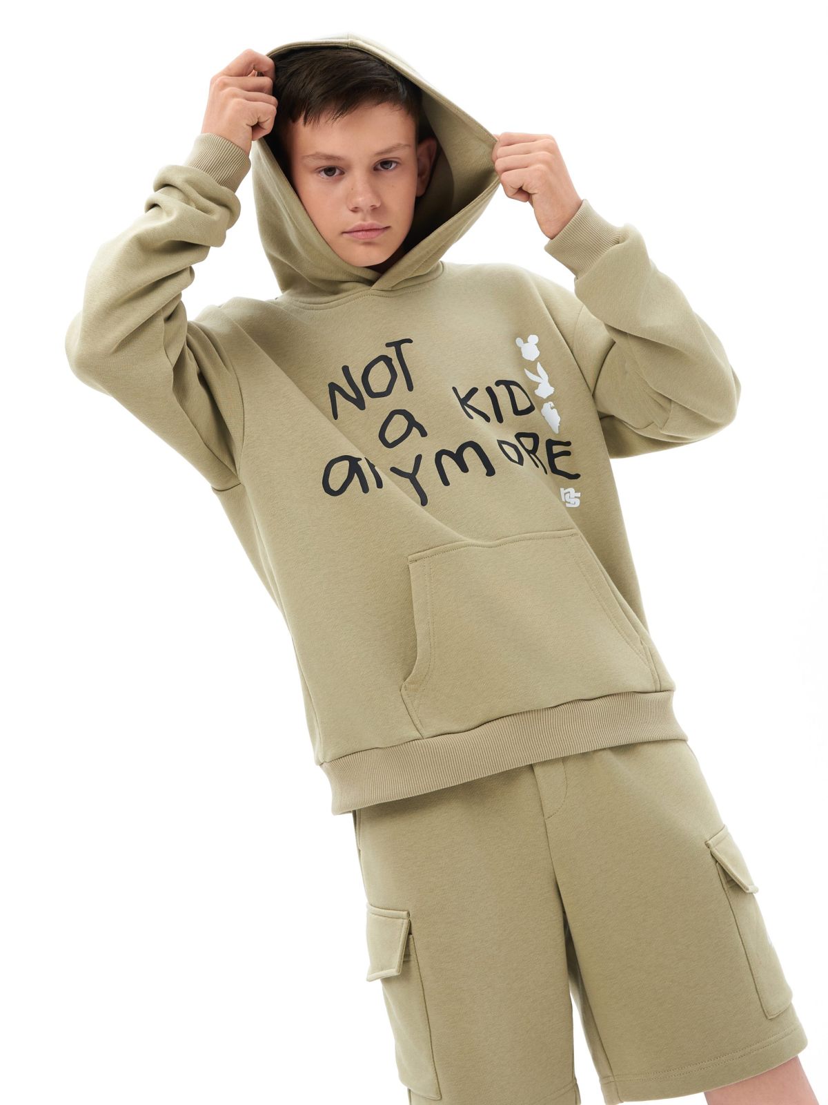 Детское худи прямого силуэта из коллекции Naka. Выполнен из футера 3х-нитки, в составе которого 92% хлопка и 8% эластана - гипоаллергенного, пропускающего воздух, мягкого и плотного материала. На груди расположен большой принт с дизайнерским слоганом, логотипом и символами капсулы "Not A Kid Anymore" - любимыми детскими персонажами для тех, кто уже не ребенок! Особенностью модели являются карман-кенгуру для хранения личных вещей и глубокий капюшон для защиты от непогоды. Создай свой стильный образ в трендовом оливковом цвете!
