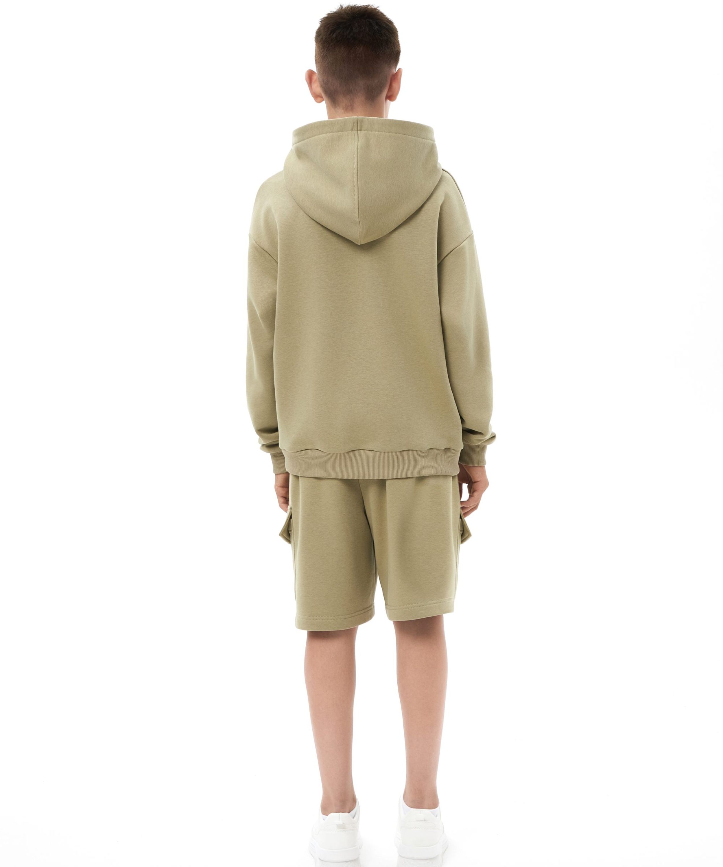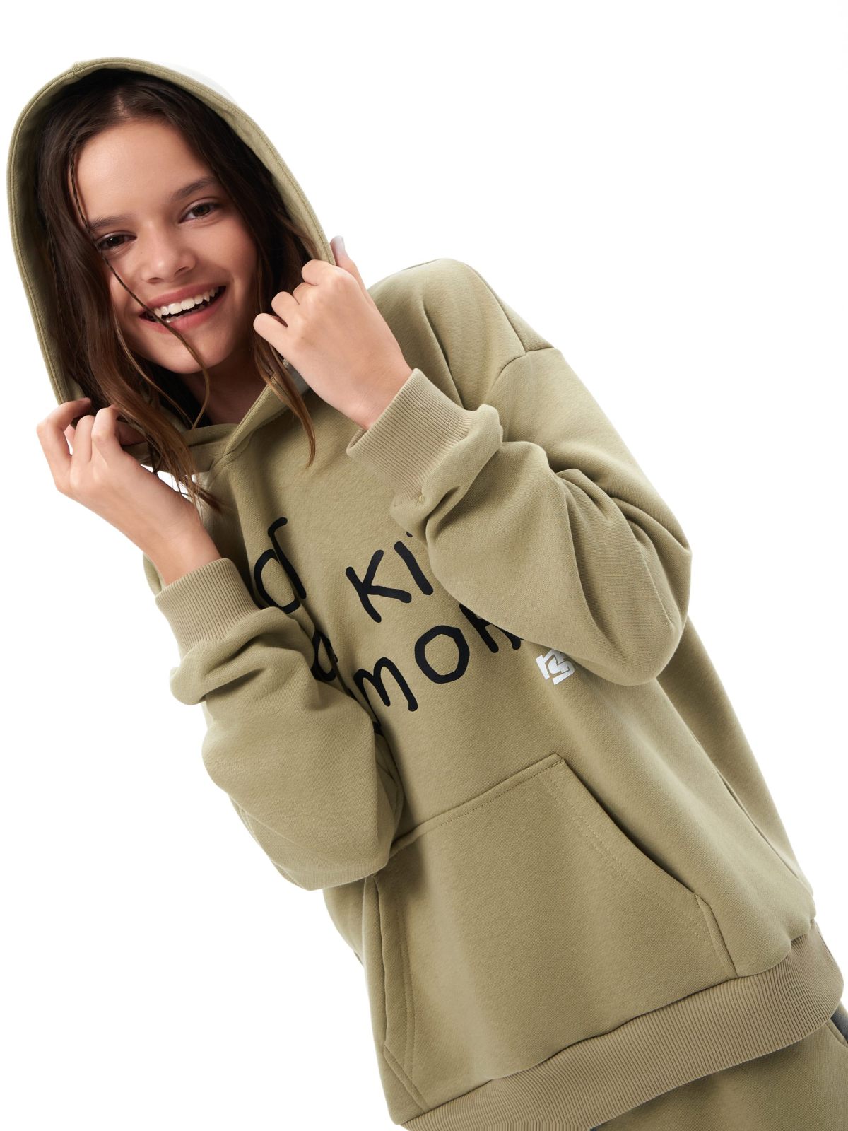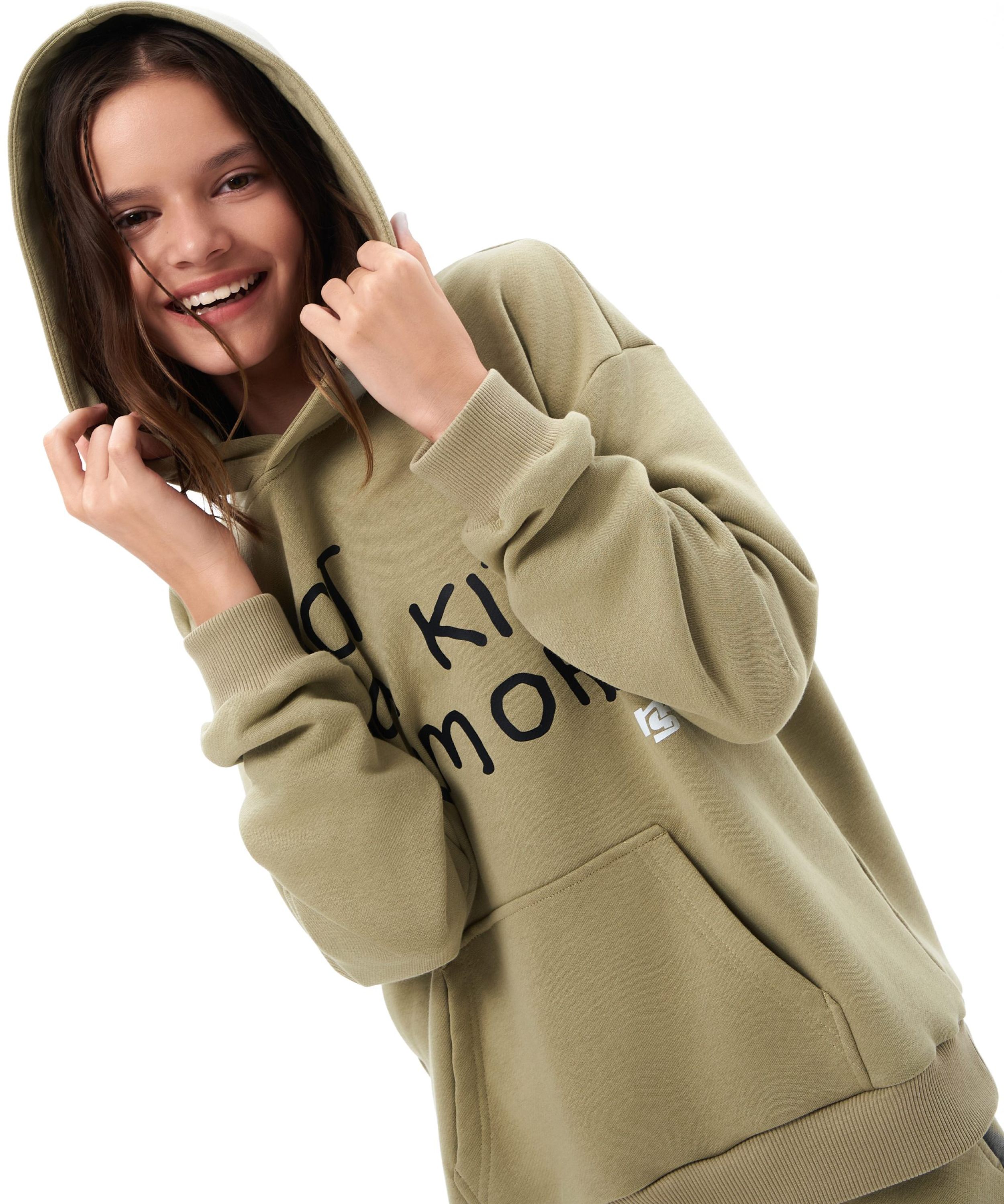 Детское худи прямого силуэта из коллекции Naka. Выполнен из футера 3х-нитки, в составе которого 92% хлопка и 8% эластана - гипоаллергенного, пропускающего воздух, мягкого и плотного материала. На груди расположен большой принт с дизайнерским слоганом, логотипом и символами капсулы "Not A Kid Anymore" - любимыми детскими персонажами для тех, кто уже не ребенок! Особенностью модели являются карман-кенгуру для хранения личных вещей и глубокий капюшон для защиты от непогоды. Создай свой стильный образ в трендовом оливковом цвете!